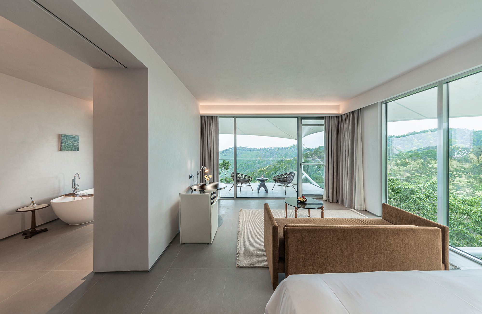 设计选材:建筑细节的沿用表达,是对这片土地的亲近和依赖,根植于当地自然原本的状态,设计师关注协调建筑与场地的关系,将周边景色尽收眼底,选用质朴、自然的材料融入于环境。漫步竹林,逐渐步入茶海深处,沿着蜿蜒的山路,在斑驳的光影以及风、树、叶的摩擦声中产生意犹未尽之感。将这切身的感受融入设计之中,每一间客房的名字也由此得来。