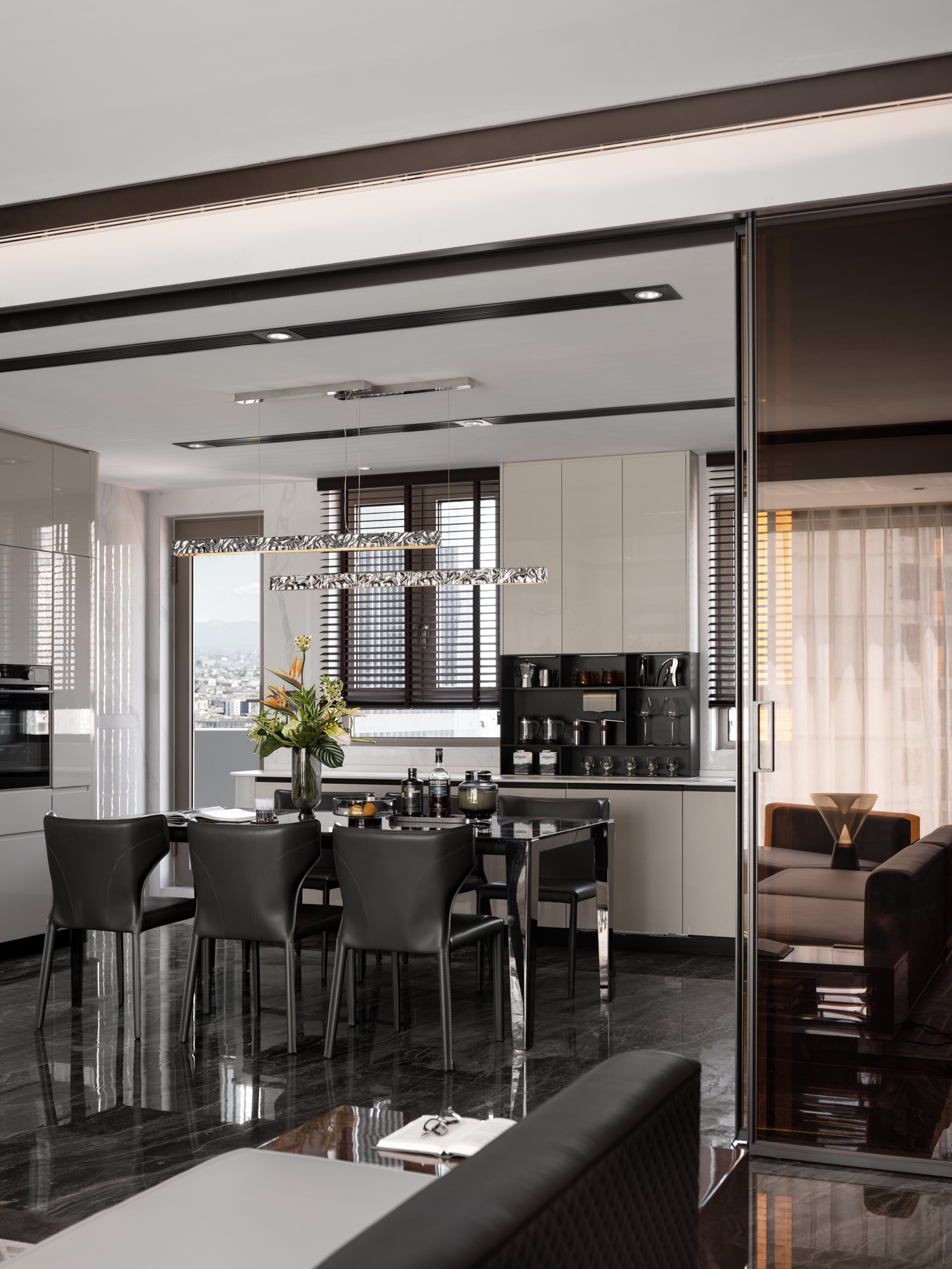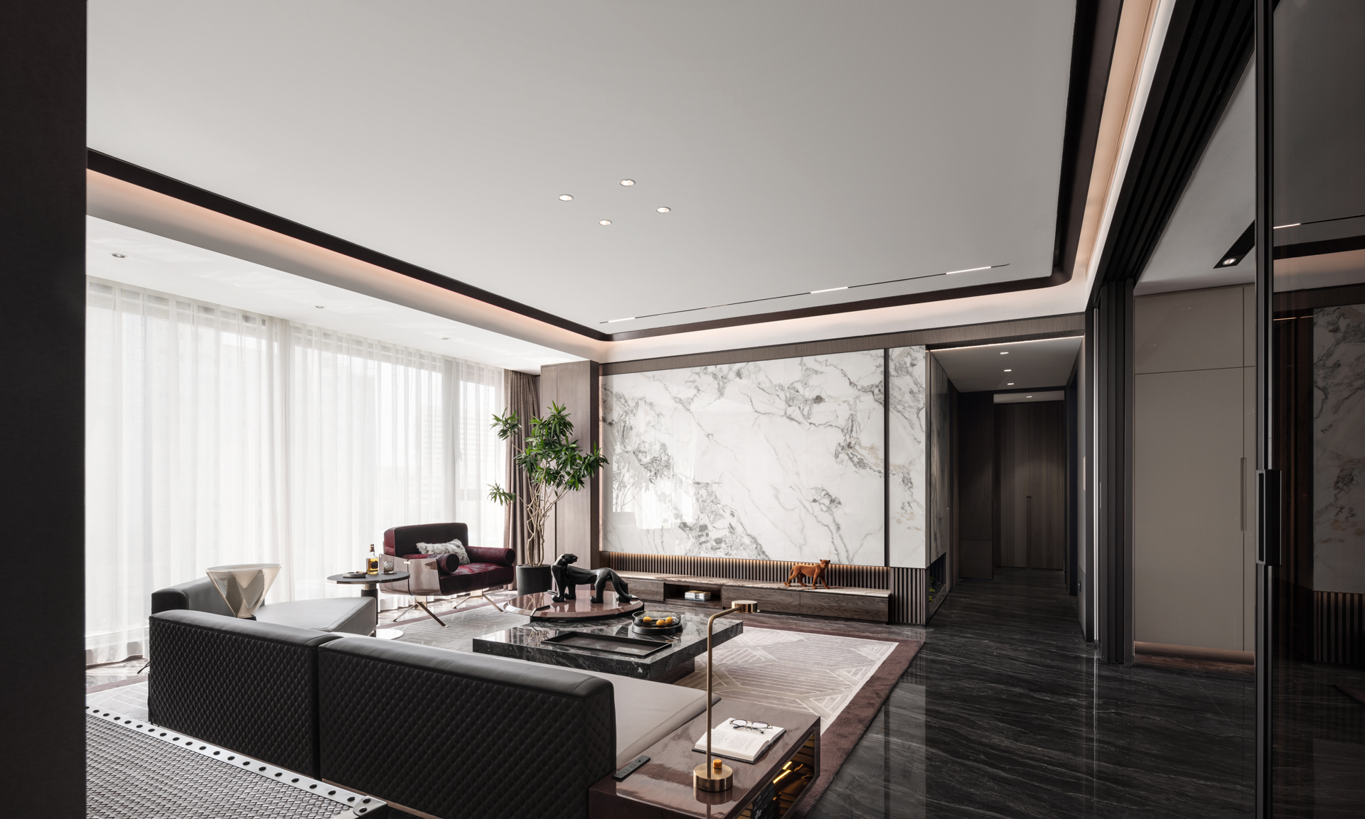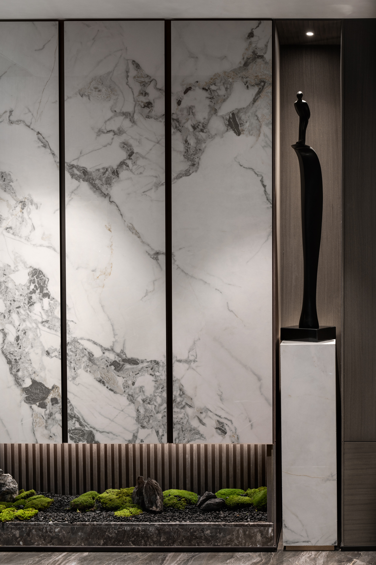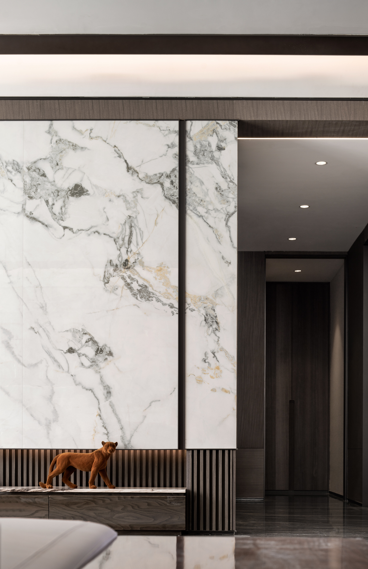 用户体验:轻奢的“藏”,通体的柜身,仿佛威武的侍者,于客厅,于餐厅,于空 间的细分空间处,引入超强收纳理念,细化至收纳品类、位置、面积等等,做到全方位为业主打造全新收纳概念,例如,即使一枚钥匙,都有其专属位置的藏身系统。以悠游峦峰之意的岩板花纹作为门厅处 订制柜身的轮廓,垂直面便是客厅的主背景,如书脊与封面的创意, “L”形的画面感藏着设计师打破常规的巧思之举。