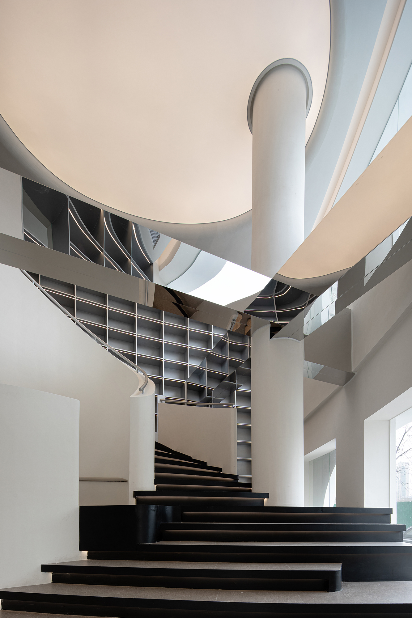 空间布局:一层内部空间的形式以展示功能为导向,引入多种形式的展示道具,全方位带给参观者有关白茶的多元文化体验。在此糅合集团文化及各类白茶产品展示,作为一个向参观者无声表达白茶文化的聚焦空间,设计采用多重展示方式输出安吉的白茶文化,让来访者慢下脚步,认真感受“这片叶子”的步步发展。旋转而上的楼梯和体块交错的结构支架,通过当代感的线条纵横穿插,延伸到空间顶端,为空间创造视觉张力。 二层为体验者提供安静舒适的品茶空间。位于两侧走道环形动线之中的茶室,各为一隅,透过门隙,微光与人影草木交叠,互为景致,意境悠远。竹影,曳而无声,这般自然光景尤为难得。朝临日光,暮着月色,草木生息,郁郁葱葱,一动一静间,让精神回归自然。