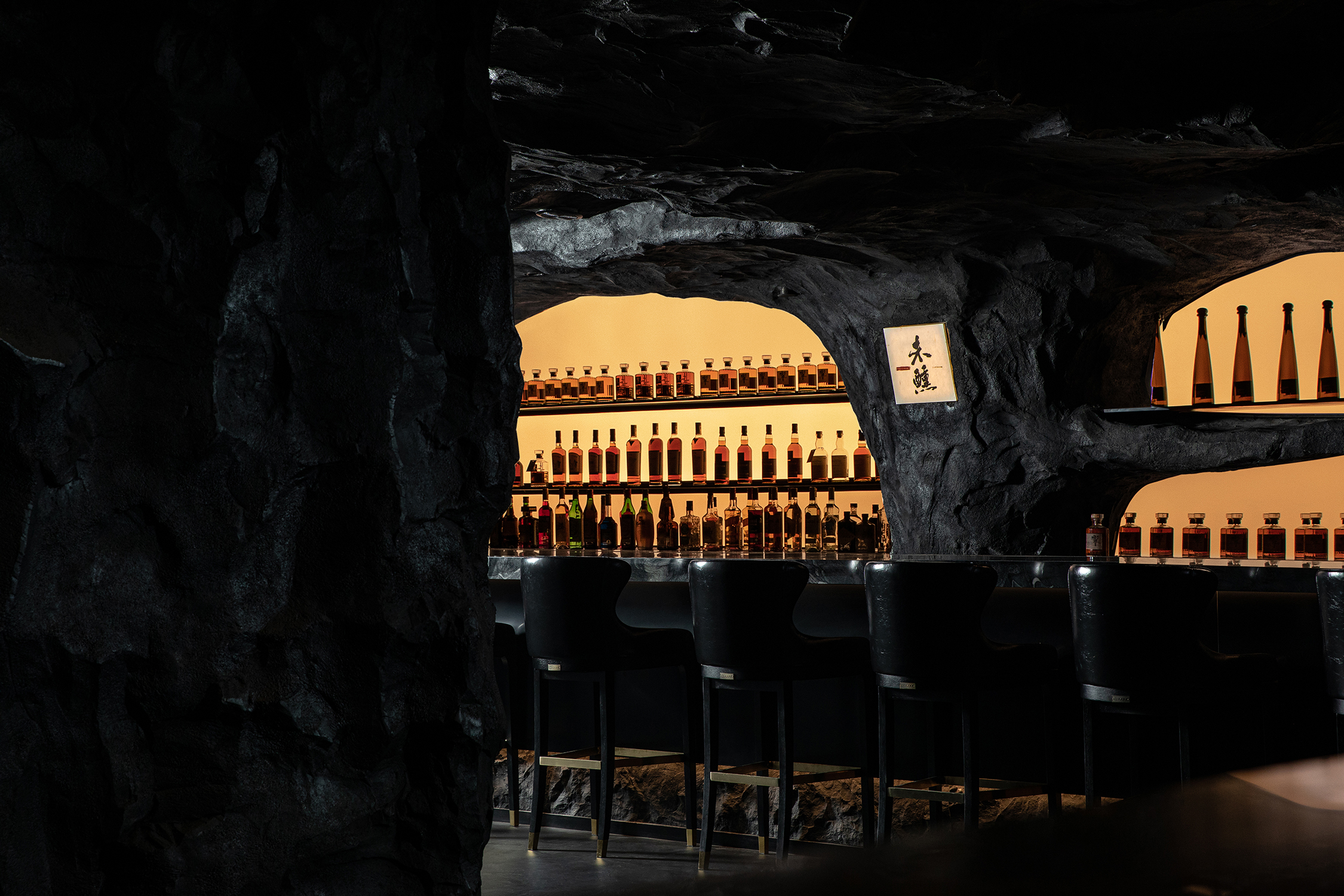 空间布局:强烈的雕塑感,放大感官体验,以肌理变化赋予空间感知,不规则立柱似山石间自然分割破裂而出,模糊空间边界,成为不同场景功能的重要组成。物理形式的起伏,增强画面张力的同时丰富视觉层次,沉于幽深之中聚焦视线。黑,似微醺时,为内心覆上一层面纱,在其中隐藏自我,获得自由。利用光影营造迷离梦境,此起彼伏的灯光释放着情绪,似江潮涌动,弥散在整个空间之中,浸润着每一个孤独又有趣的灵魂。糅合极致纯粹的威士忌,浓淡恰好至微醺的氛围,抛却尘嚣,隐匿于此。