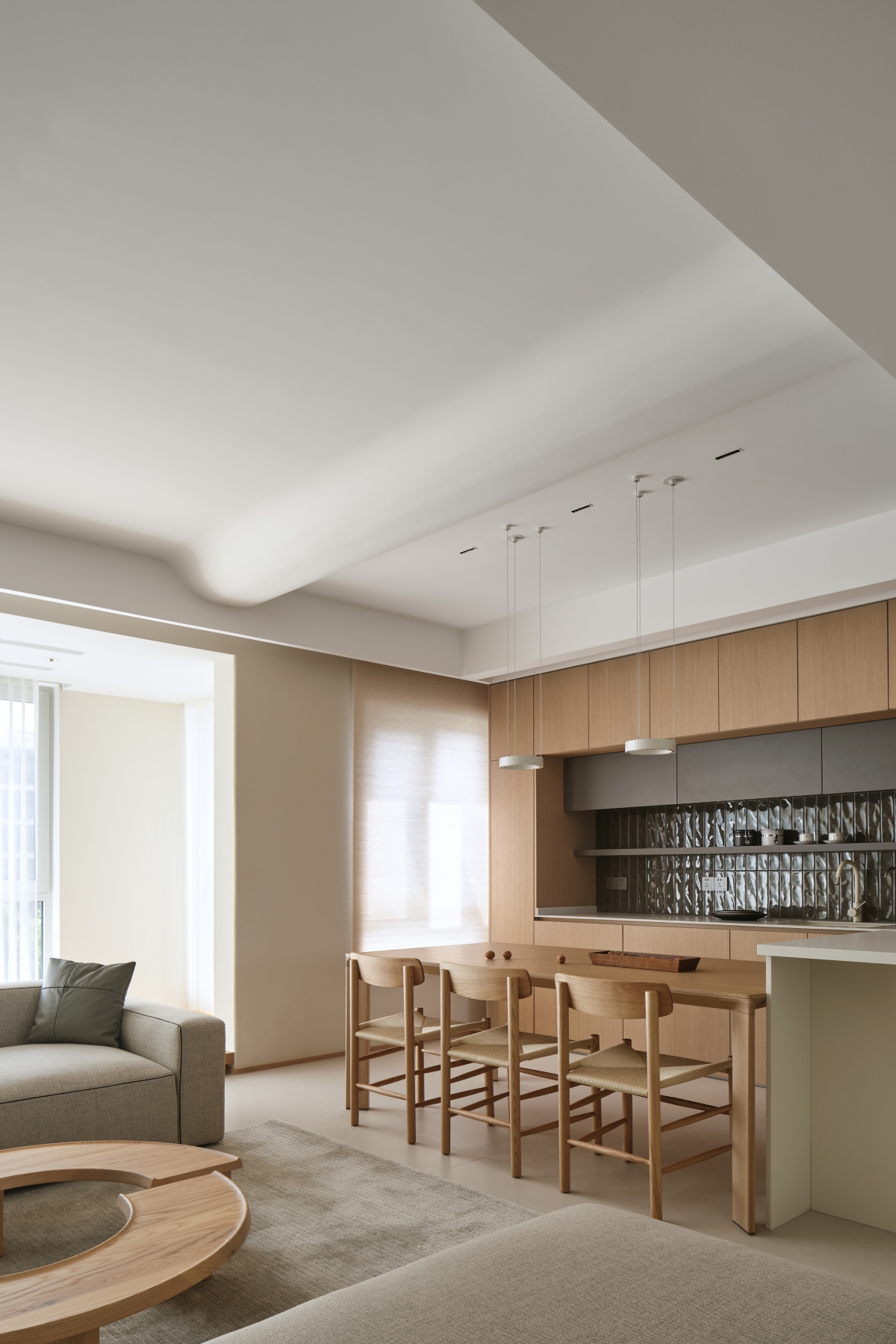 餐厅、吧台、西厨一体的设计,彰显了颜值和功能的最佳平衡。温润的木质,让空间生动了起来,抚慰了家人每天的疲惫。享用美味的一日三餐,与友人品茗,为家人磨一杯咖啡,为自己调一杯酒,惬意无比。