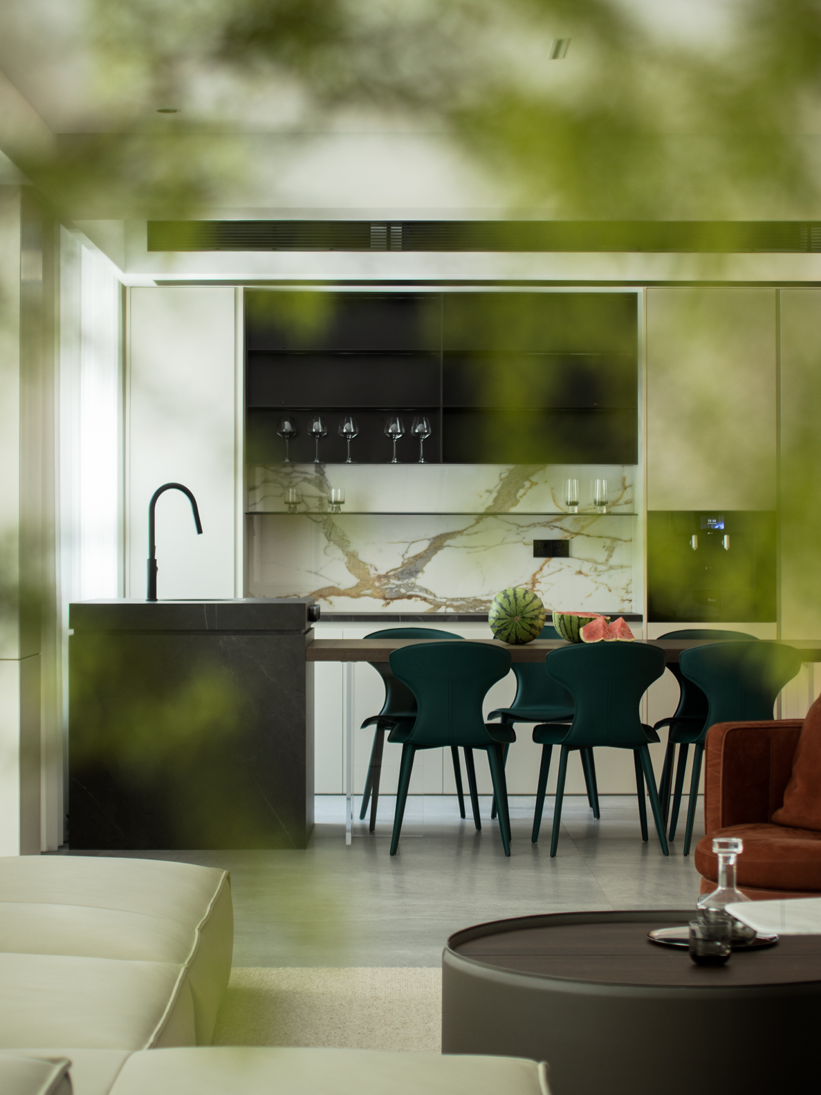 项目定位:两套打通做大开间,将客厅、餐厅、西厨、书房连通