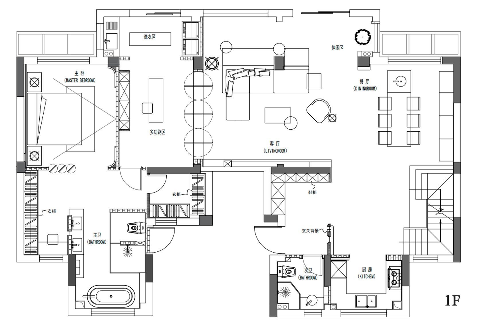 空间布局:Ⅰ. 一层两套打通做大开间,将客厅、餐厅、西厨、书房连通;