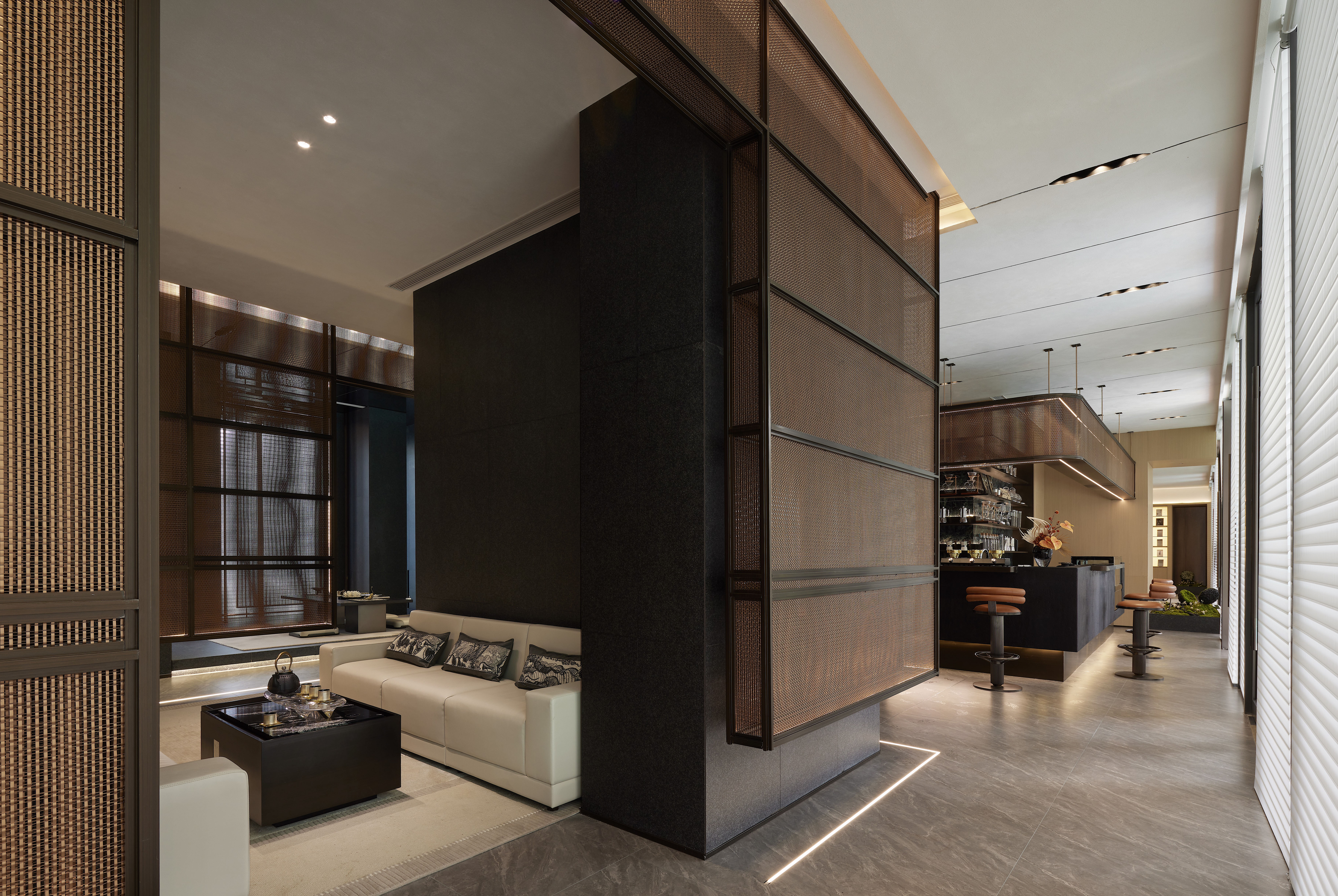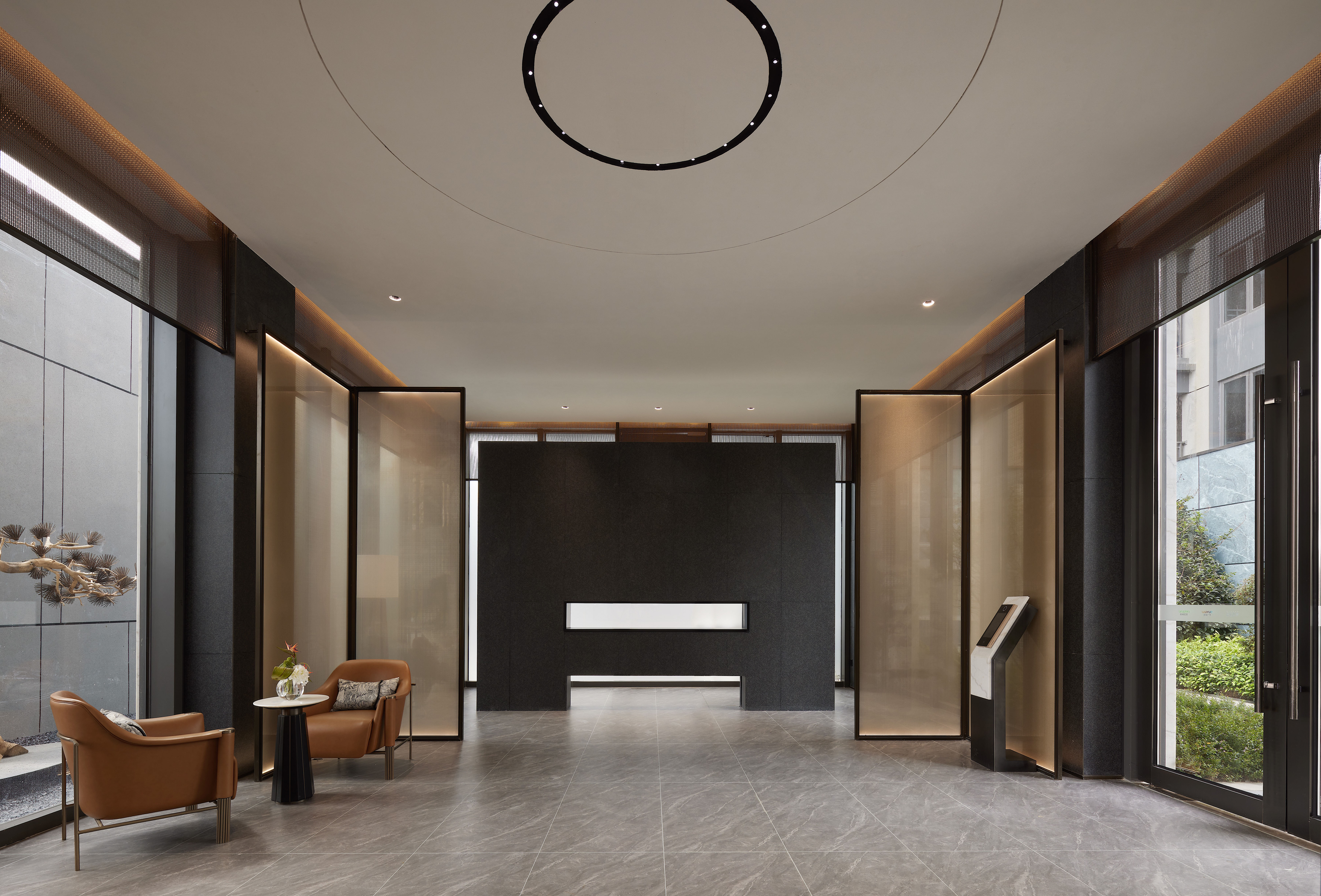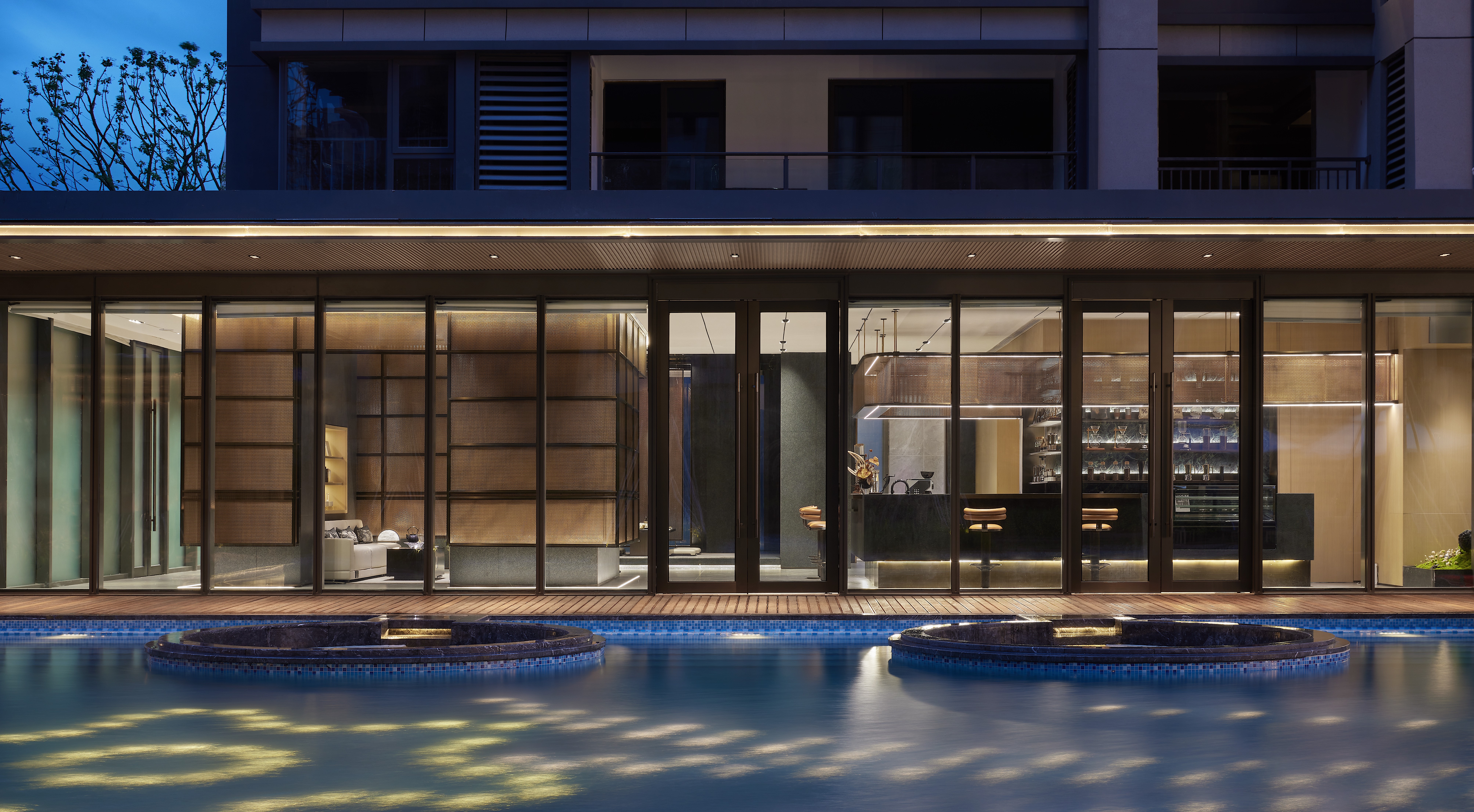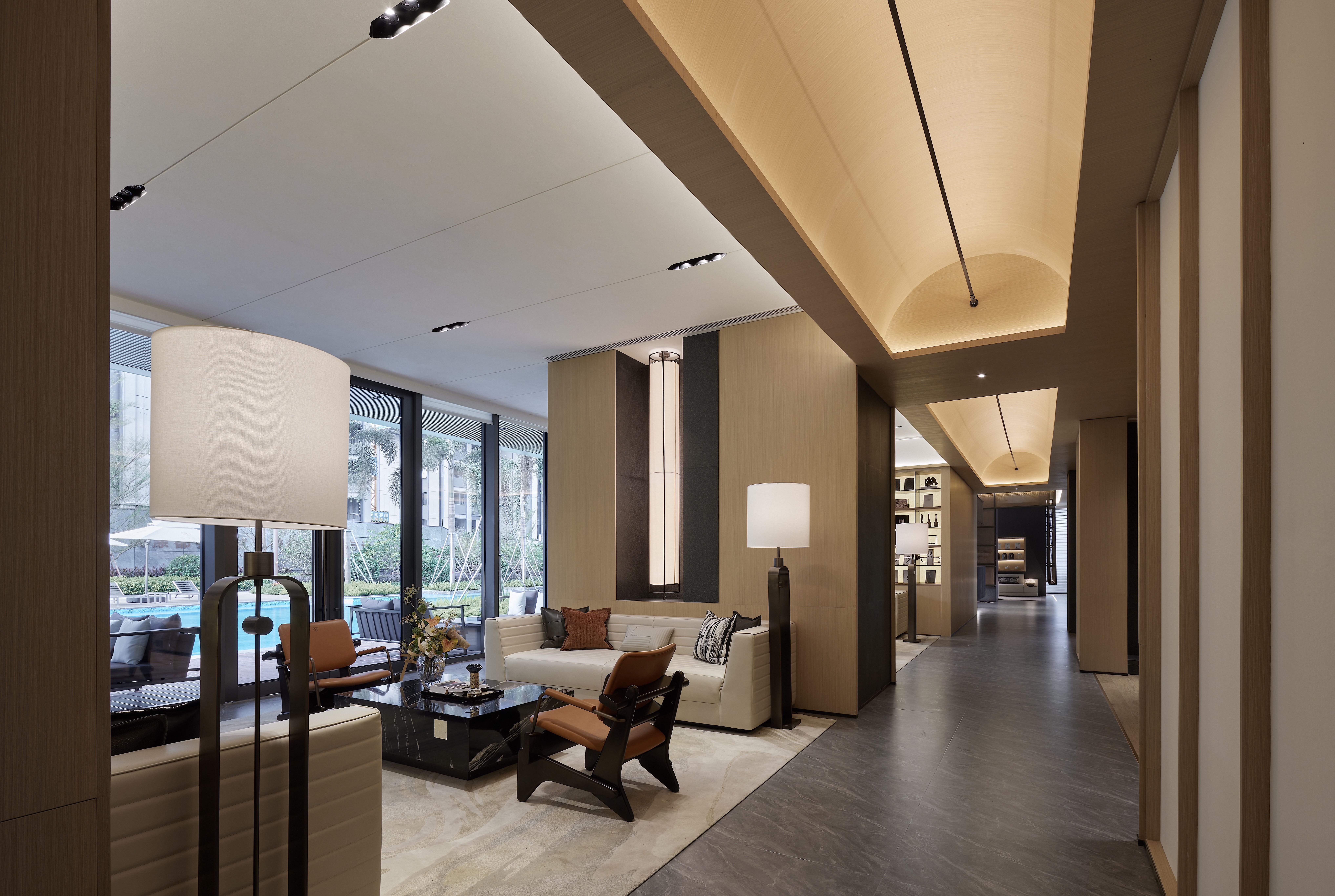 空间意境:踏入社区门厅的一刻,“城央繁华·度假漫生活”之感从心中浮现,映衬在深色仿石材地面上的金属屏风,搭配暖色的氛围灯带,更具归家仪式感。随即步入会所,书吧、水吧、亲子活动、休闲等主题一应俱全,整体的会所空间呈“L”型设置,将外部的景观水池以落地玻璃的方式更好的呈现在会所视线之内,搭配周围的景观绿植,“度假漫生活的主题贯穿整体。