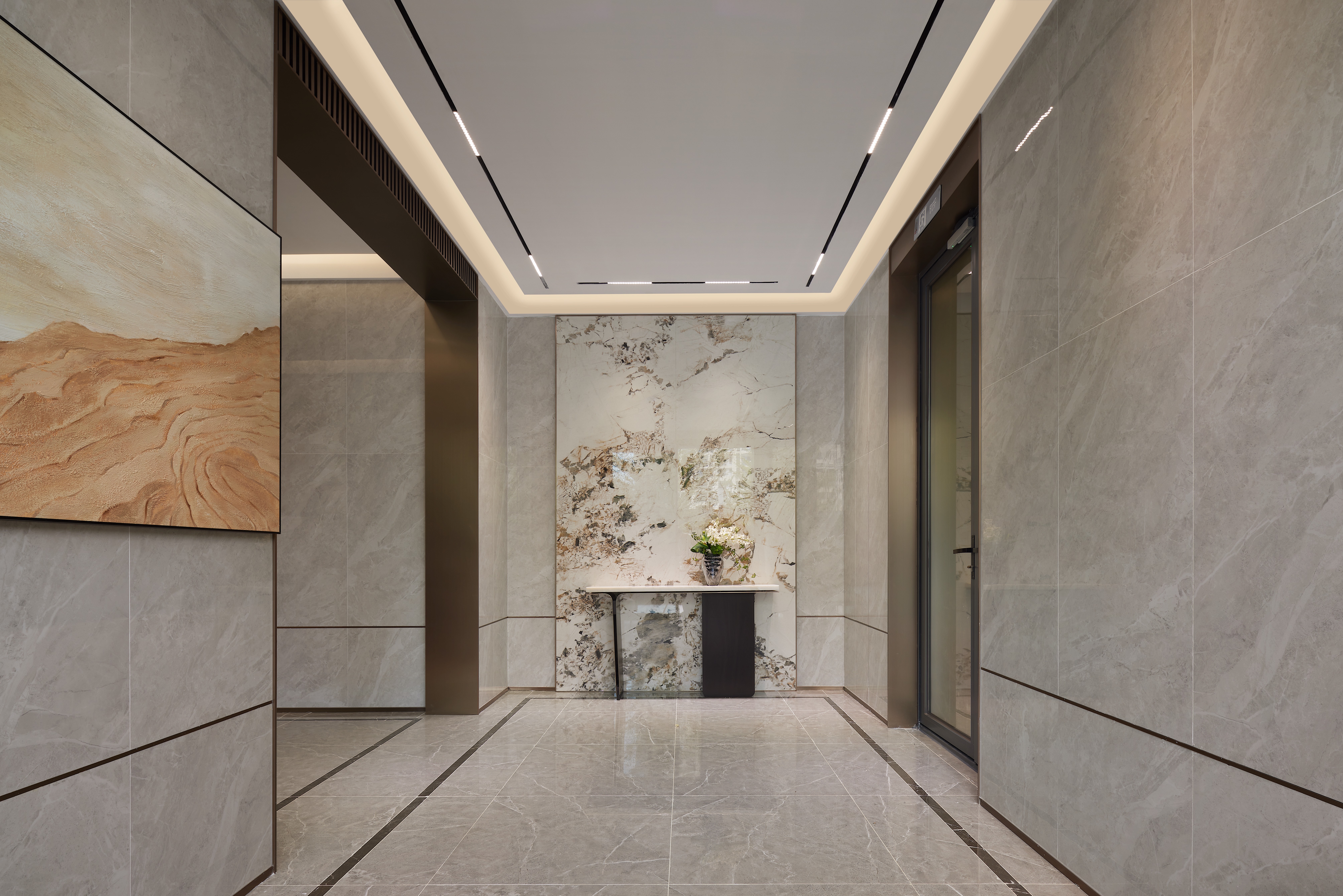 设计选材:这份惬意舒适的生活体验,漳州新城品悦四季也延续到了在高层宽境美宅中。从公区开始,便可感知到设计所带来的别样雅奢。步入归家大堂,规整高挑的空间搭配着酒店式的灯光,艺术岩板背景墙与金属质地的门头、腰线细节相得益彰,格调轻奢的设计感体现无遗。从人脸识别自动门到一体化电梯,点滴之间,尽显归家的仪式感与人文关怀。