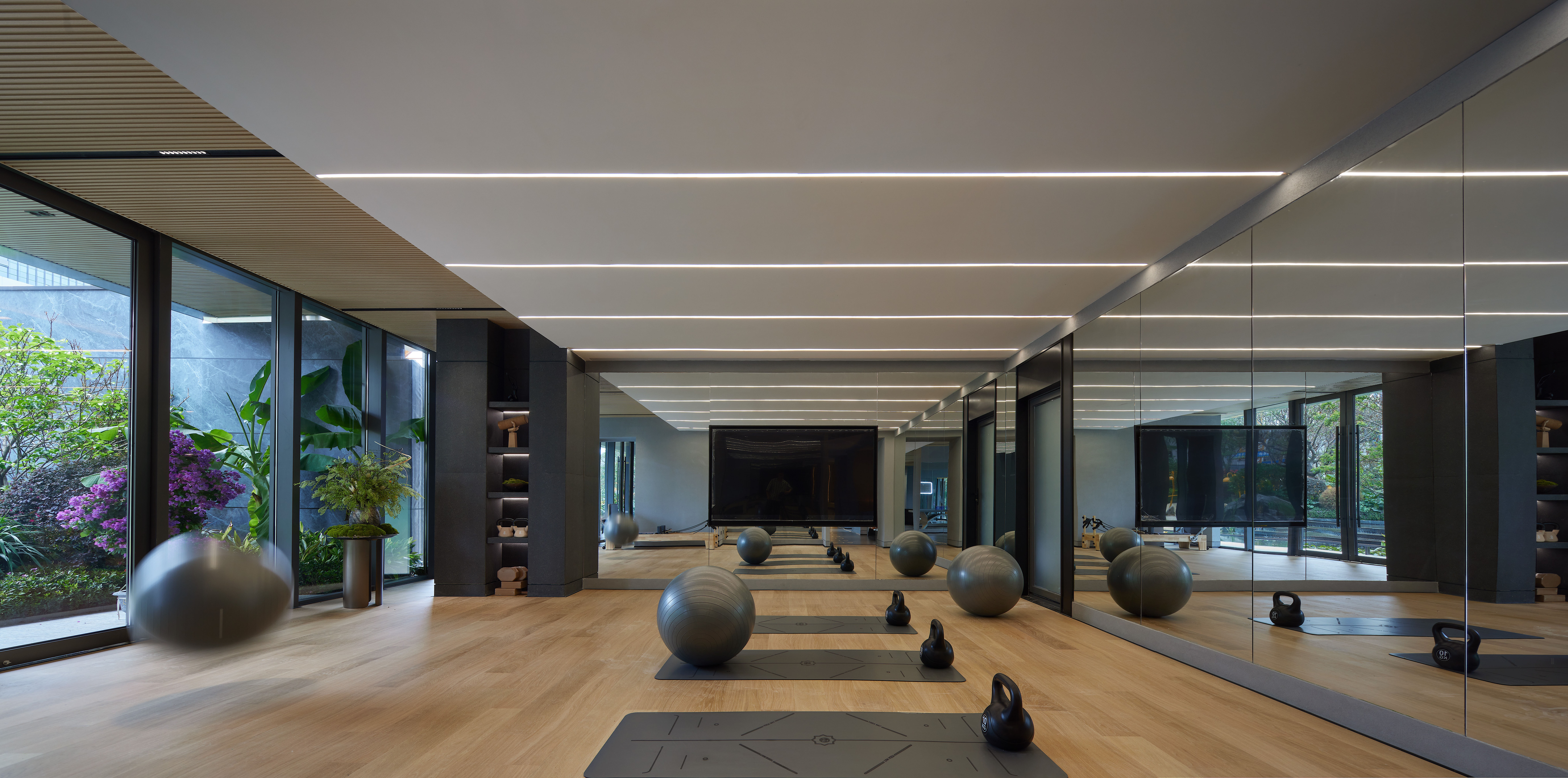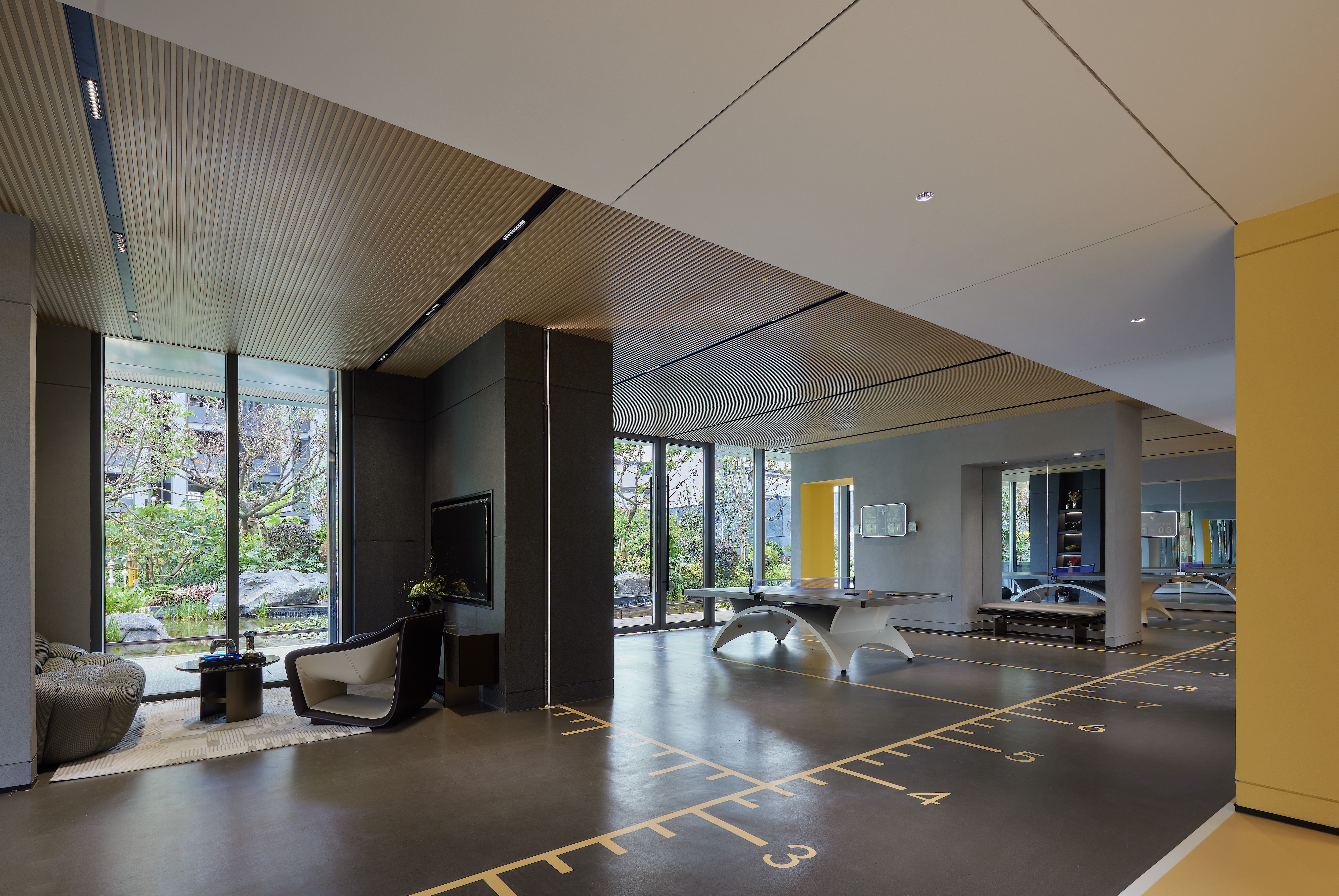 空间布局:健身空间更具有年轻特色,原木色及浅灰色的主体空间下以明黄色作为点缀,搭配氛围灯光的烘托将整体的空间主题表达的更为热烈,乒乓、器材、瑜伽一应俱全,各个区域都以落地玻璃采光,健身的同时观赏户外景观,让人沉醉其中,流连忘返。