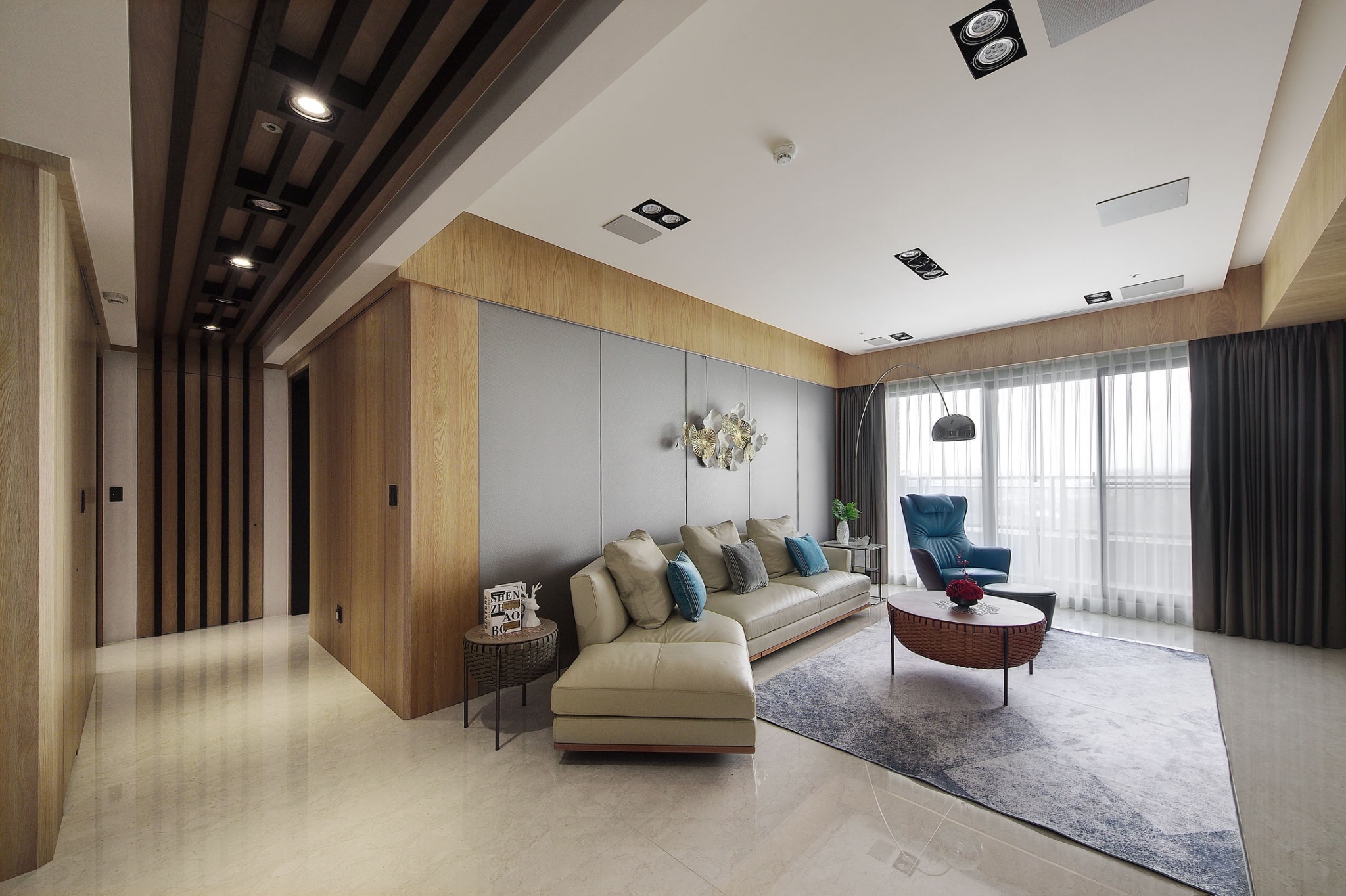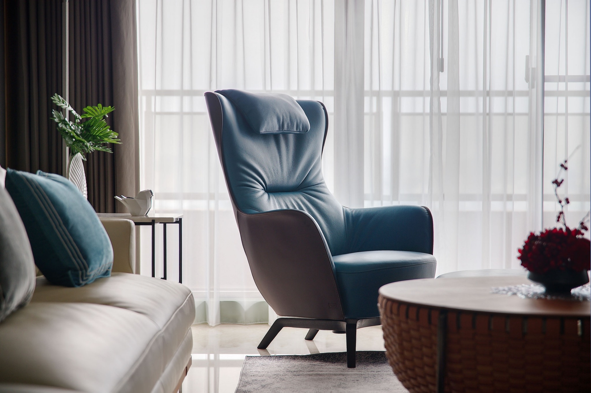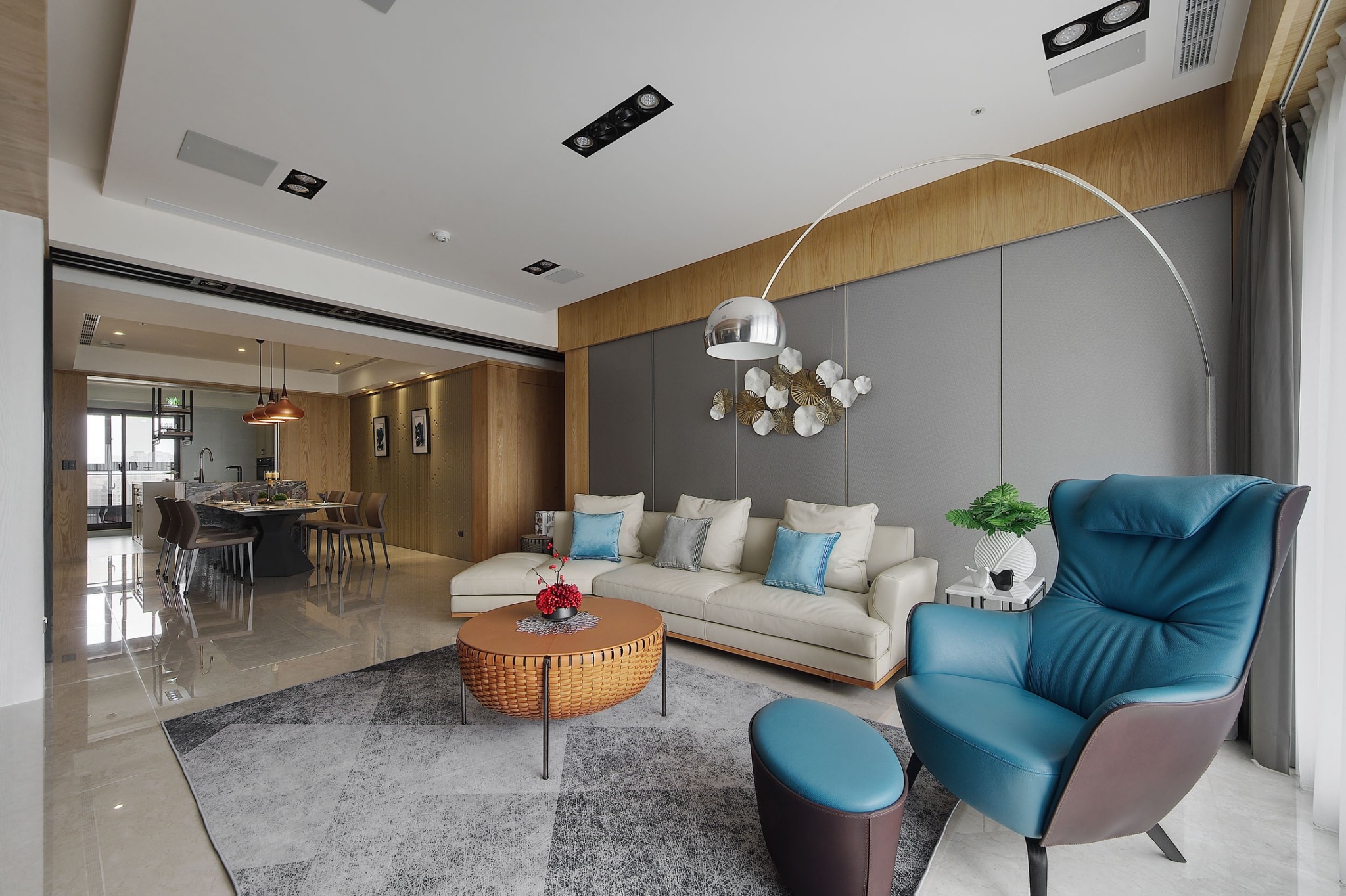 用户体验:客廳佈局呈現簡約現代,但絲毫不與場域裡多重的東方情調有違和,並大膽以亮藍色可坐臥的皮質單椅點出摩登感,配上單椅後方大型立燈,成為公領域中男主人最喜愛,感受最愜意的一隅端景。