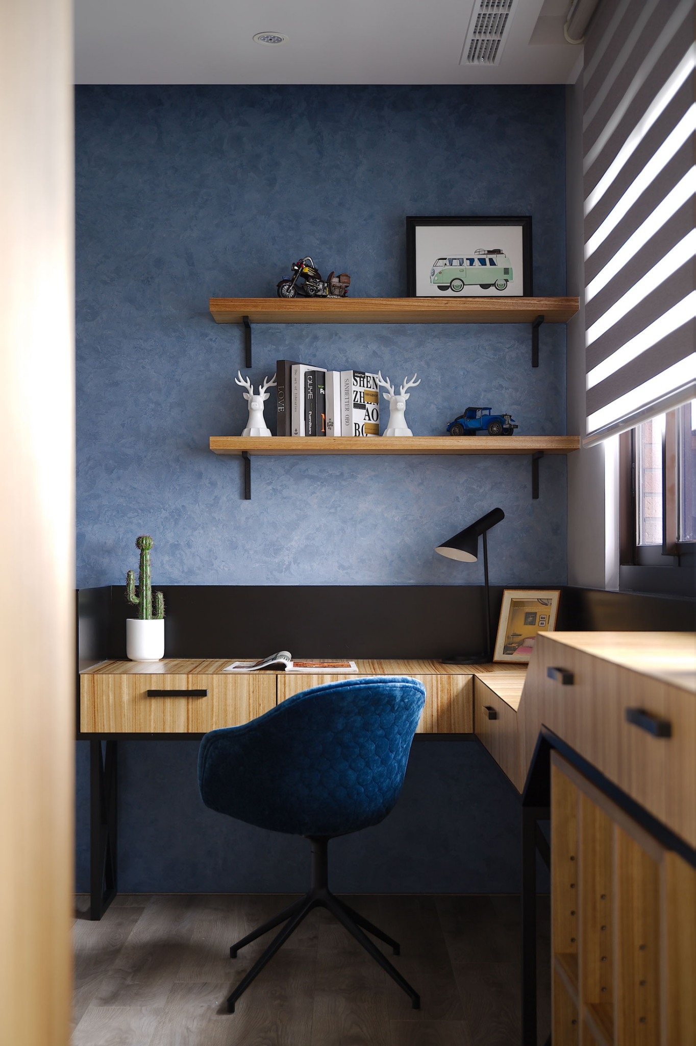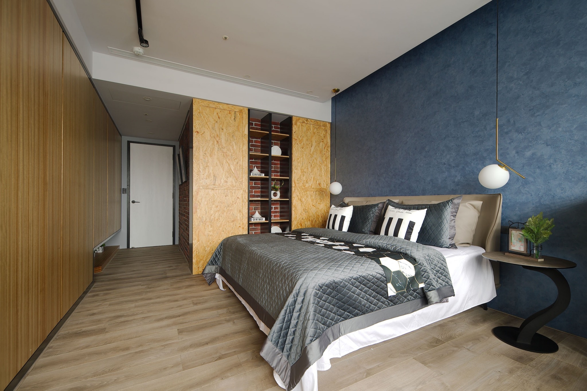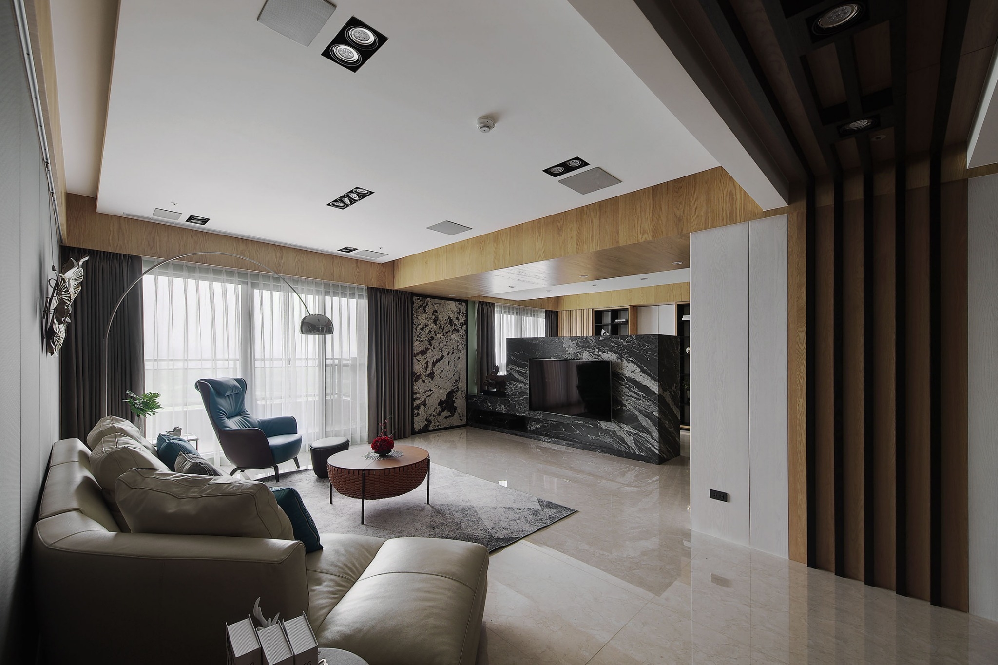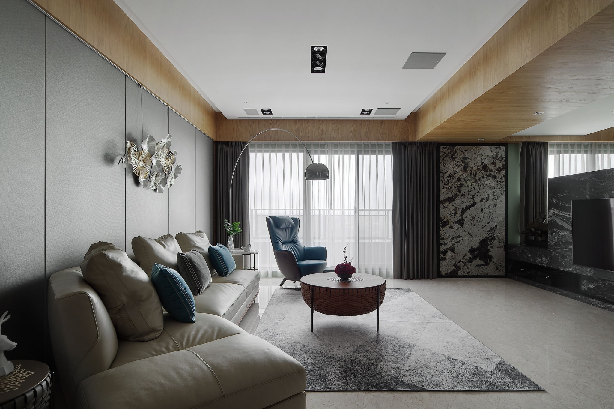 用户体验:客廳佈局呈現簡約現代,但絲毫不與場域裡多重的東方情調有違和,並大膽以亮藍色可坐臥的皮質單椅點出摩登感,配上單椅後方大型立燈,成為公領域中男主人最喜愛,感受最愜意的一隅端景。