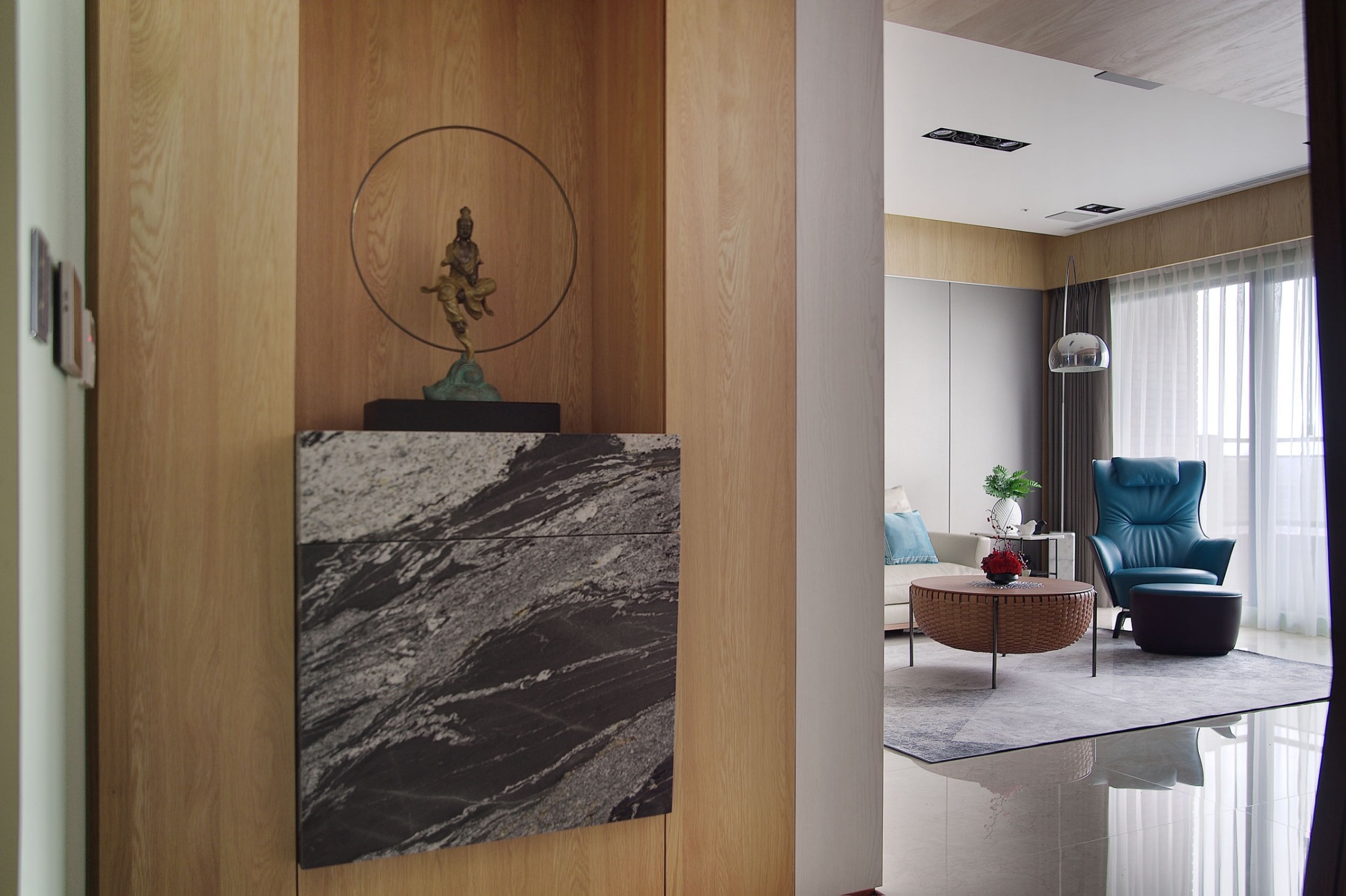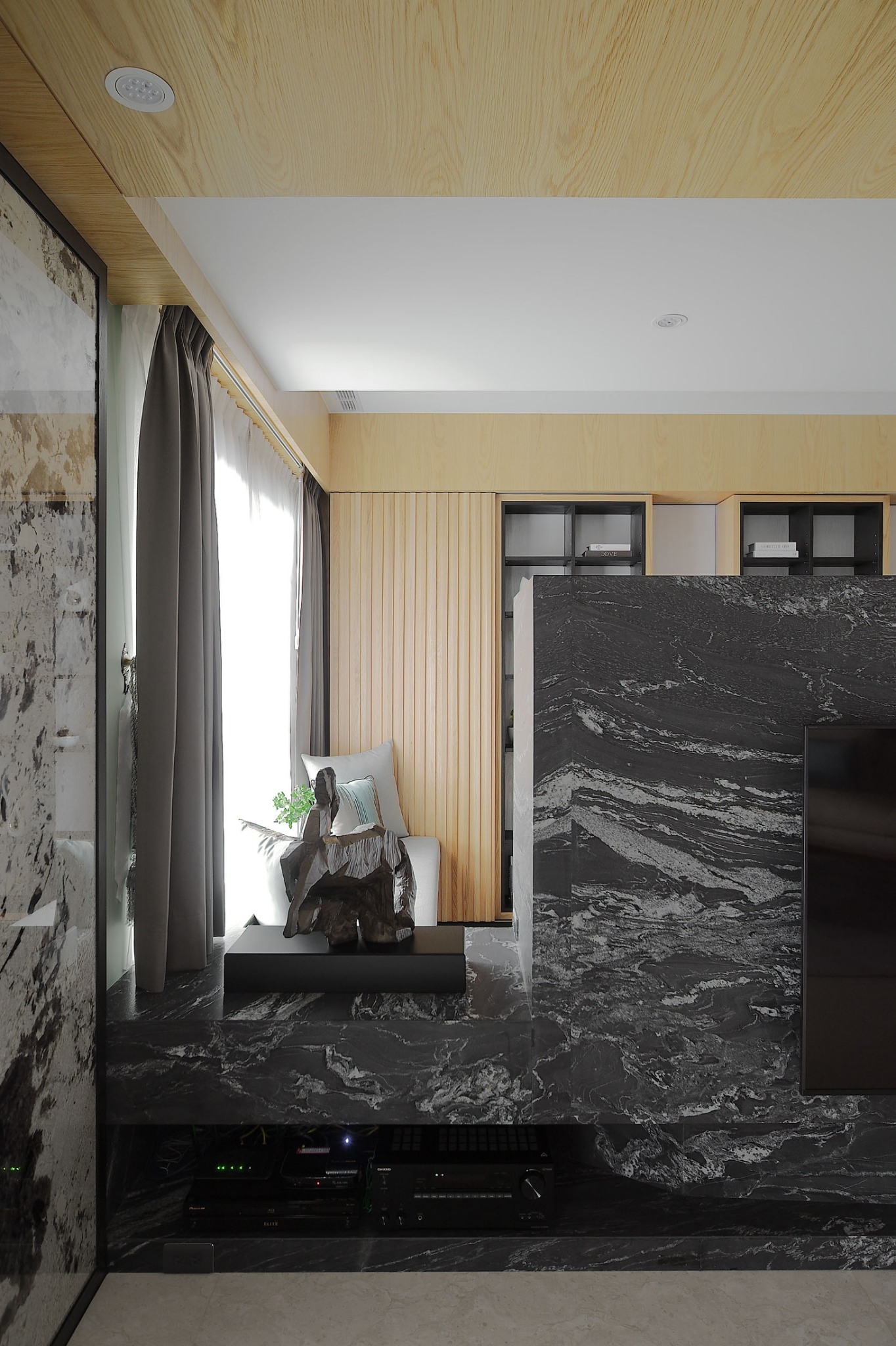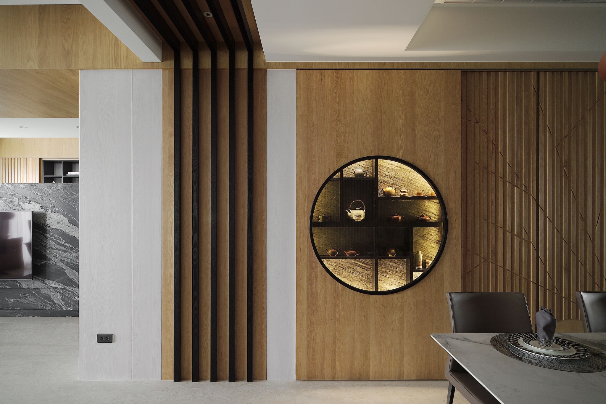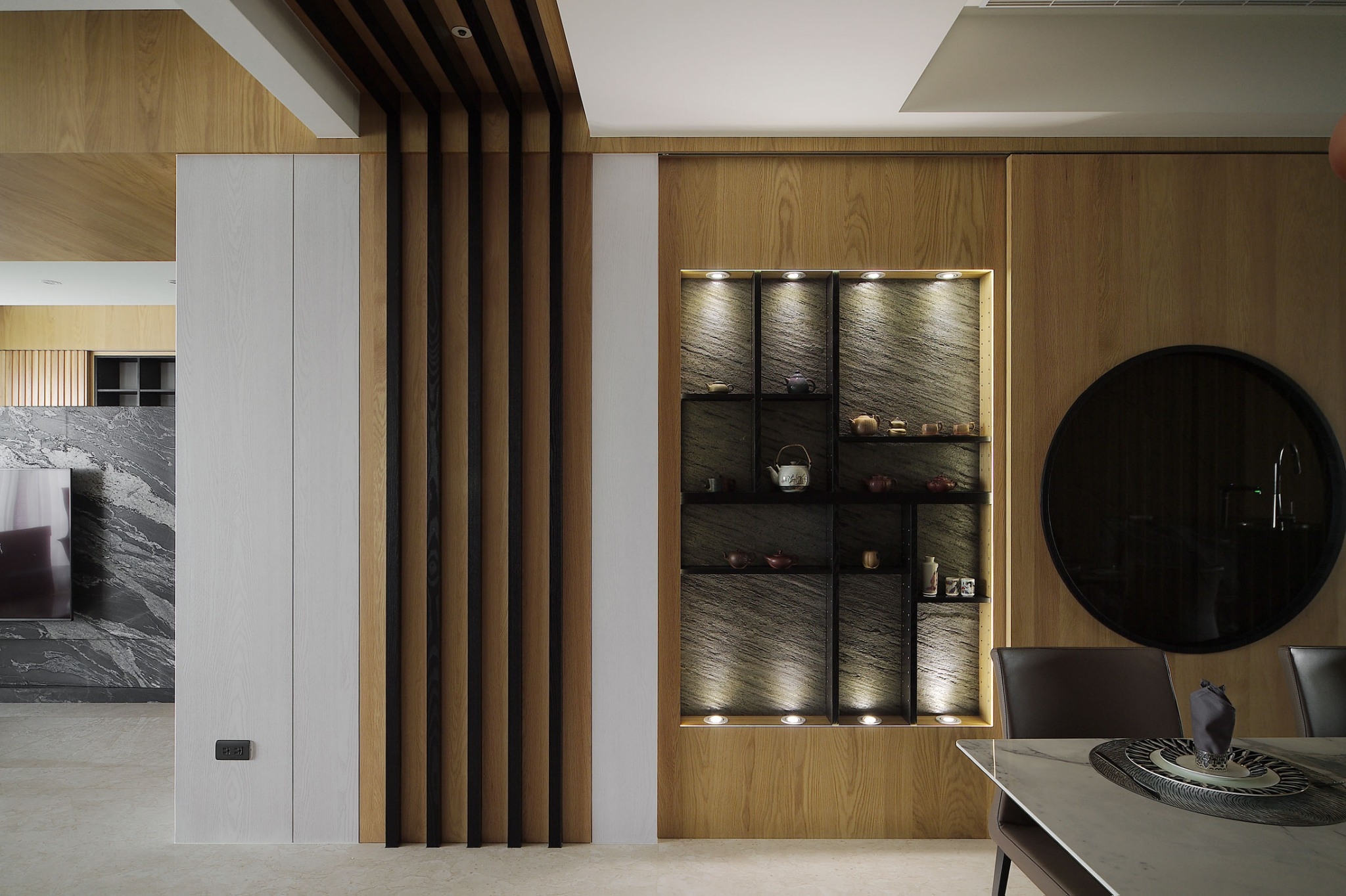 空间意境:屋主喜好蒐集中式風情骨董、雕塑以及紫砂茶壺,在設計前置初始即將這些意像納入空間展示的考量與規劃。從進門玄關處的觀音雕塑為起始,即以迎賓形象來提升門面格局。入廳後,右為書房區,左為客廳,從中大氣的以山水意象為主視覺,樹立色澤風格強烈的黑白紋理石材為兩區間矮隔牆,一如山水墨色潑灑於其中,提升整體大氣度。