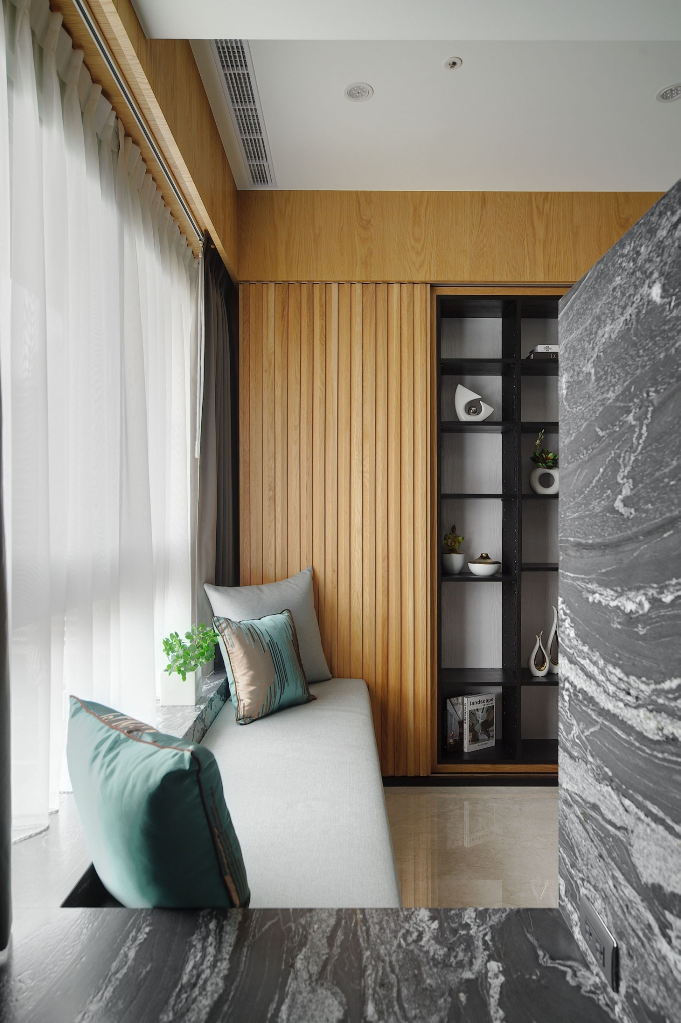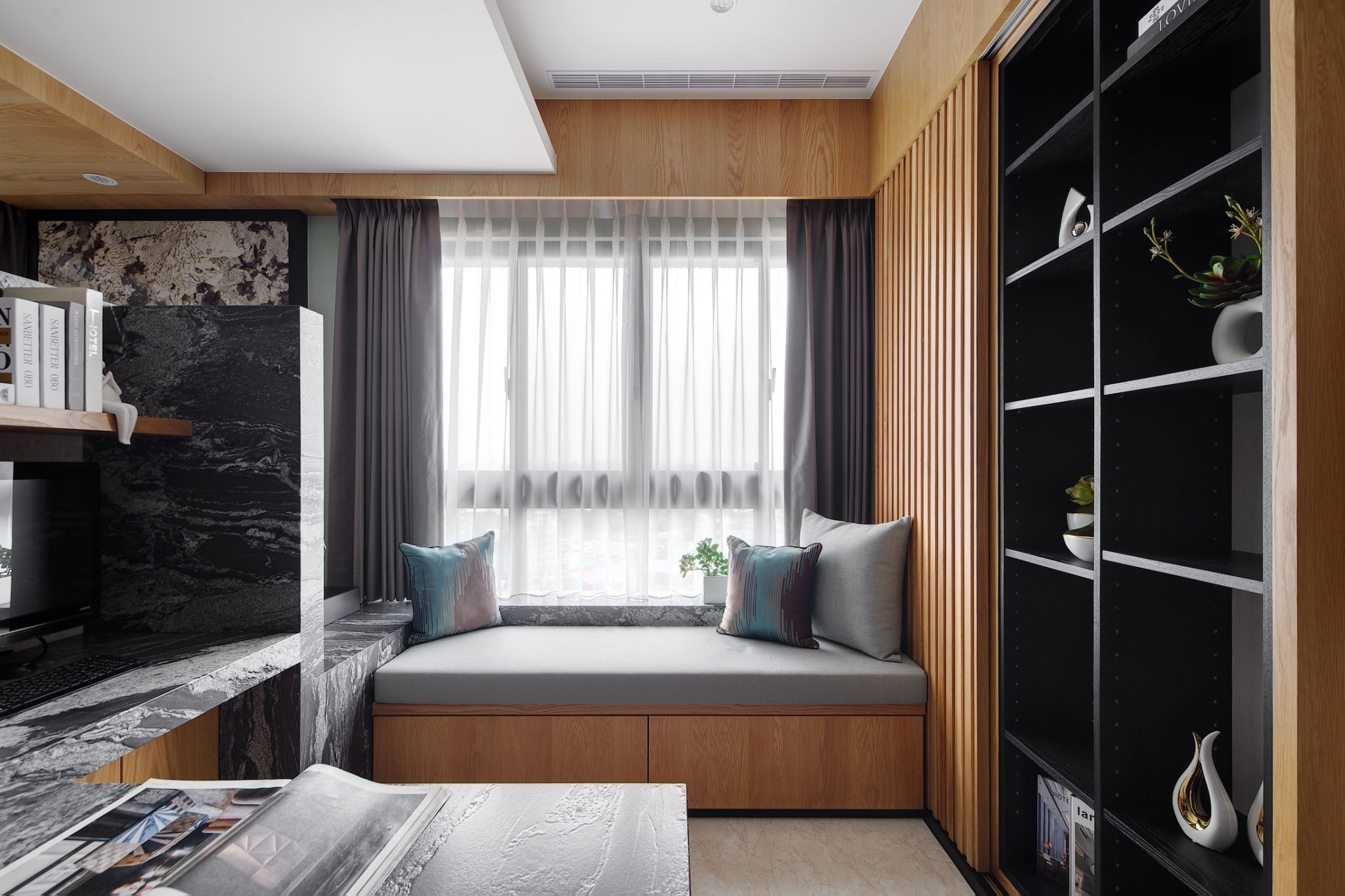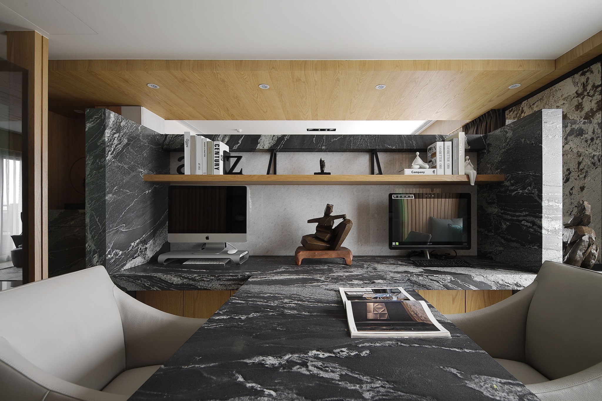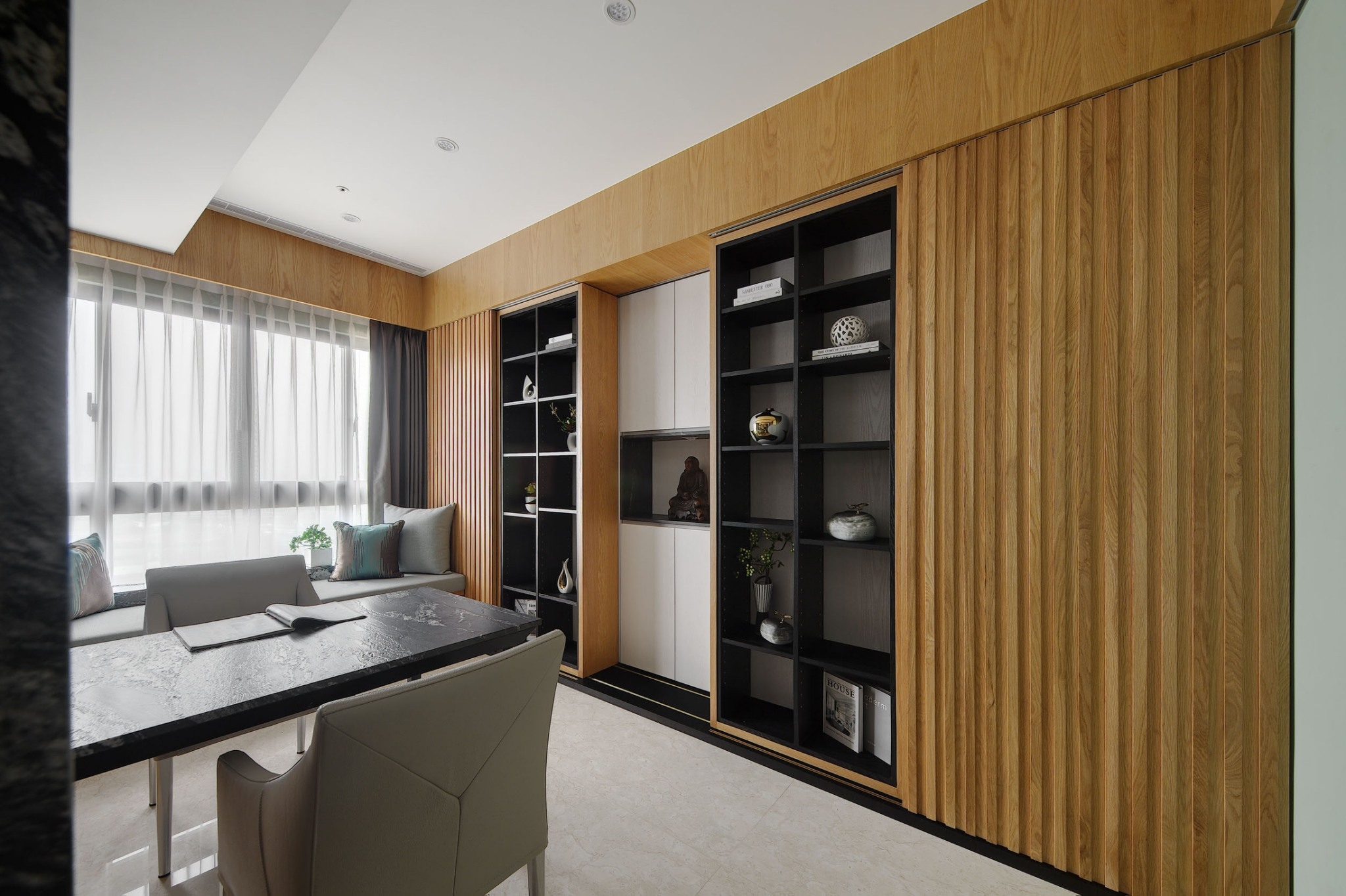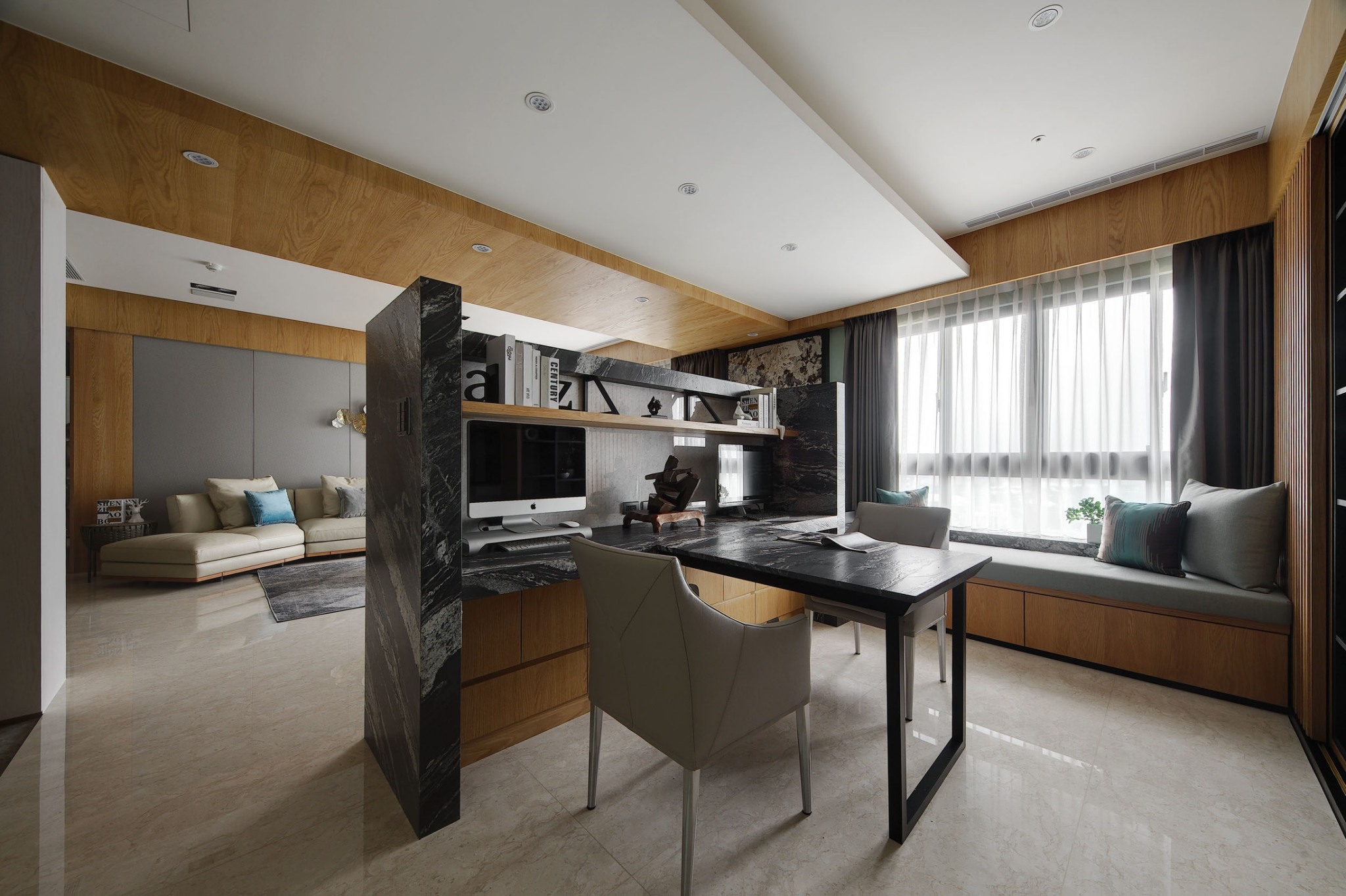 空间意境:屋主喜好蒐集中式風情骨董、雕塑以及紫砂茶壺,在設計前置初始即將這些意像納入空間展示的考量與規劃。從進門玄關處的觀音雕塑為起始,即以迎賓形象來提升門面格局。入廳後,右為書房區,左為客廳,從中大氣的以山水意象為主視覺,樹立色澤風格強烈的黑白紋理石材為兩區間矮隔牆,一如山水墨色潑灑於其中,提升整體大氣度。