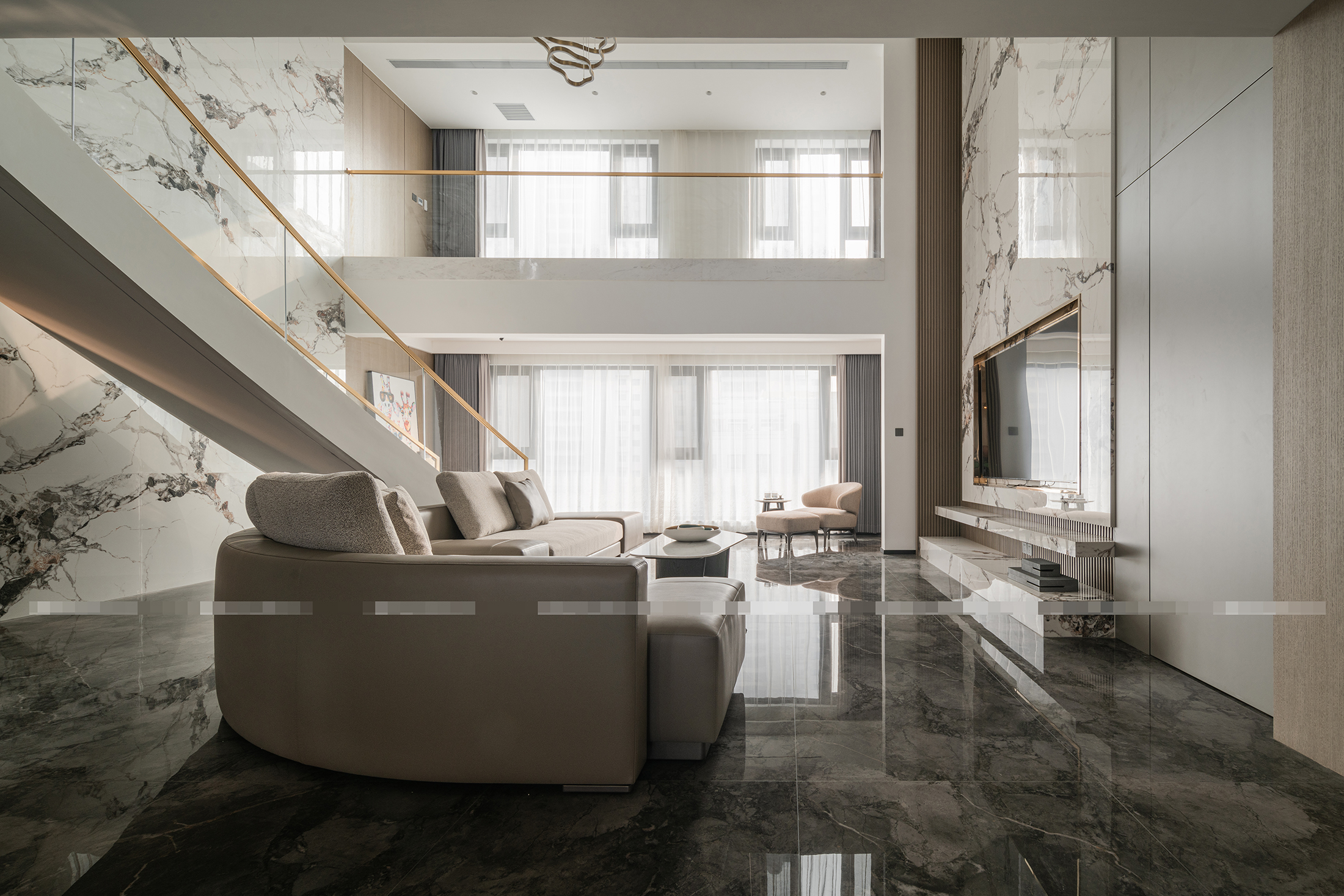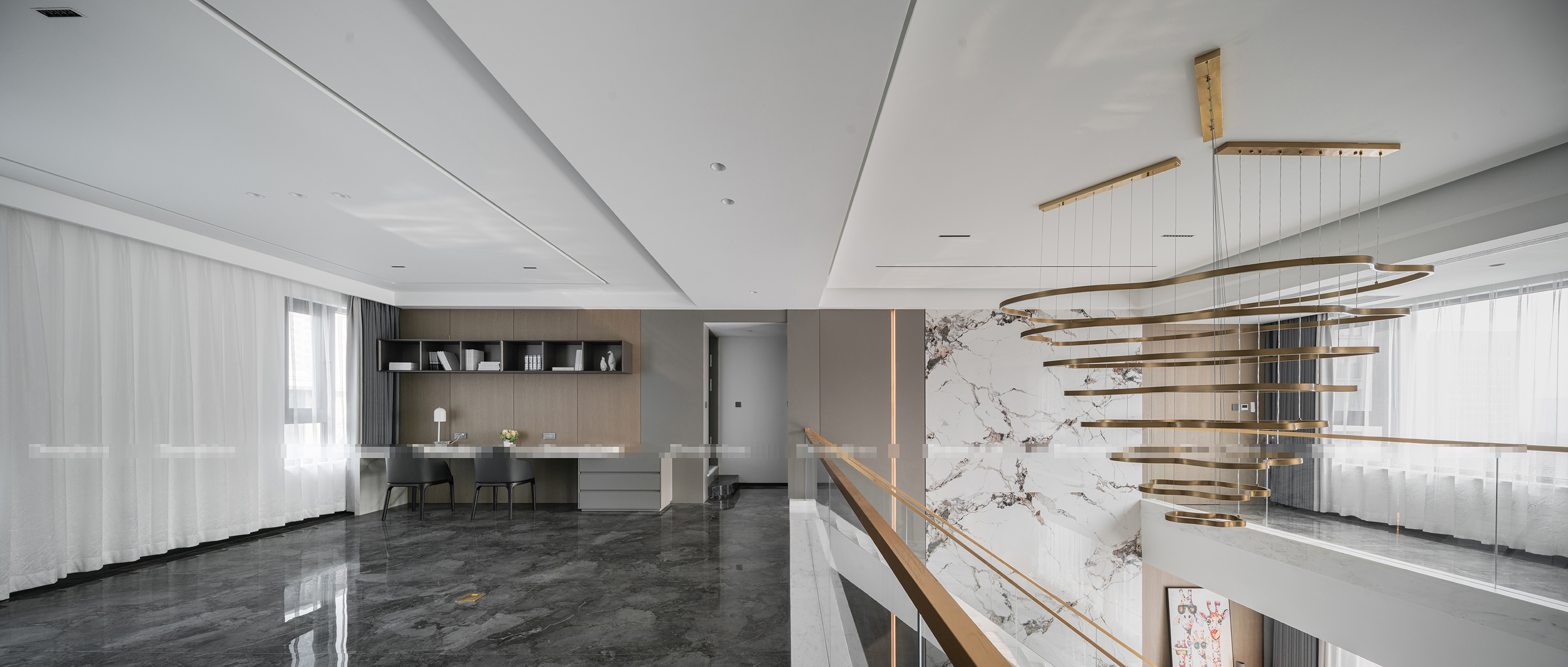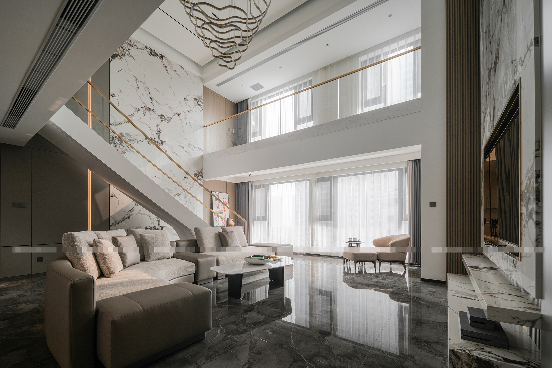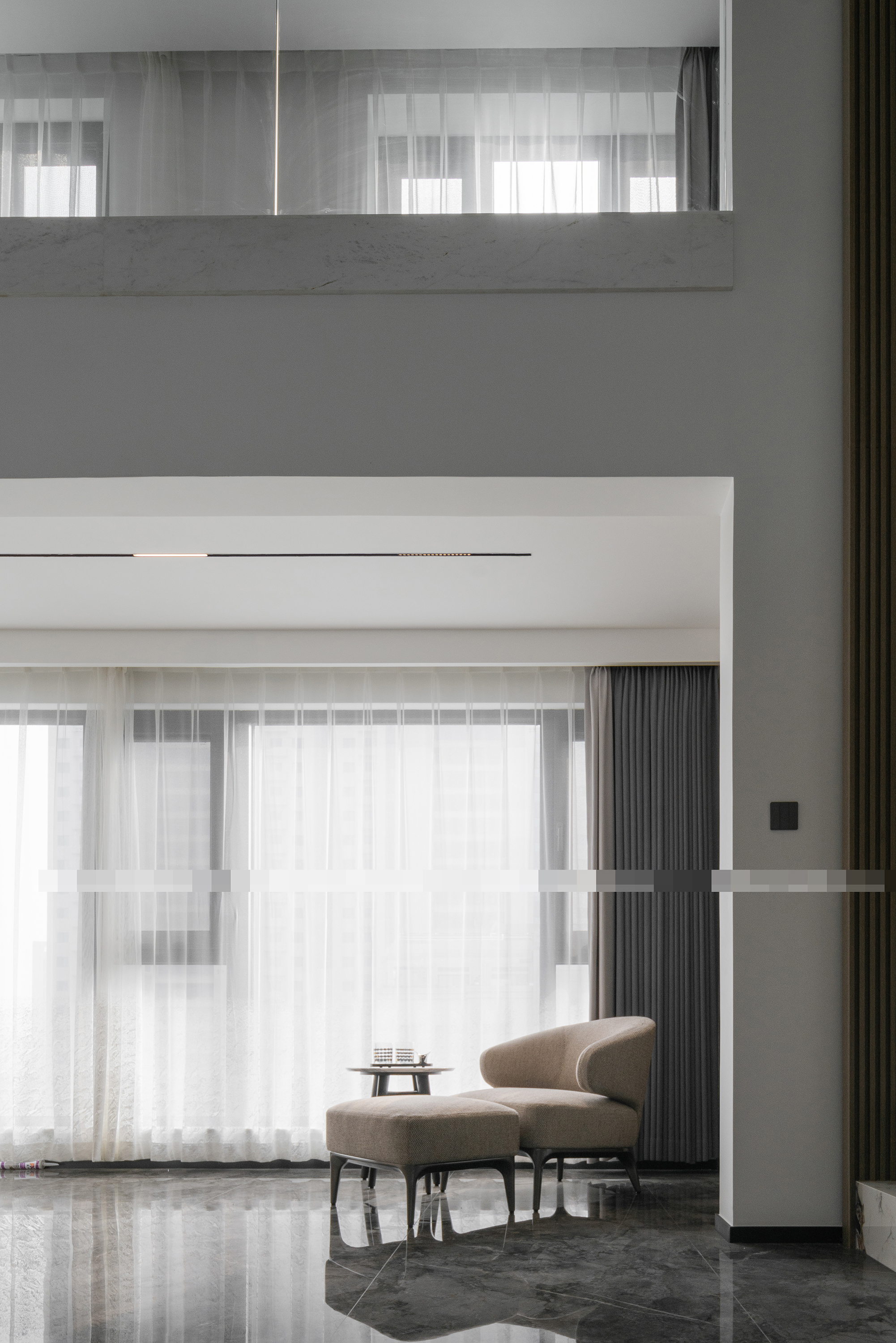 经过与业主的沟通,并根据居住情况和业主对改善型房屋品质需求的角度来分析:设计中保留了客厅挑空的纵深感,呈现了复式的品质感。