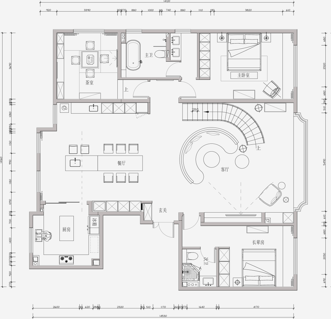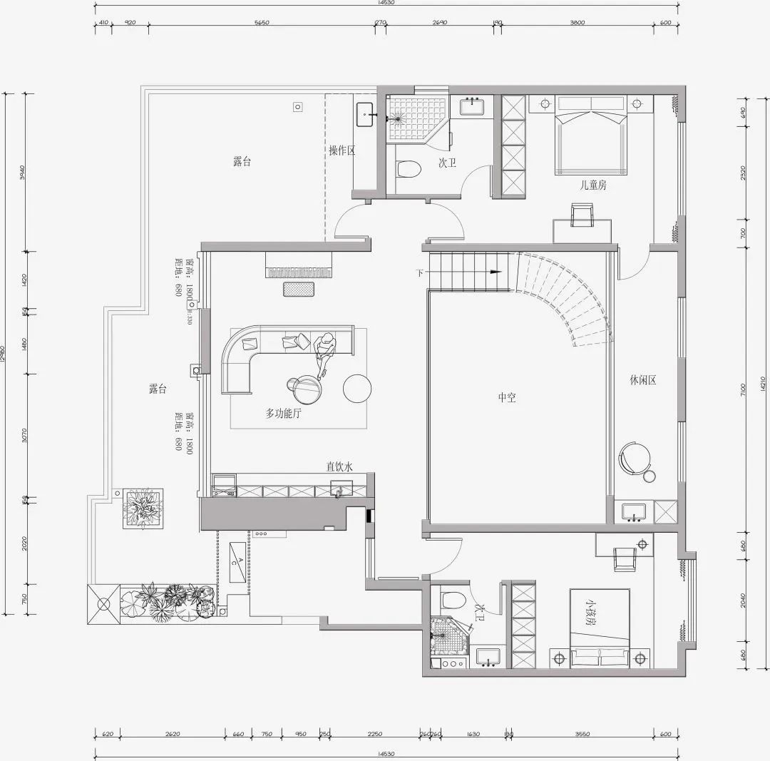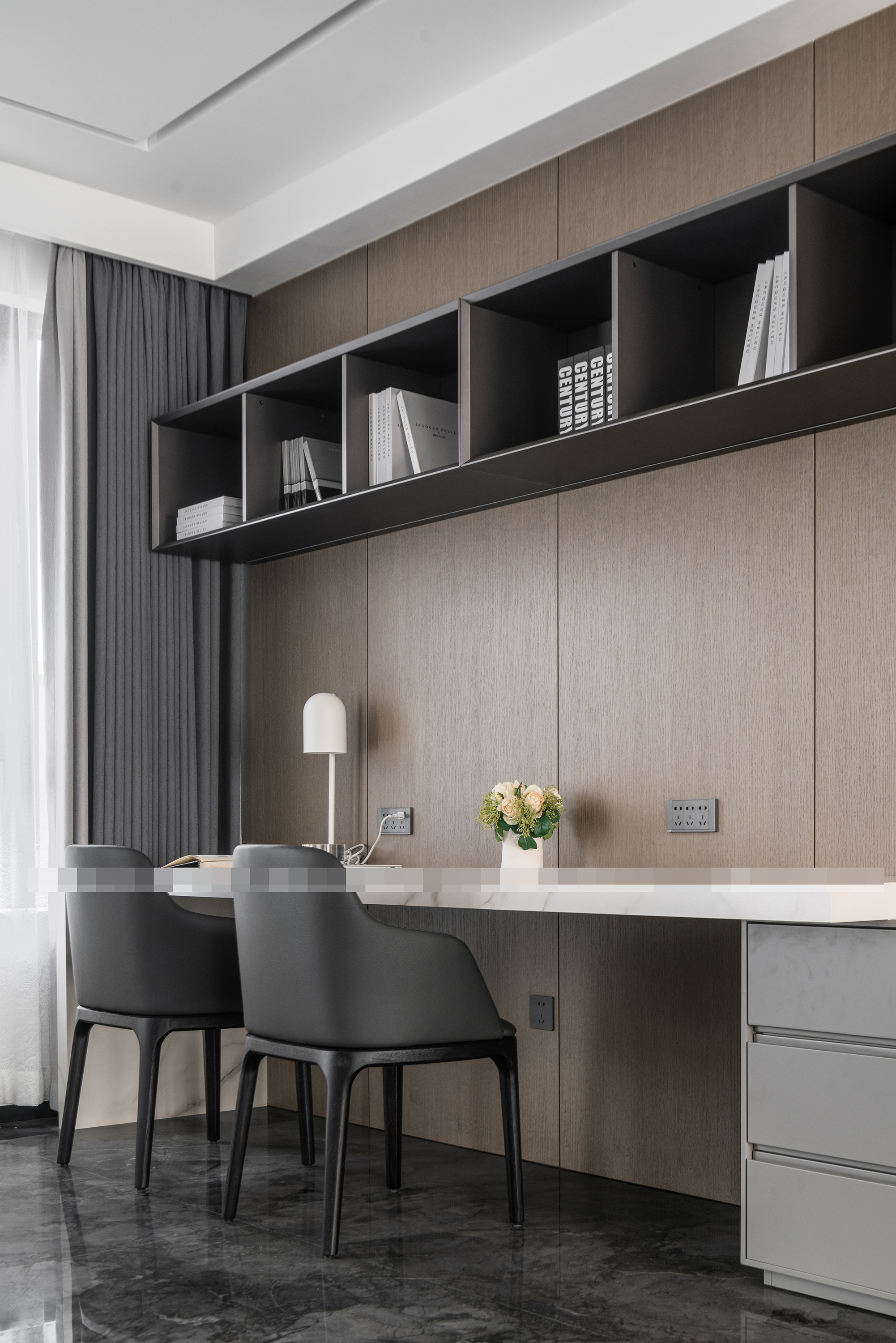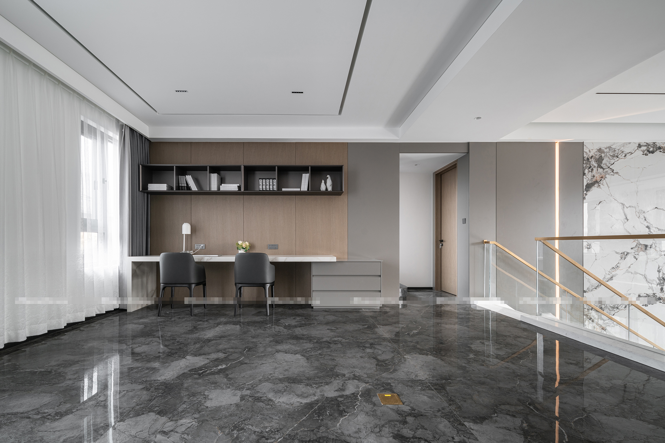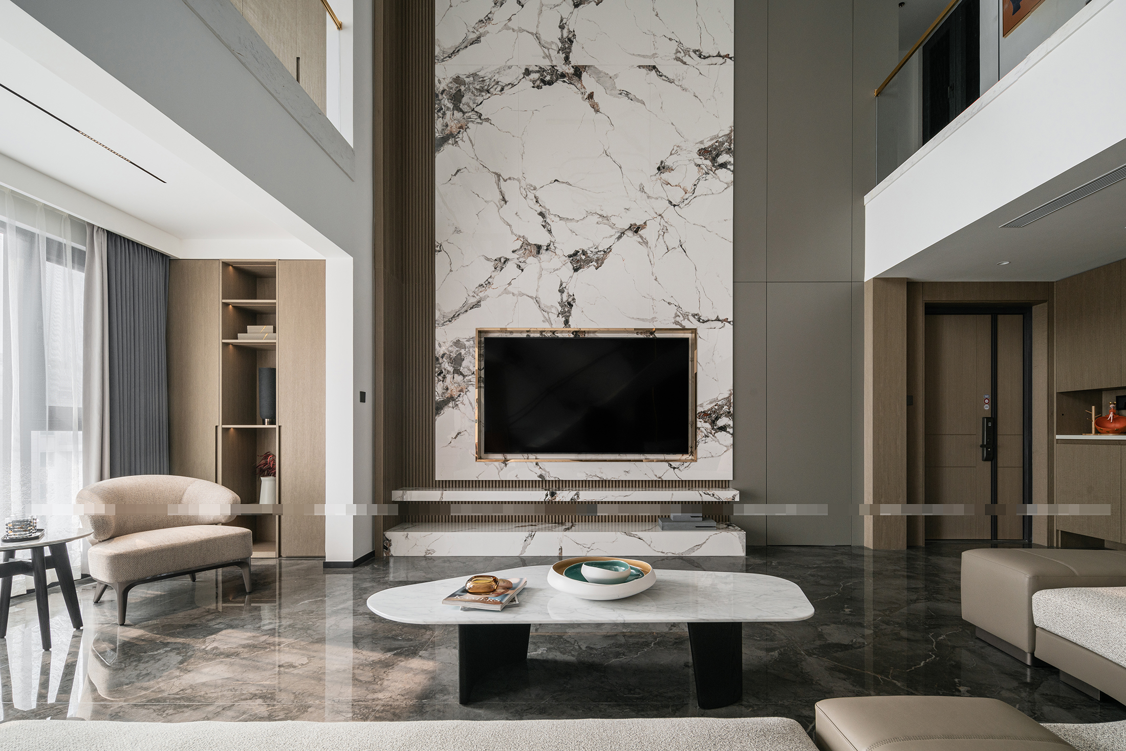 经过与业主的沟通,并根据居住情况和业主对改善型房屋品质需求的角度来分析:设计中保留了客厅挑空的纵深感,呈现了复式的品质感。