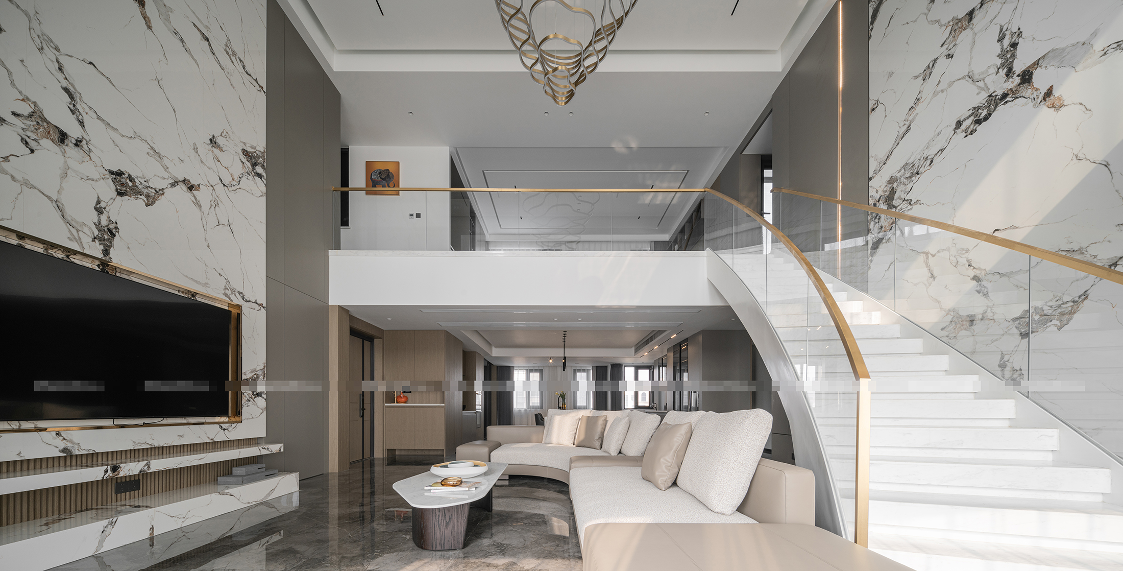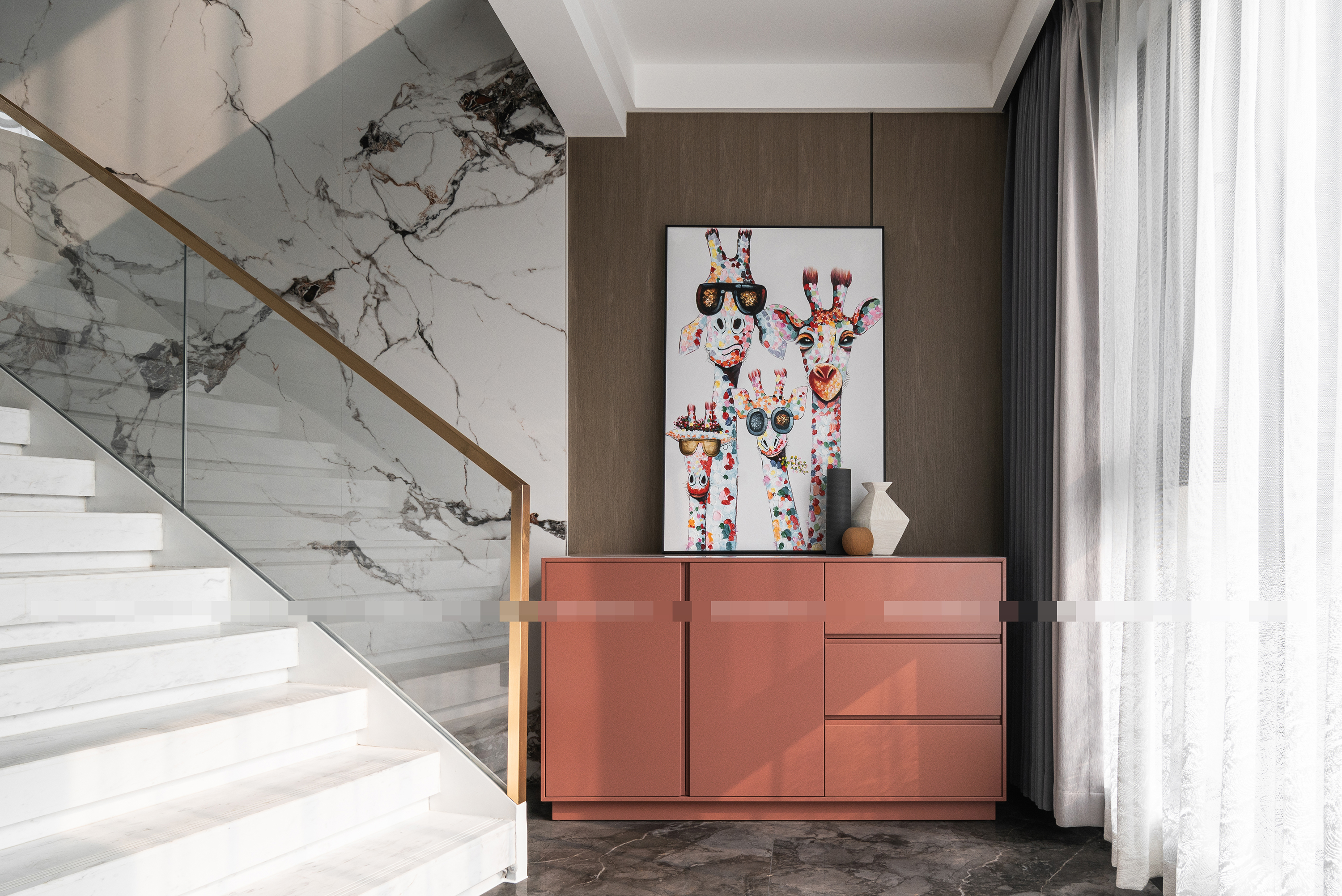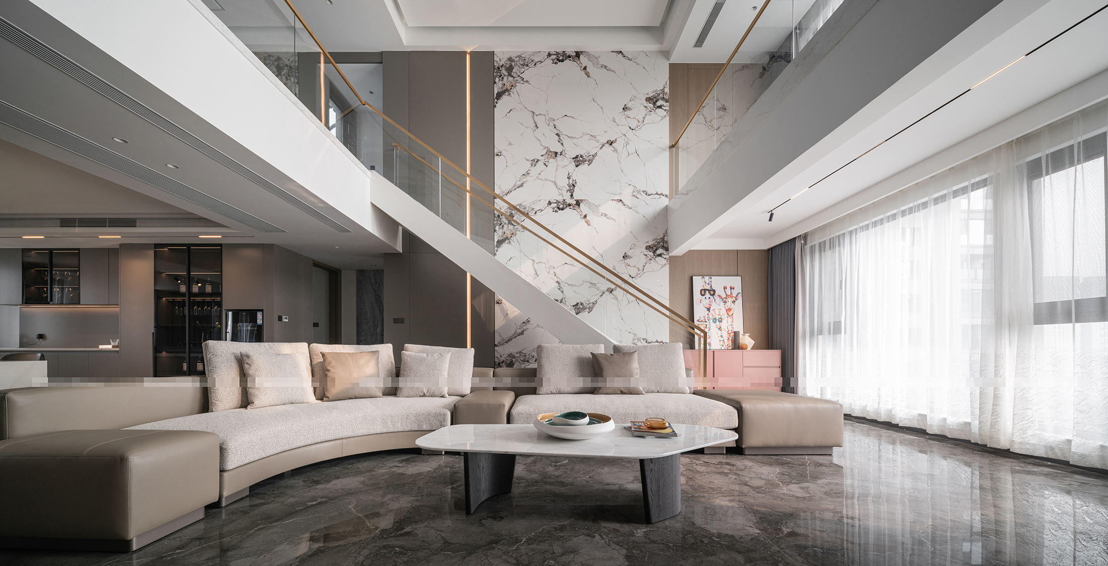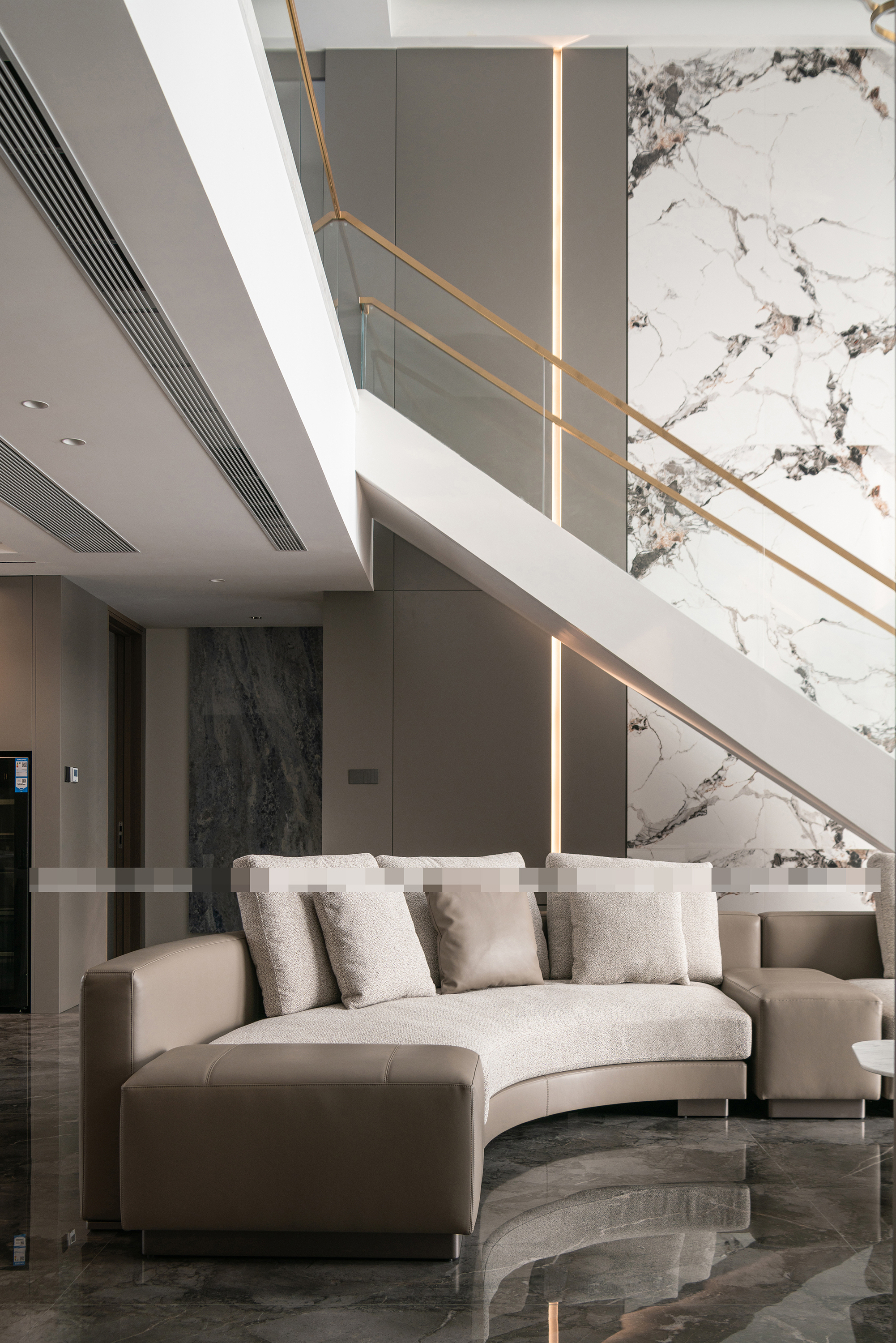 设计师将原计划在餐厅的楼梯移到客厅的沙发背景墙边,流线型的半旋转腾空楼梯,和沙发融合为一体;不仅呈现上下楼的实用性通道,也装饰了客厅背景墙,软化了方正客厅的棱角感。