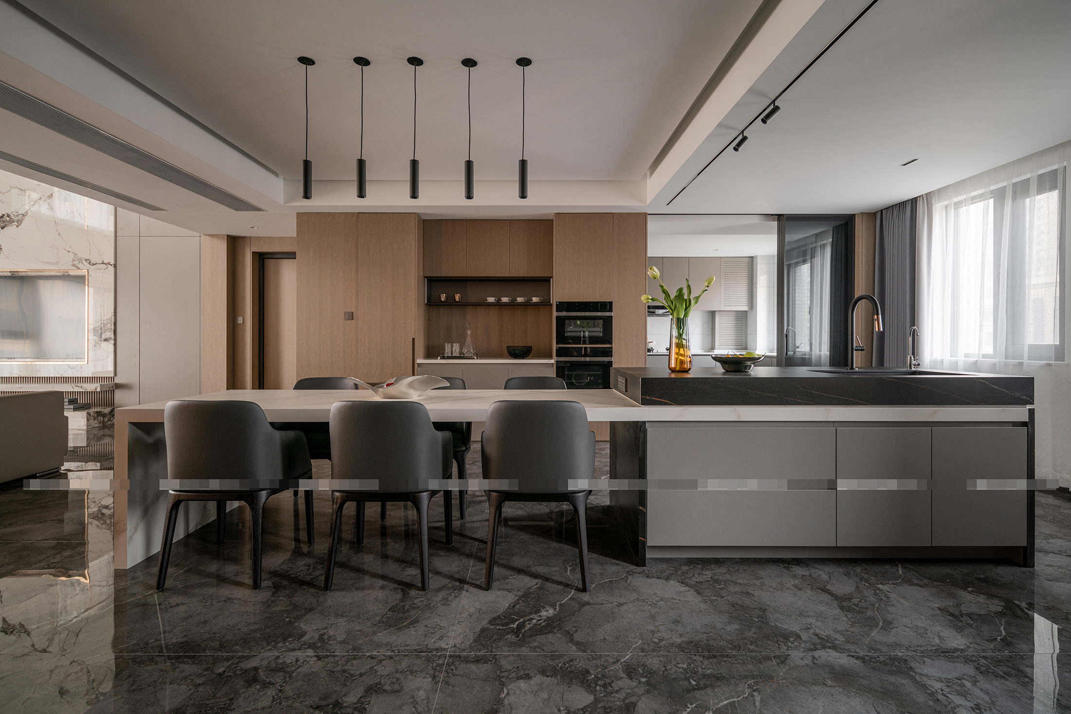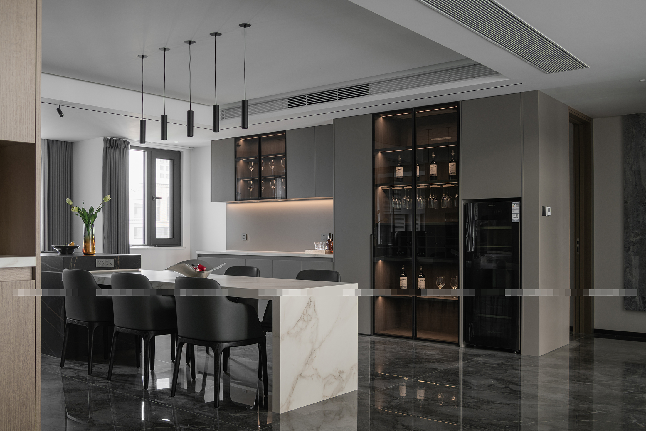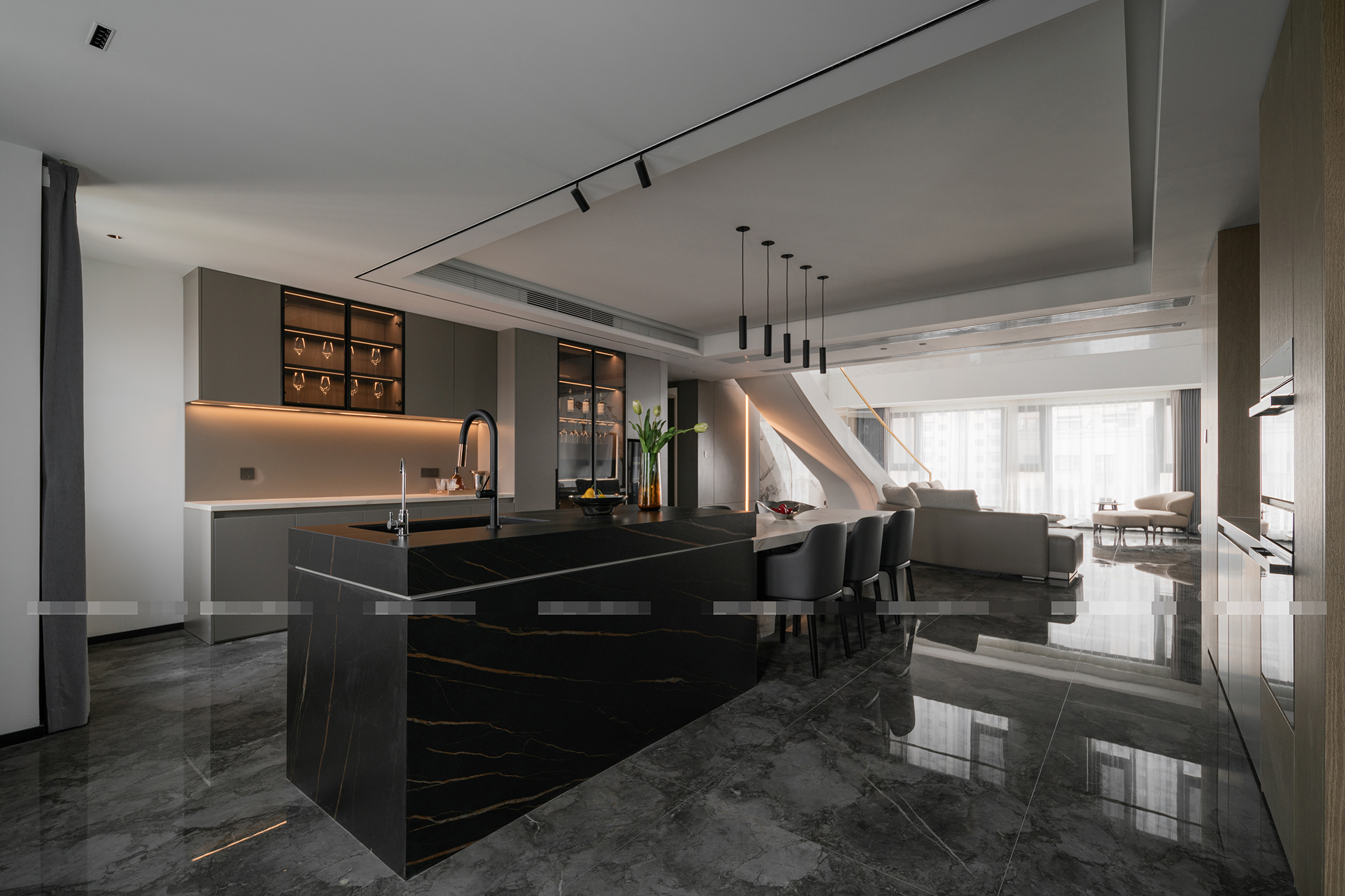 厨房则重新布局,不仅设置了开放式的西厨和便捷性使用的水吧,还增加了中导台,中岛台兼顾了厨房、餐厅和客厅三个空间的多维度使用。