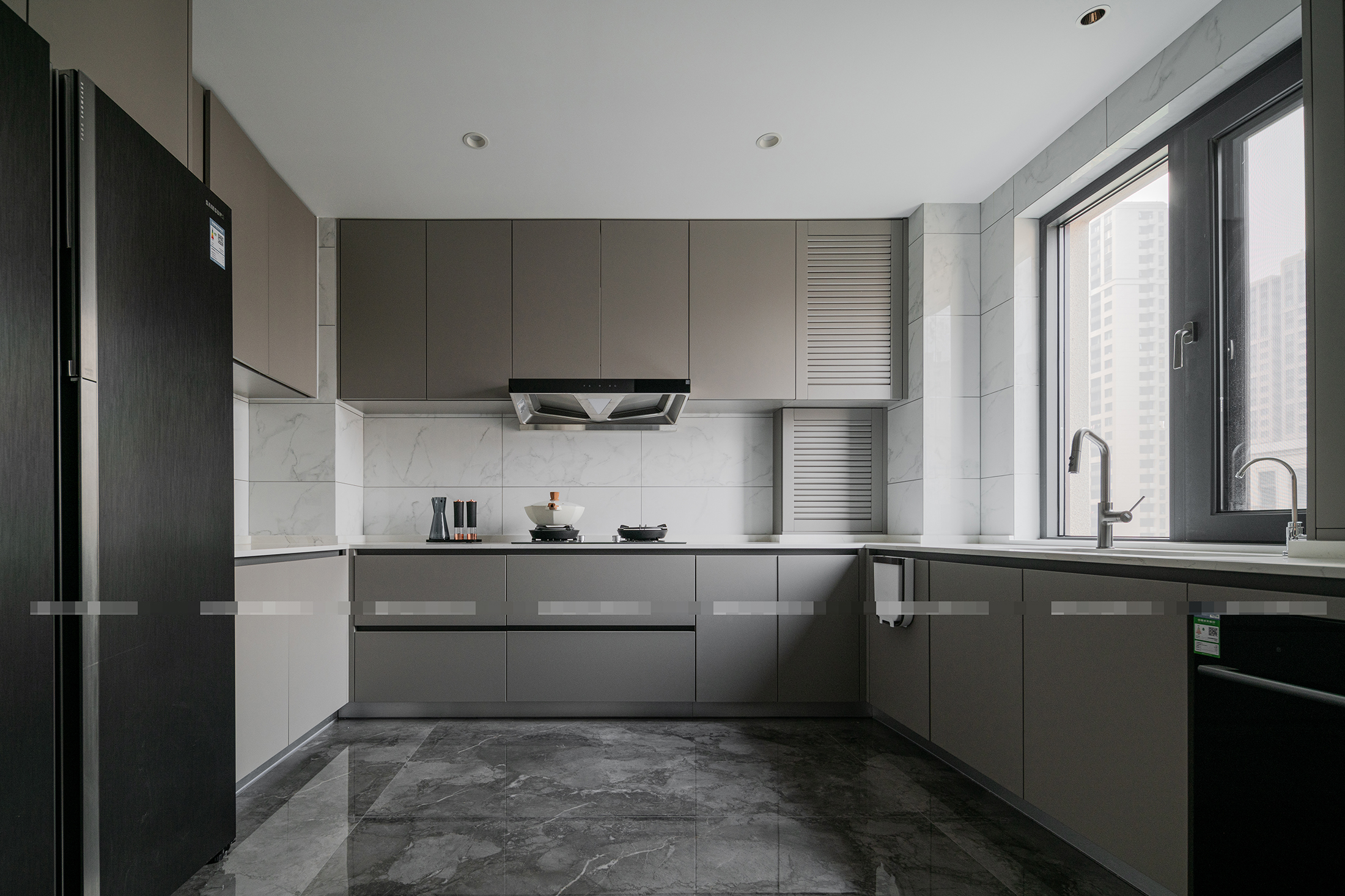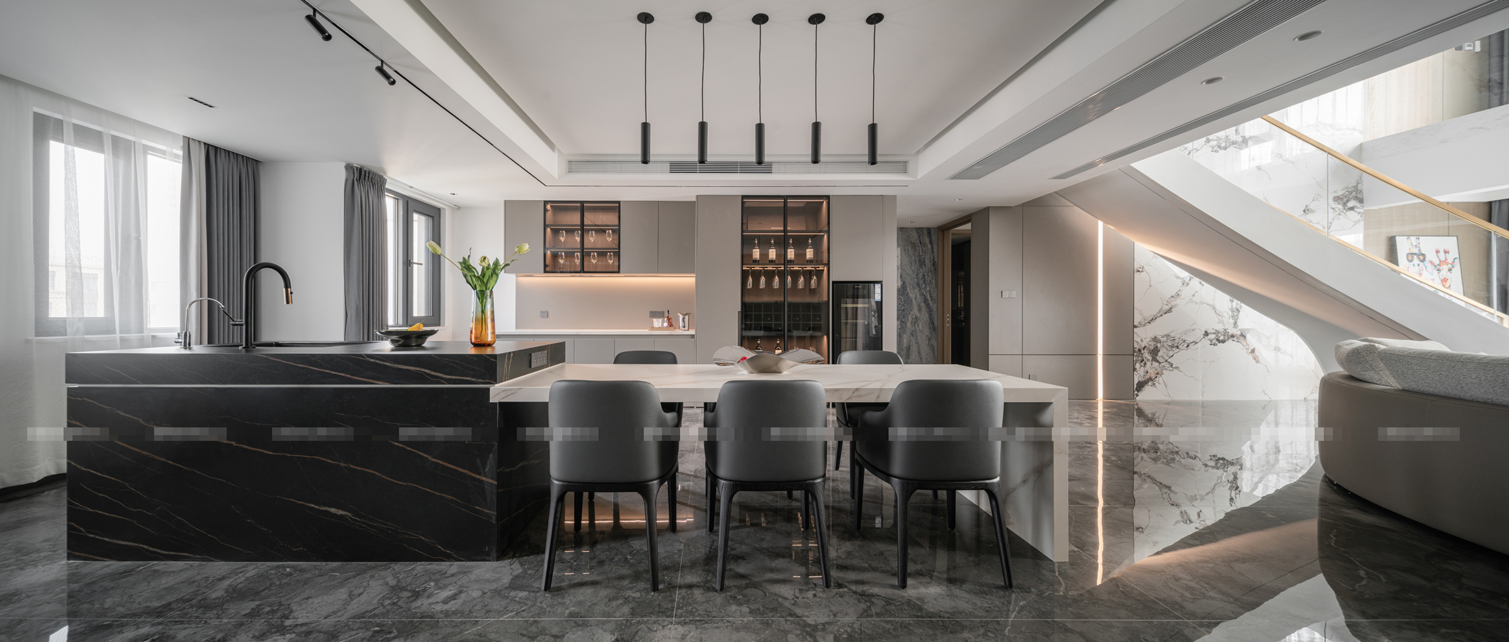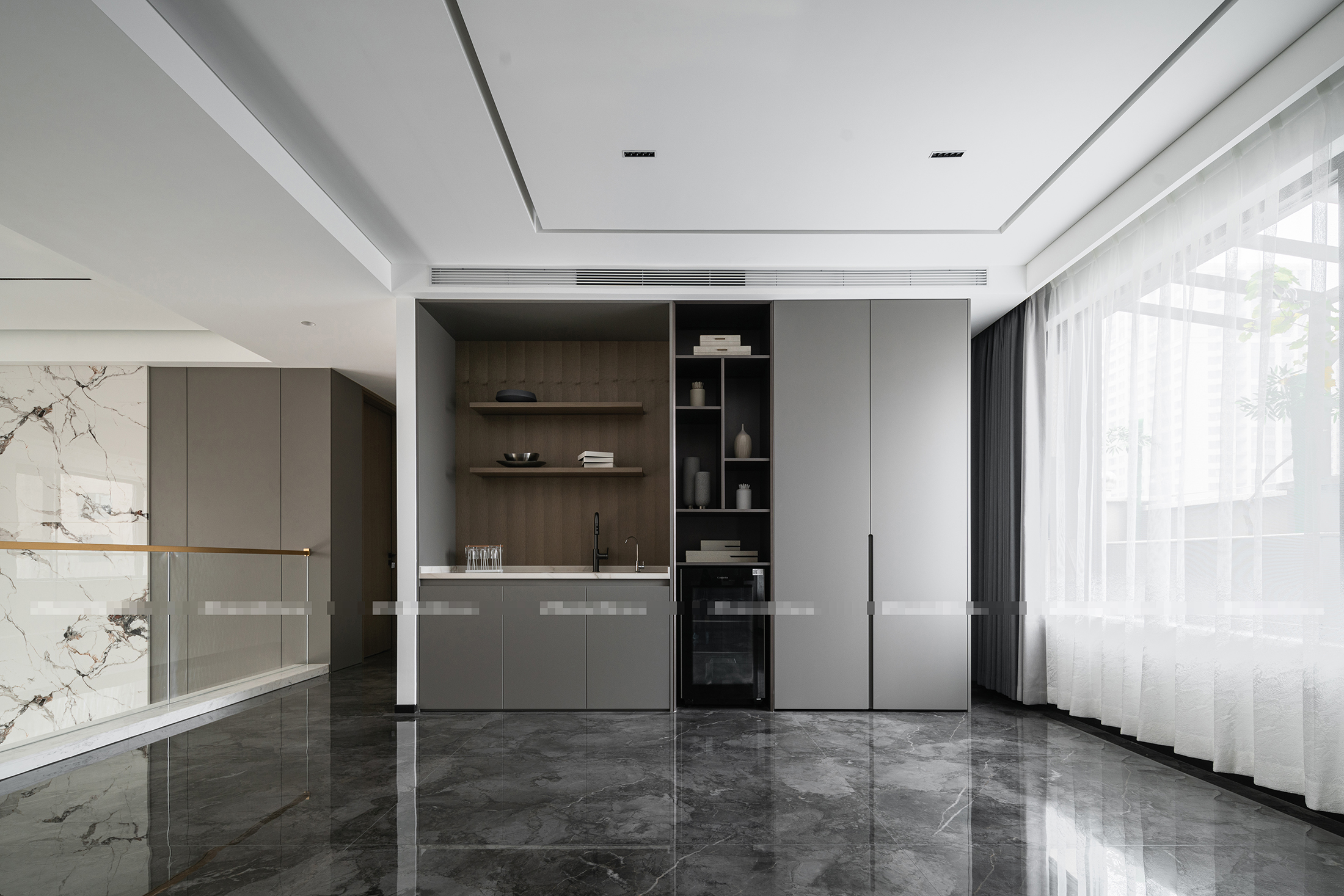 厨房则重新布局,不仅设置了开放式的西厨和便捷性使用的水吧,还增加了中导台,中岛台兼顾了厨房、餐厅和客厅三个空间的多维度使用。