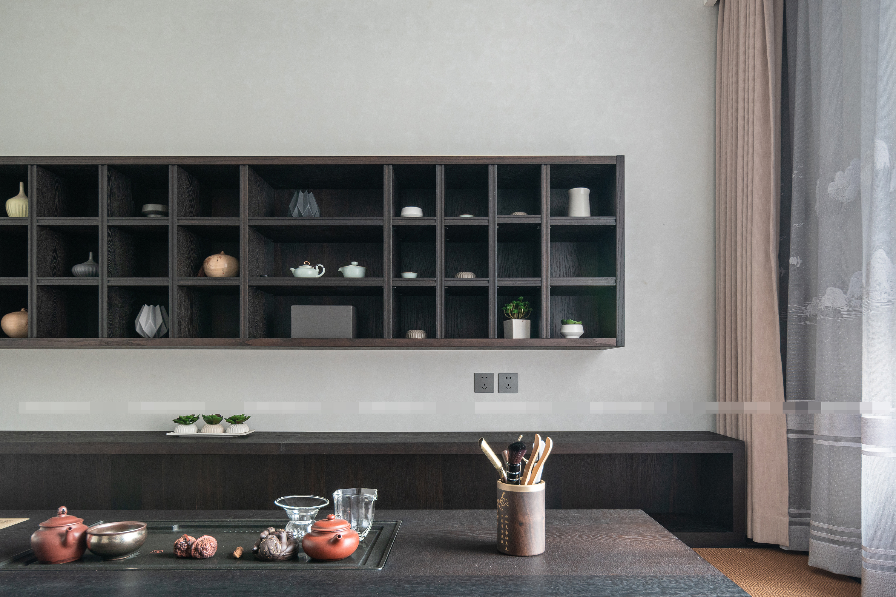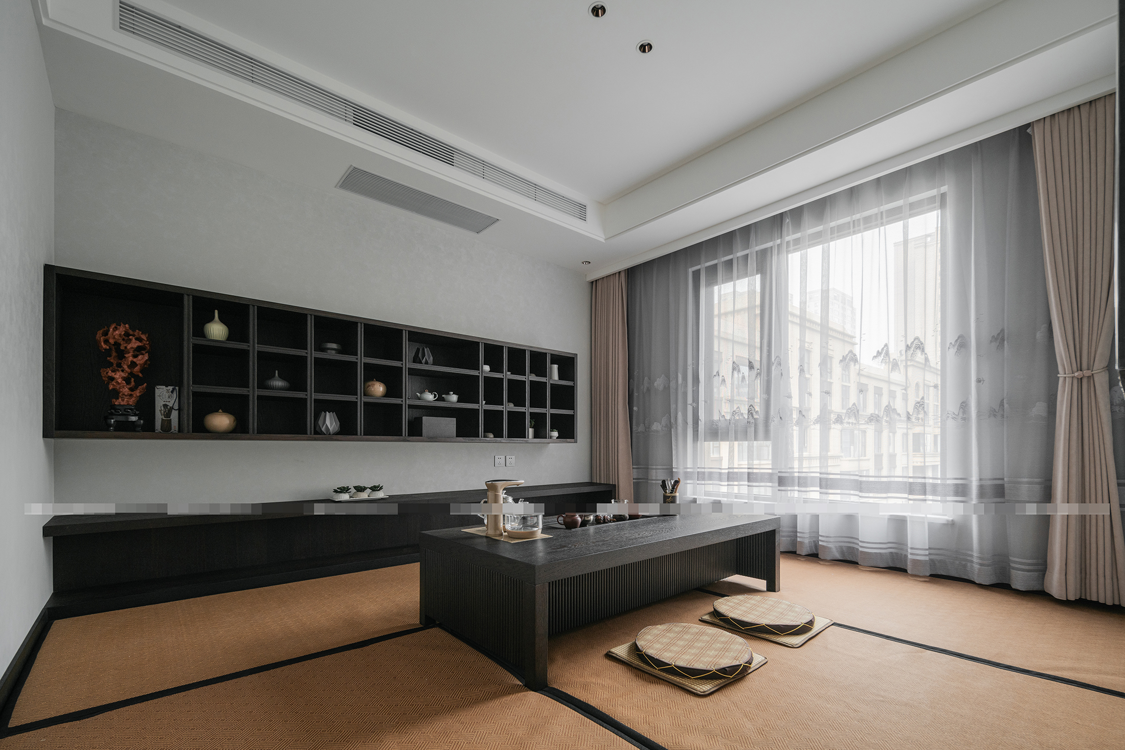 单独的茶室做成榻榻米,多功能复合式使用。考虑到鞋物摆放的不便也不美观,设计师在门口非承重墙面下方设计了凹进去的位置,增加小鞋柜。