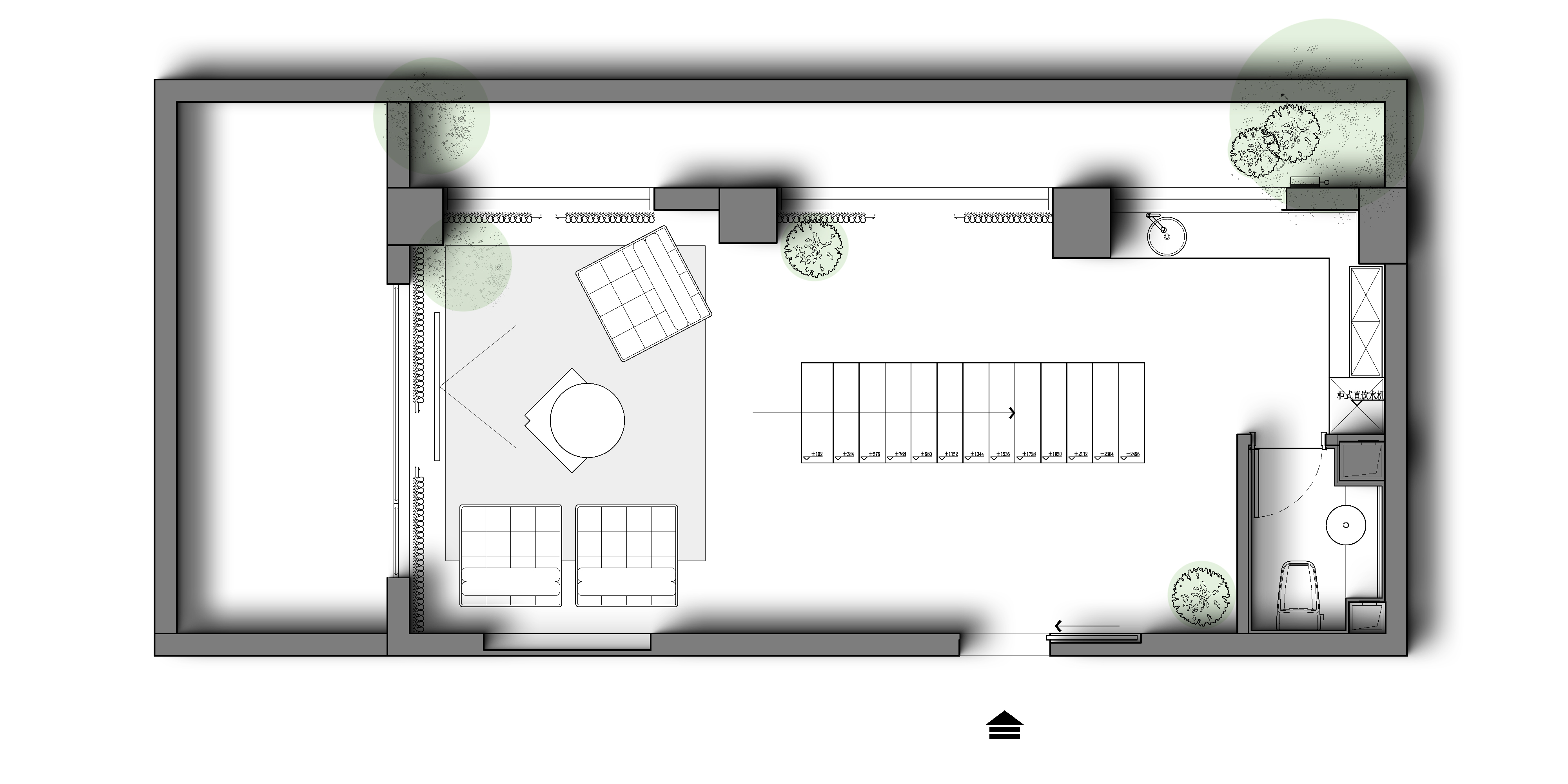 从电梯口到我们办公室门口,要经过一个长长的走廊,所以设计的时候就想设置一些让人眼前一亮的视觉效果。通过镜面的反射,把光线增加了一倍,薄薄的楼梯往楼上的办公室延伸,把会客区和办公区域做了很好的分割。