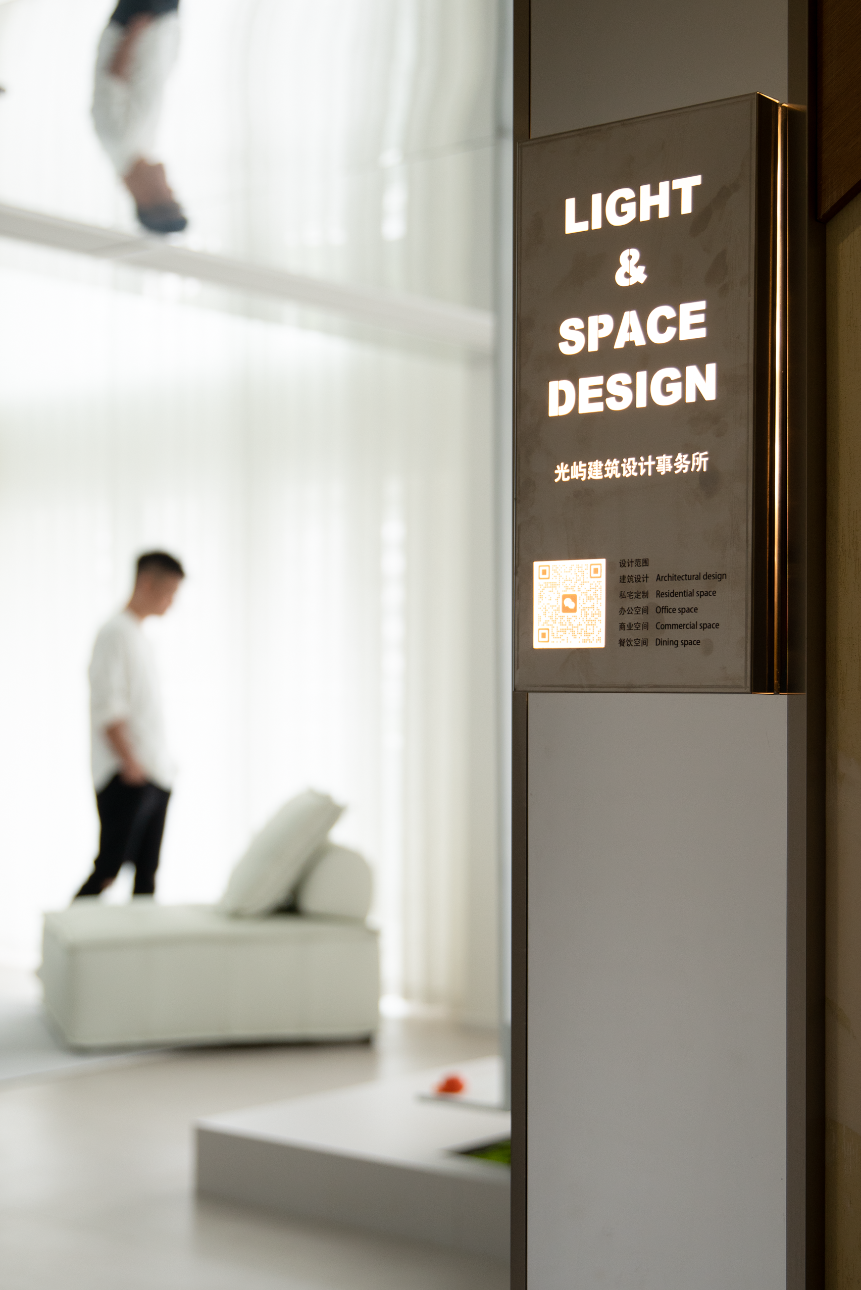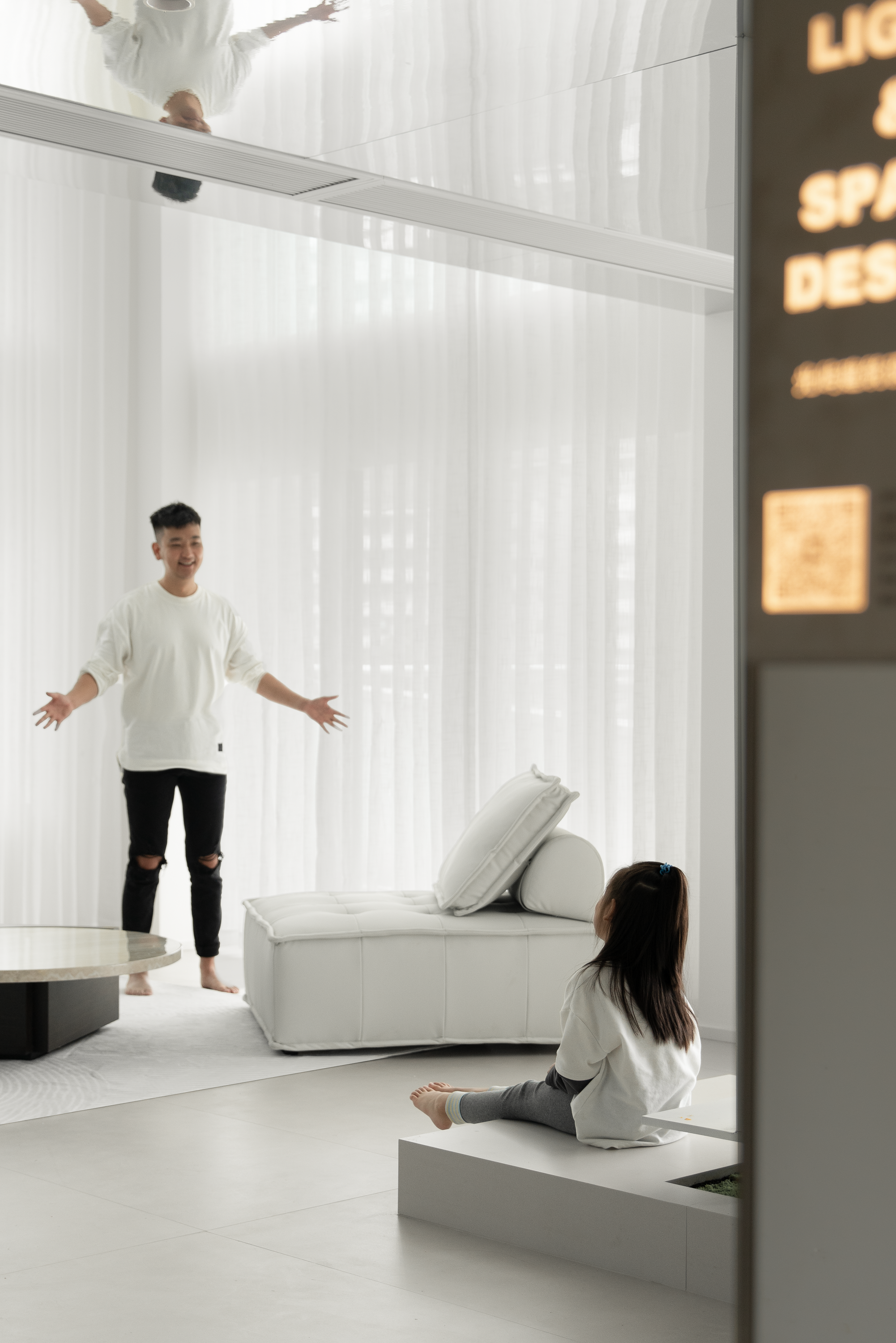 我们从办公区下楼的时候,三边都是镜面,我经常给客户开玩笑说:我从办公区下来见你们,最后的一秒钟收拾自己的脸,就靠这个镜面了。通过镜面,还忽视了空间的厚度。
