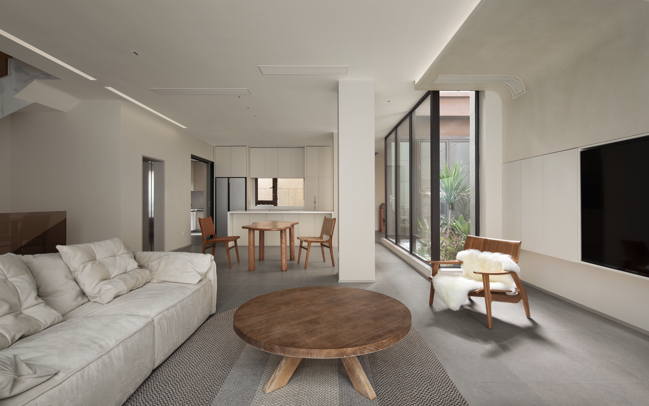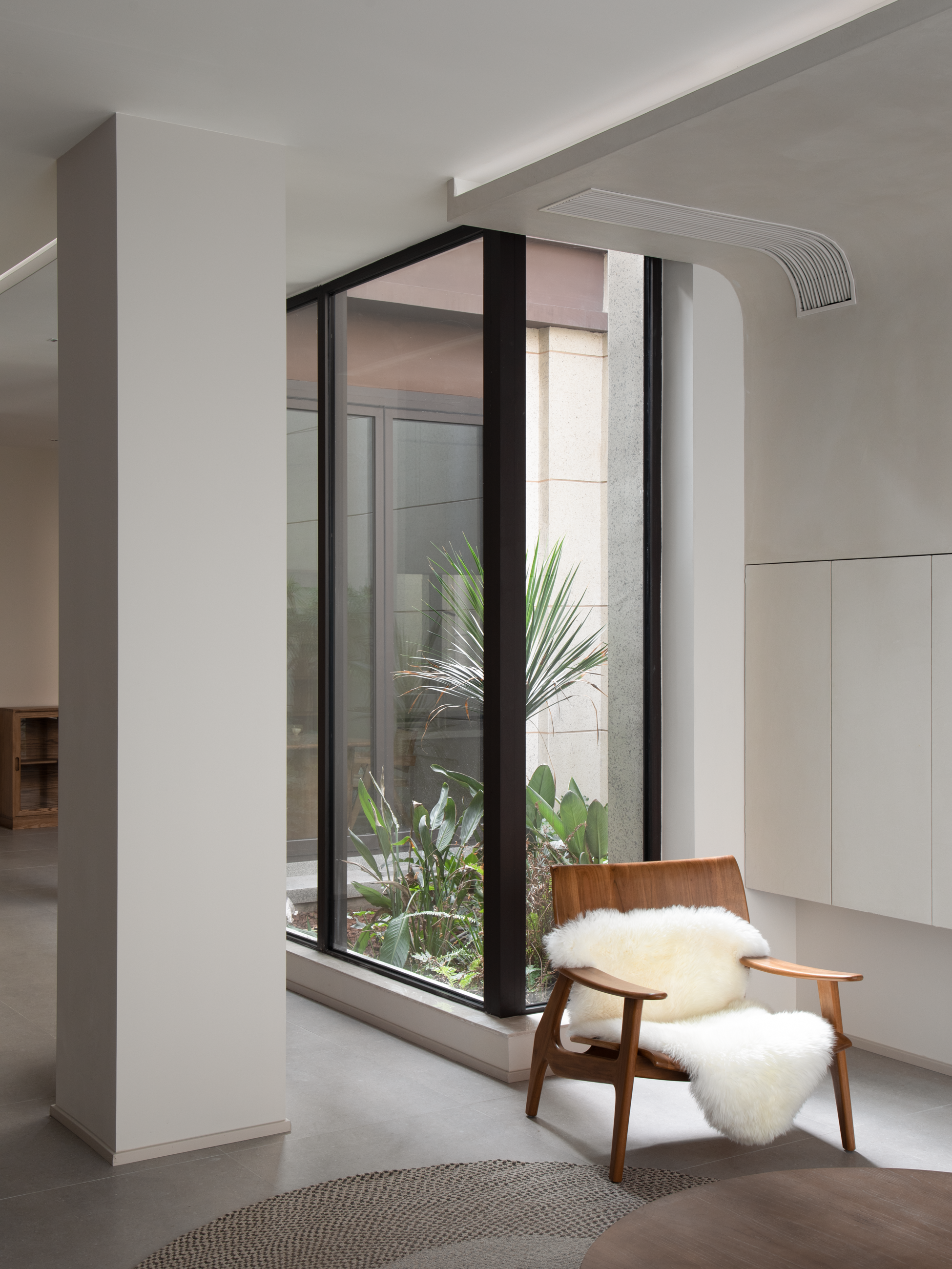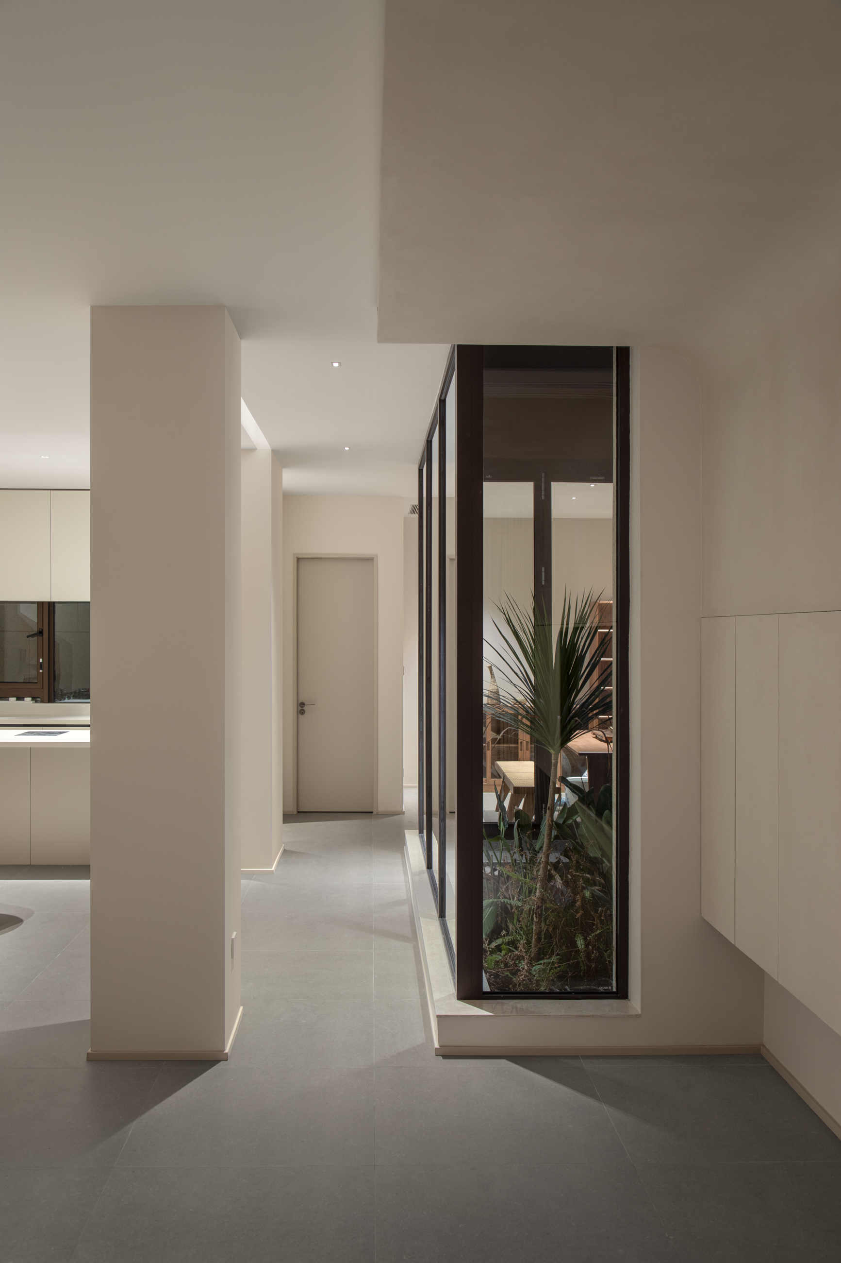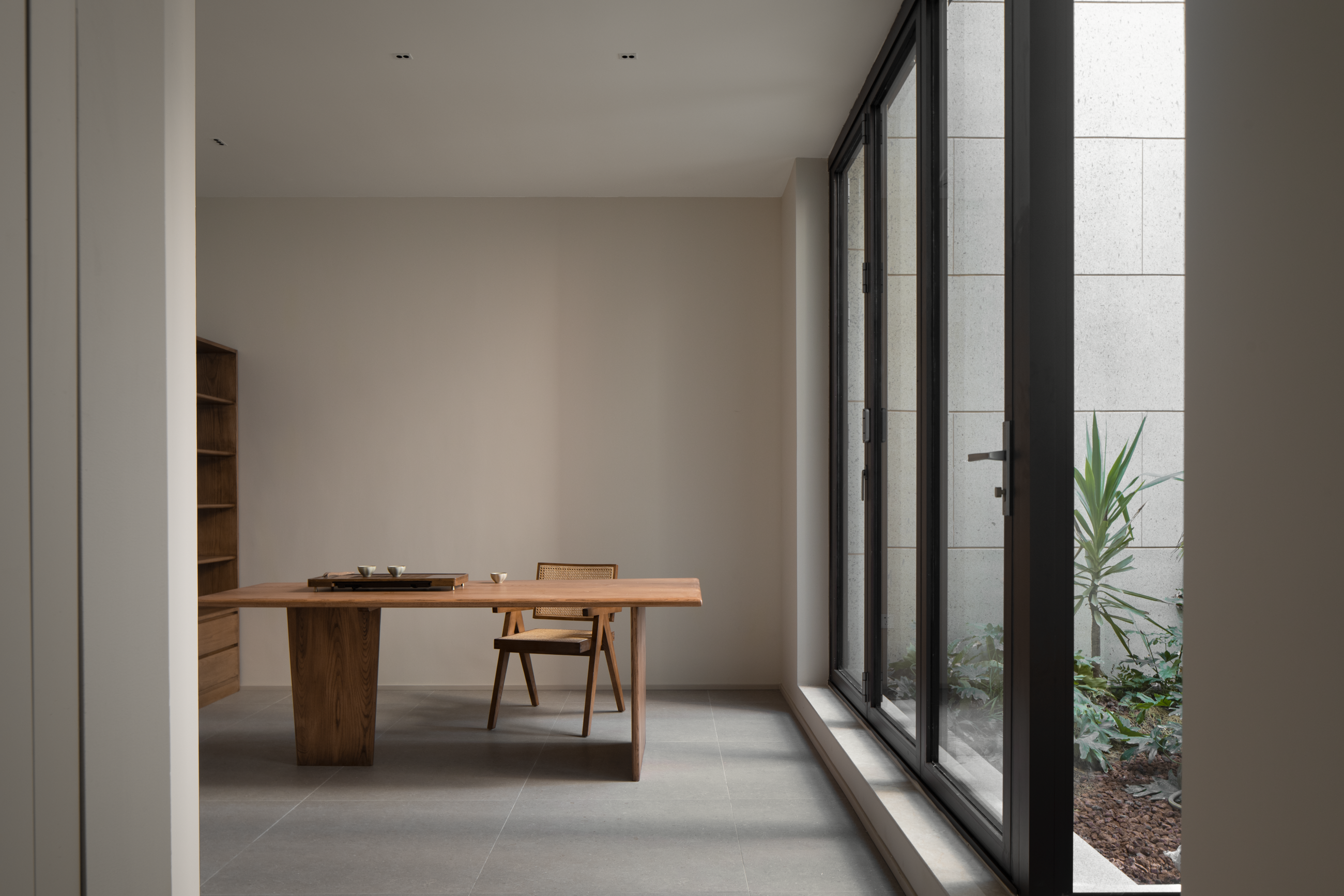 一楼有前庭花园、内庭合院式花园。如何向外纳入自然,为室内创造极佳的开阔感,且模糊室内室外的边界感,是本层的另一个思考。