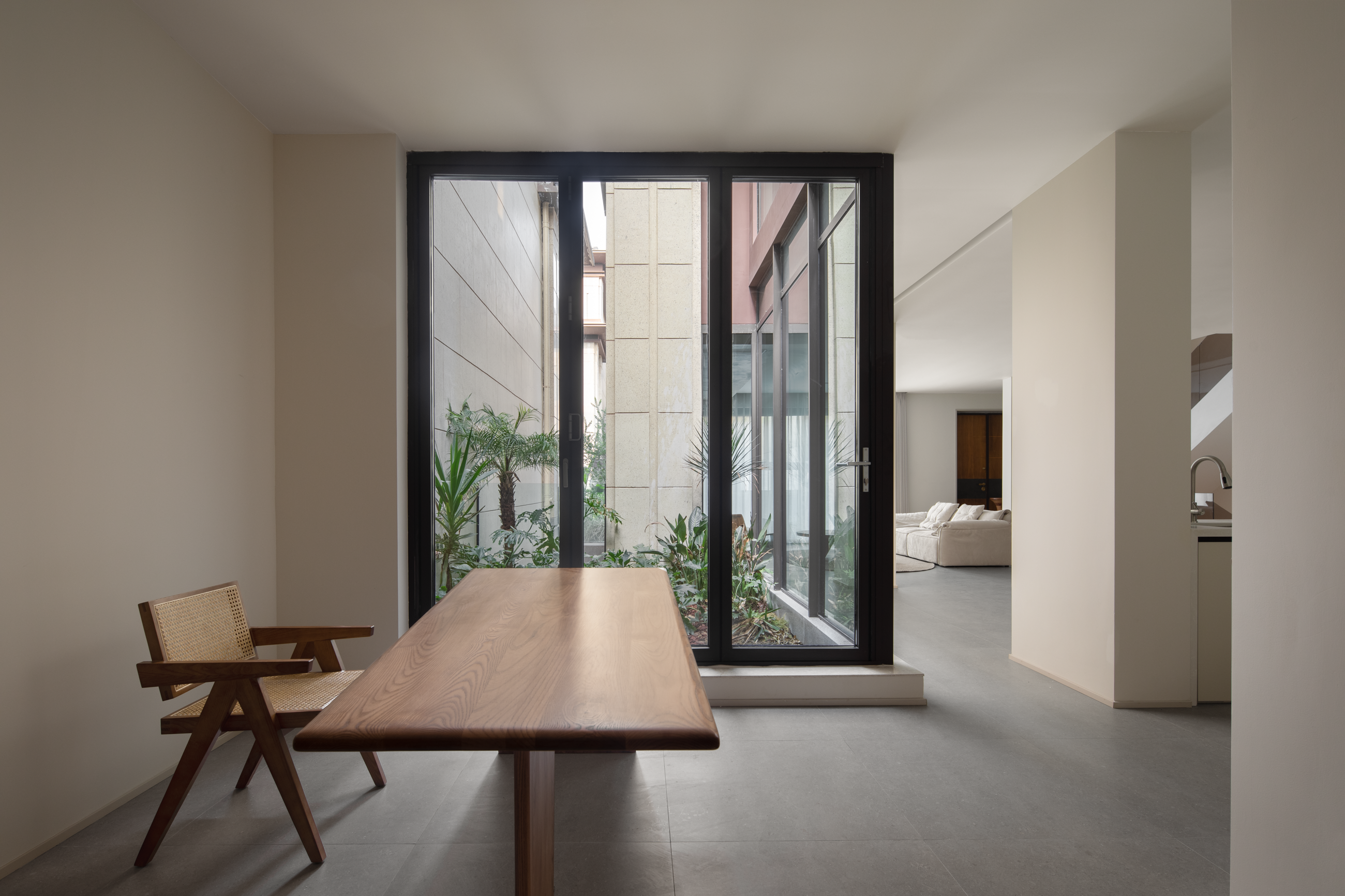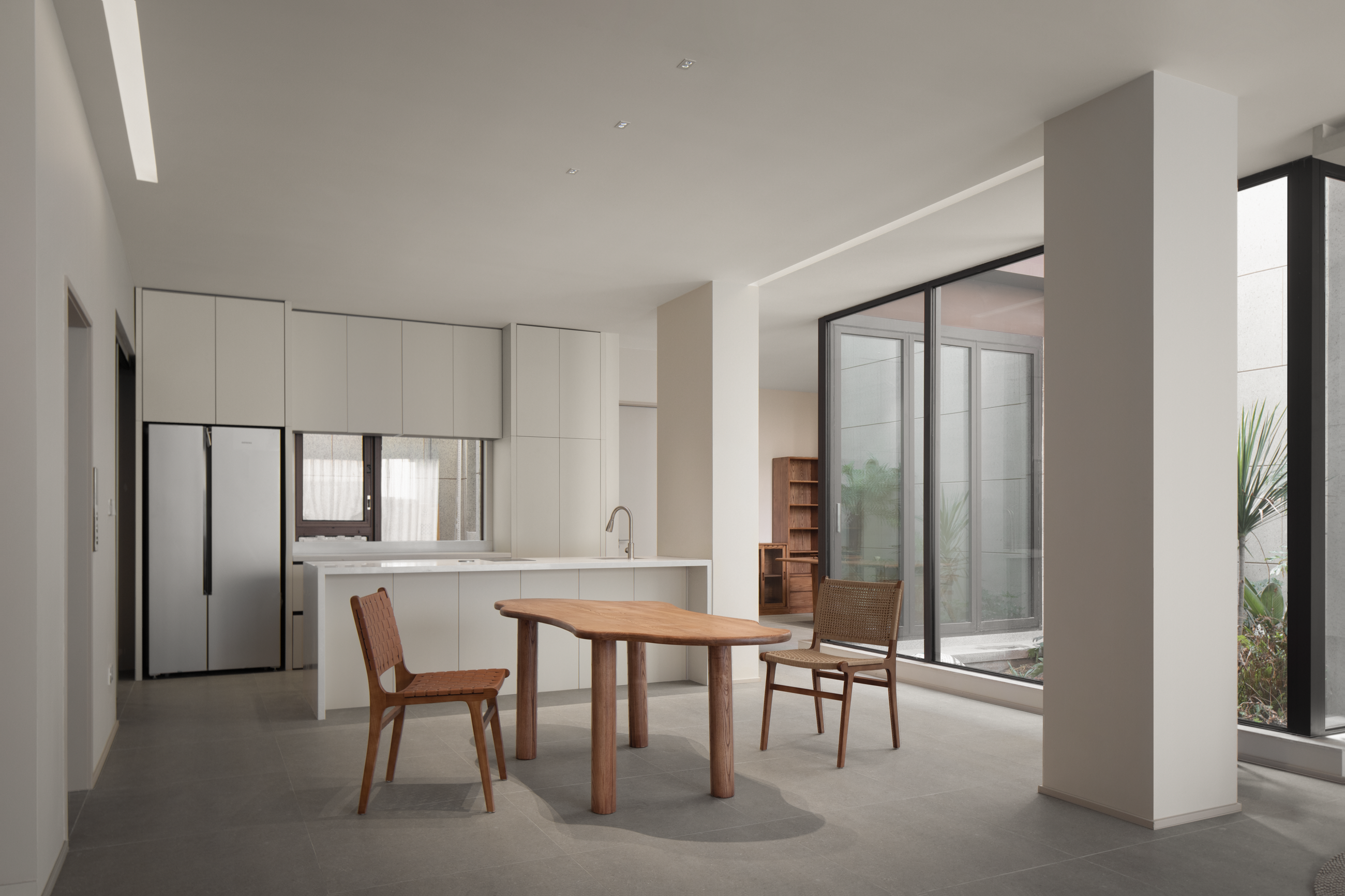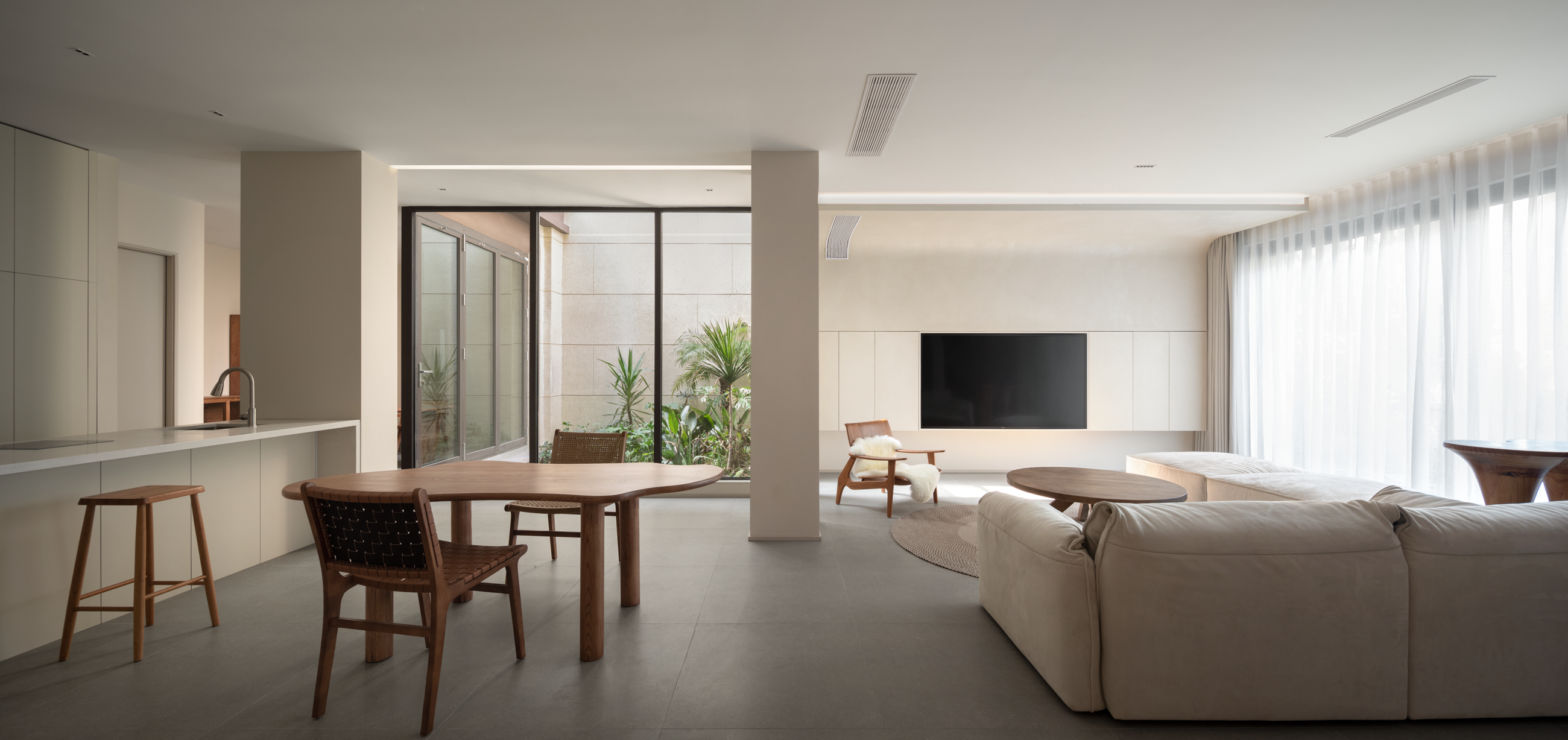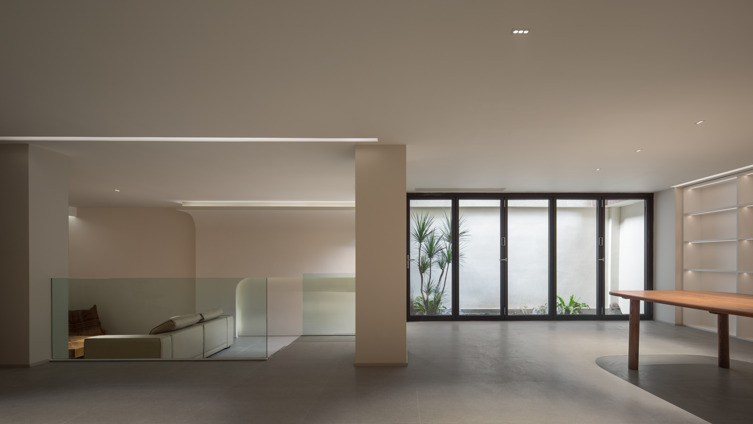 一楼有前庭花园、内庭合院式花园。如何向外纳入自然,为室内创造极佳的开阔感,且模糊室内室外的边界感,是本层的另一个思考。