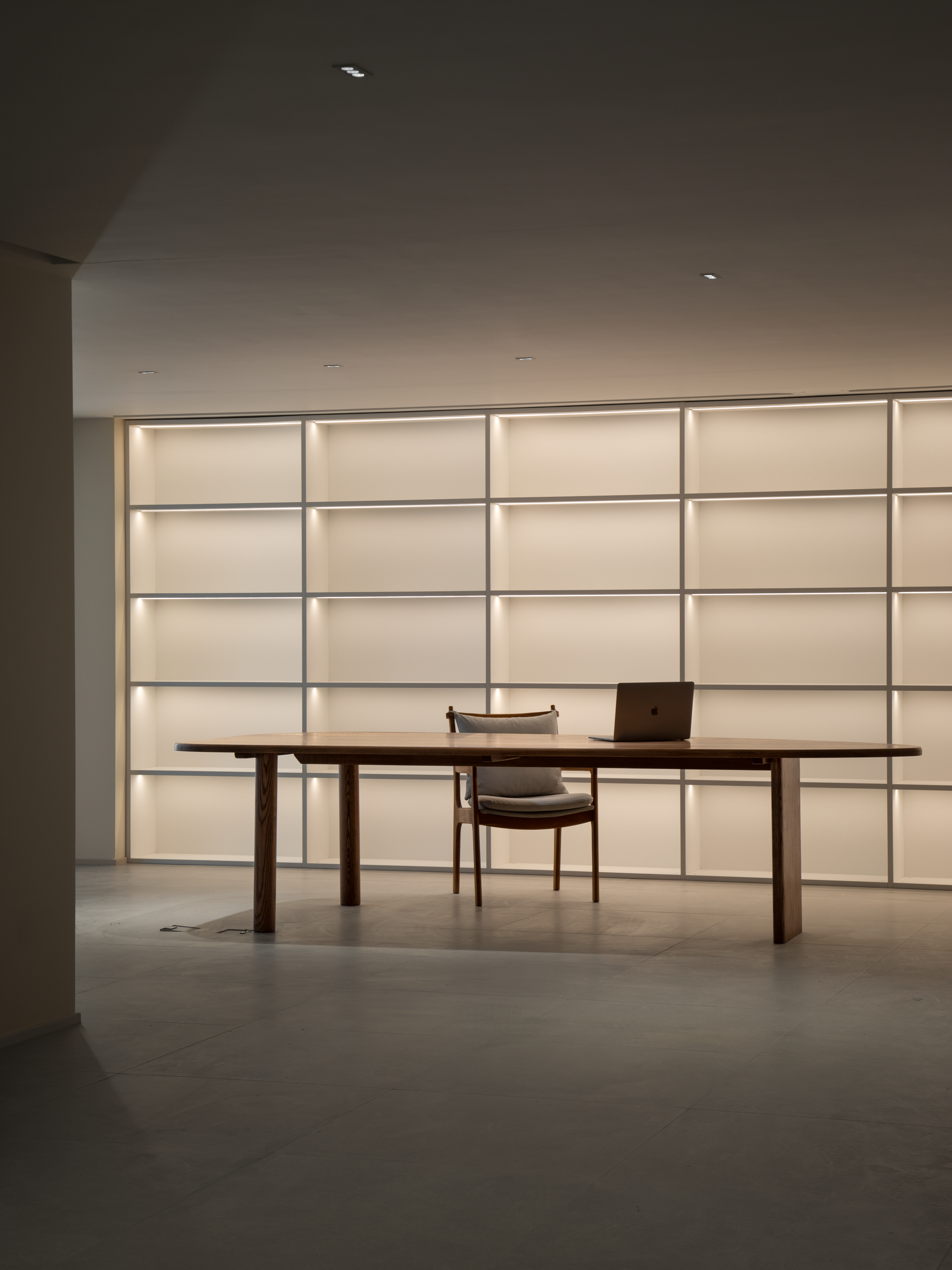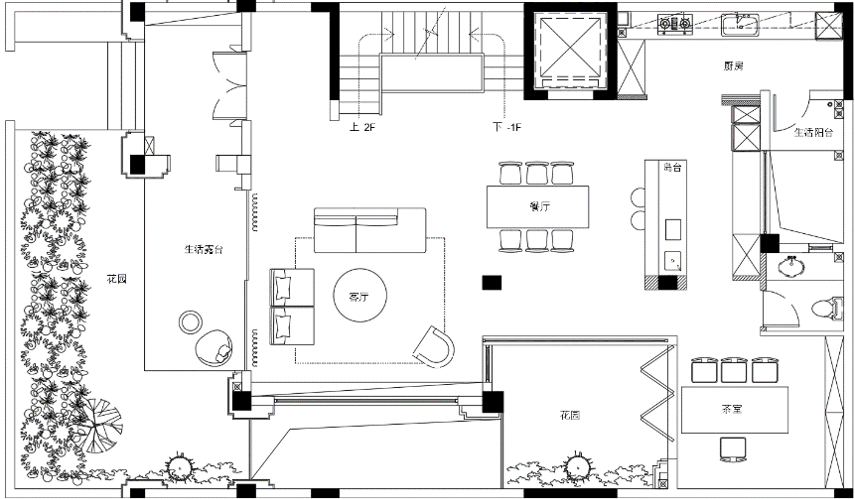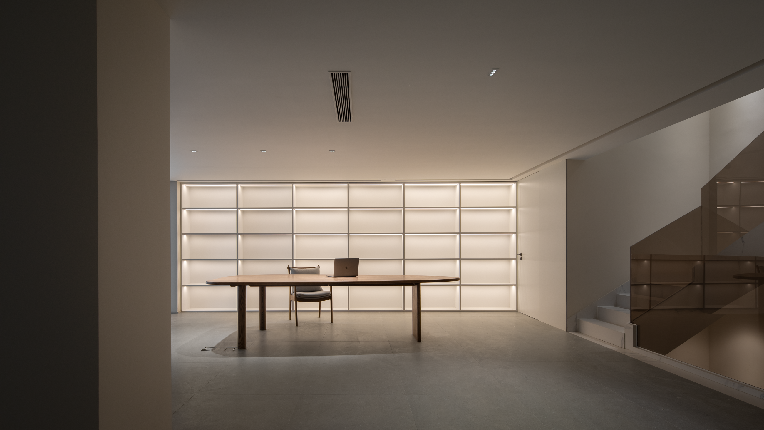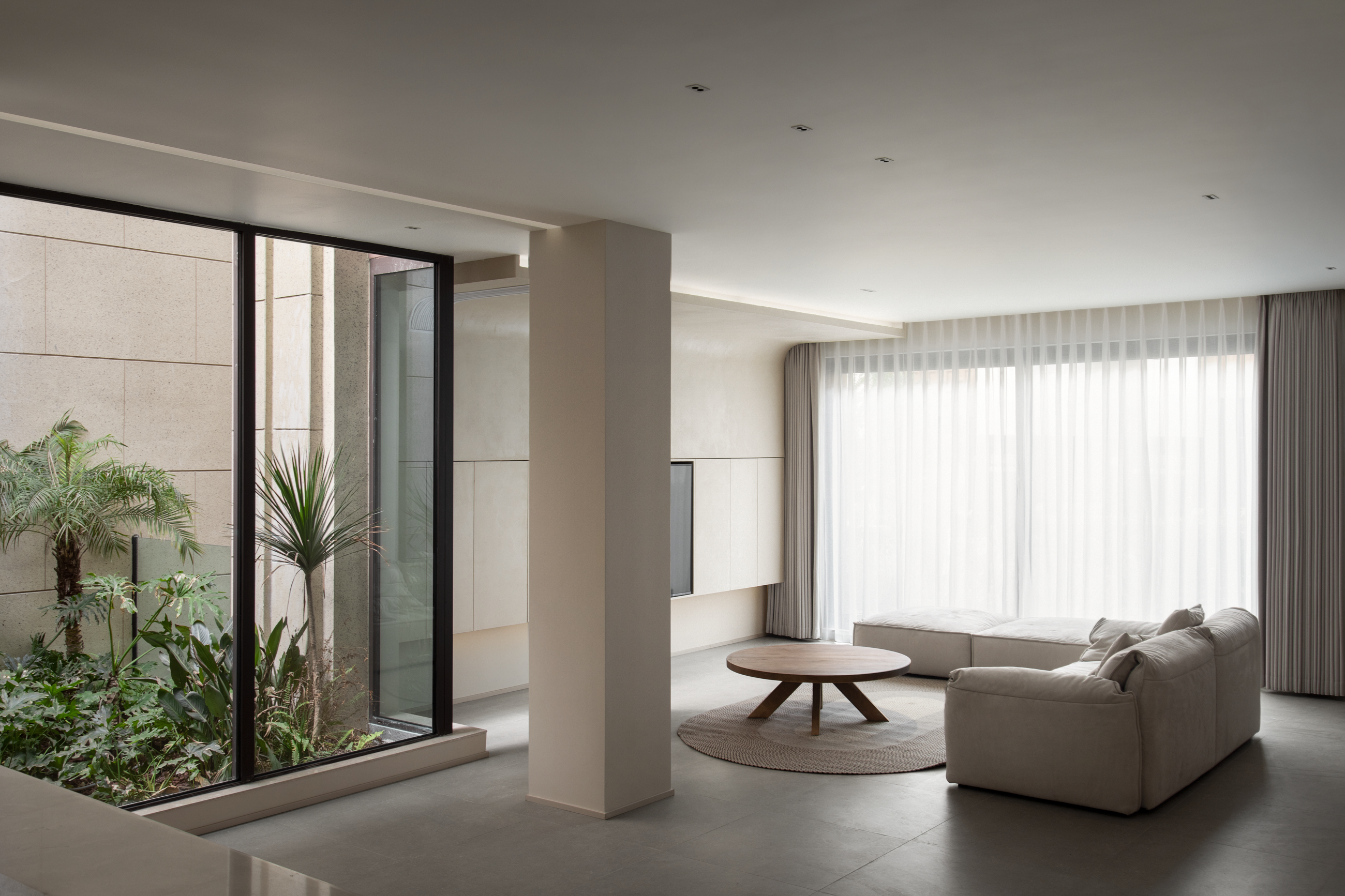 一楼有前庭花园、内庭合院式花园。如何向外纳入自然,为室内创造极佳的开阔感,且模糊室内室外的边界感,是本层的另一个思考。
