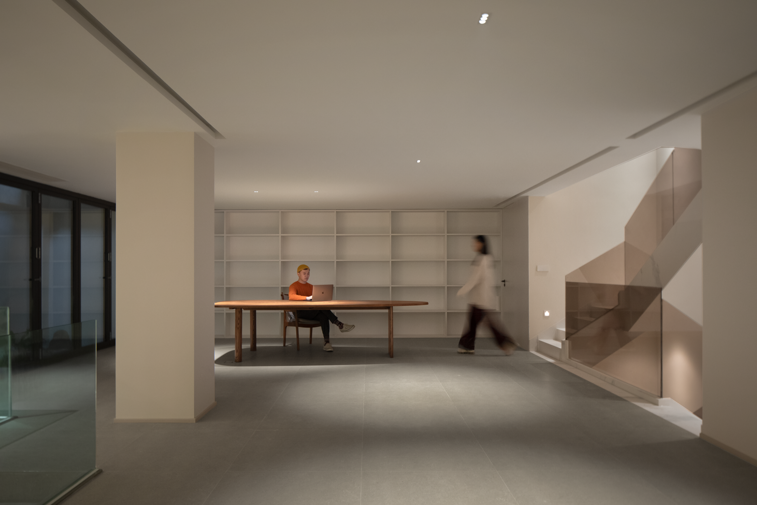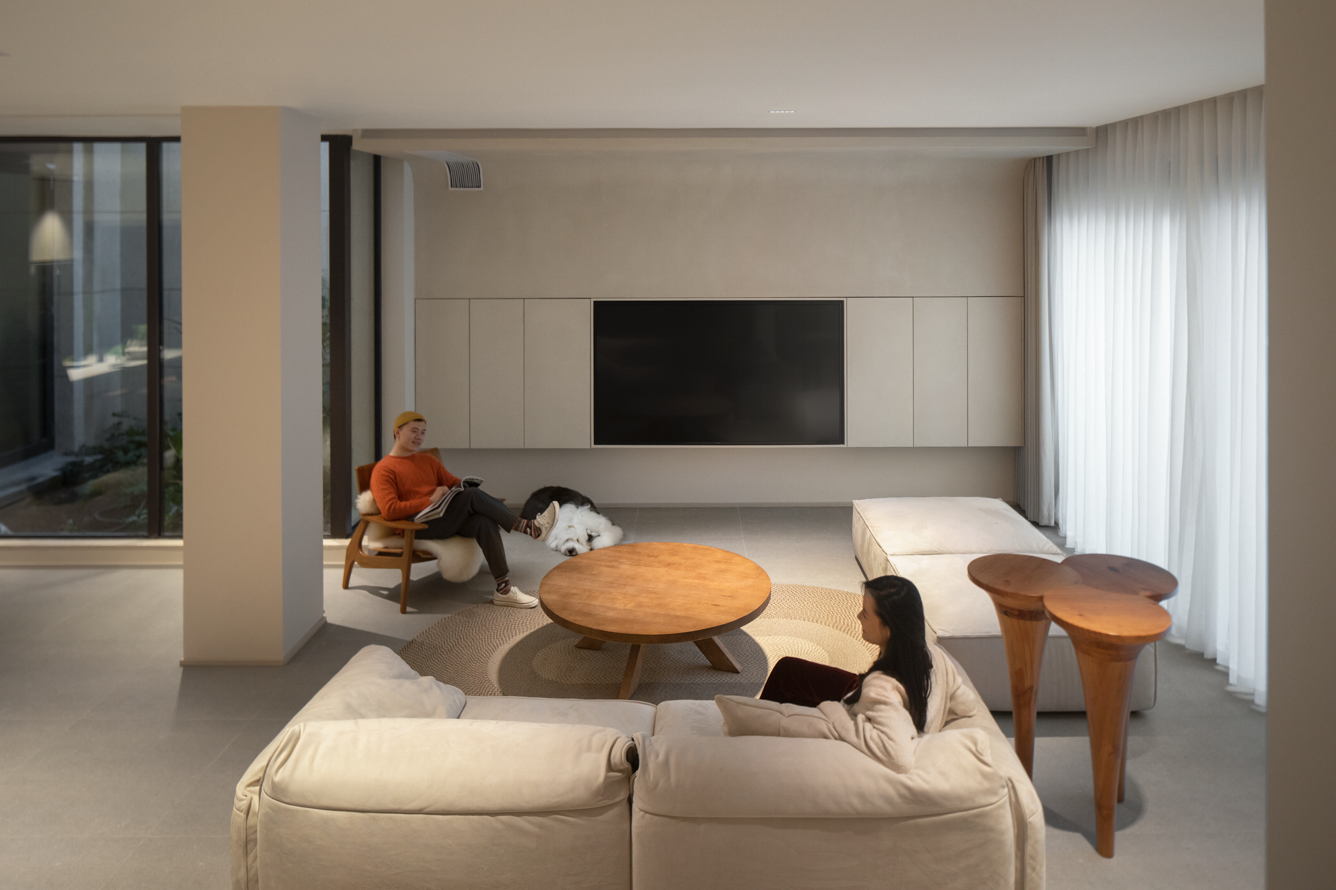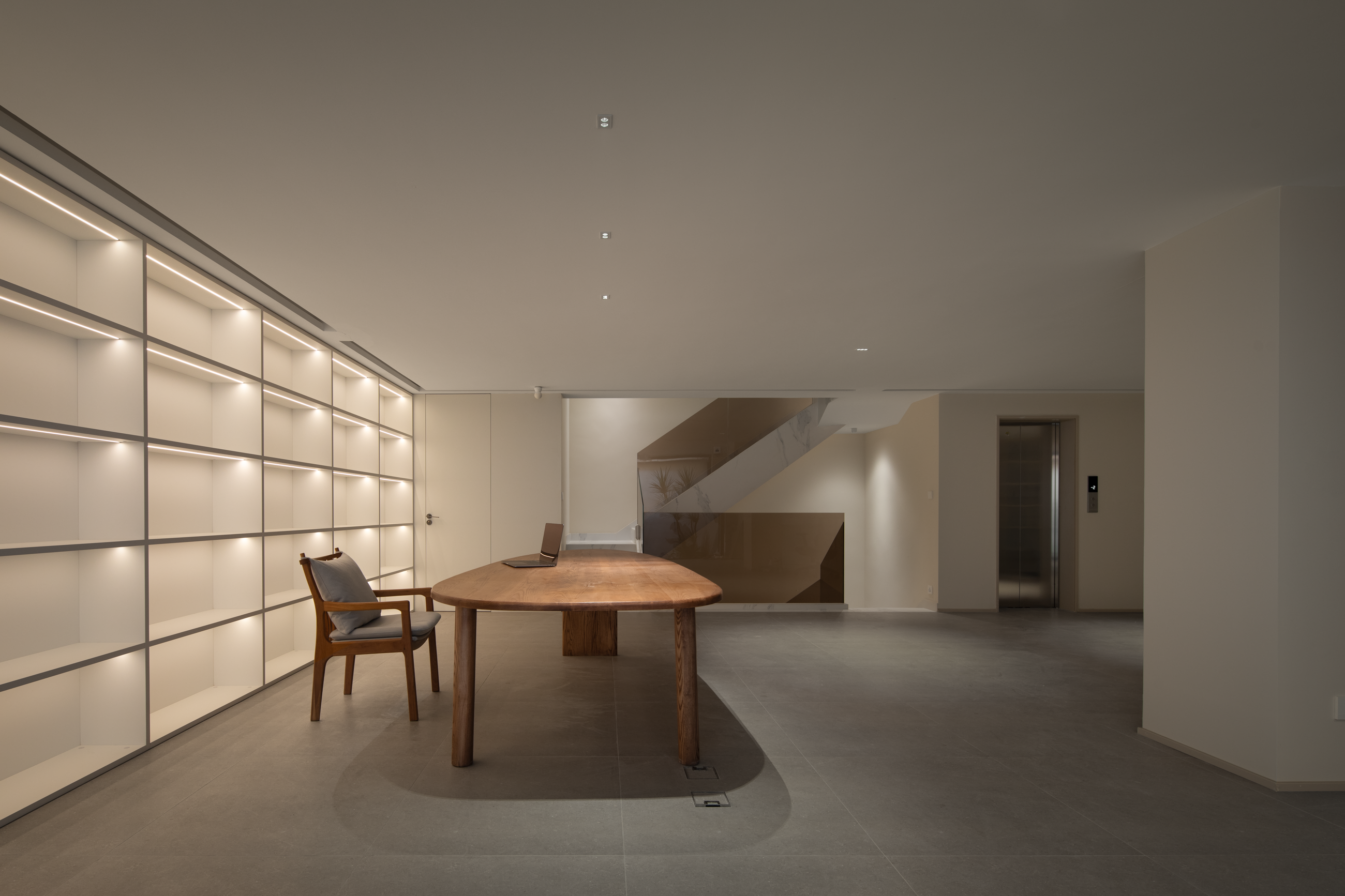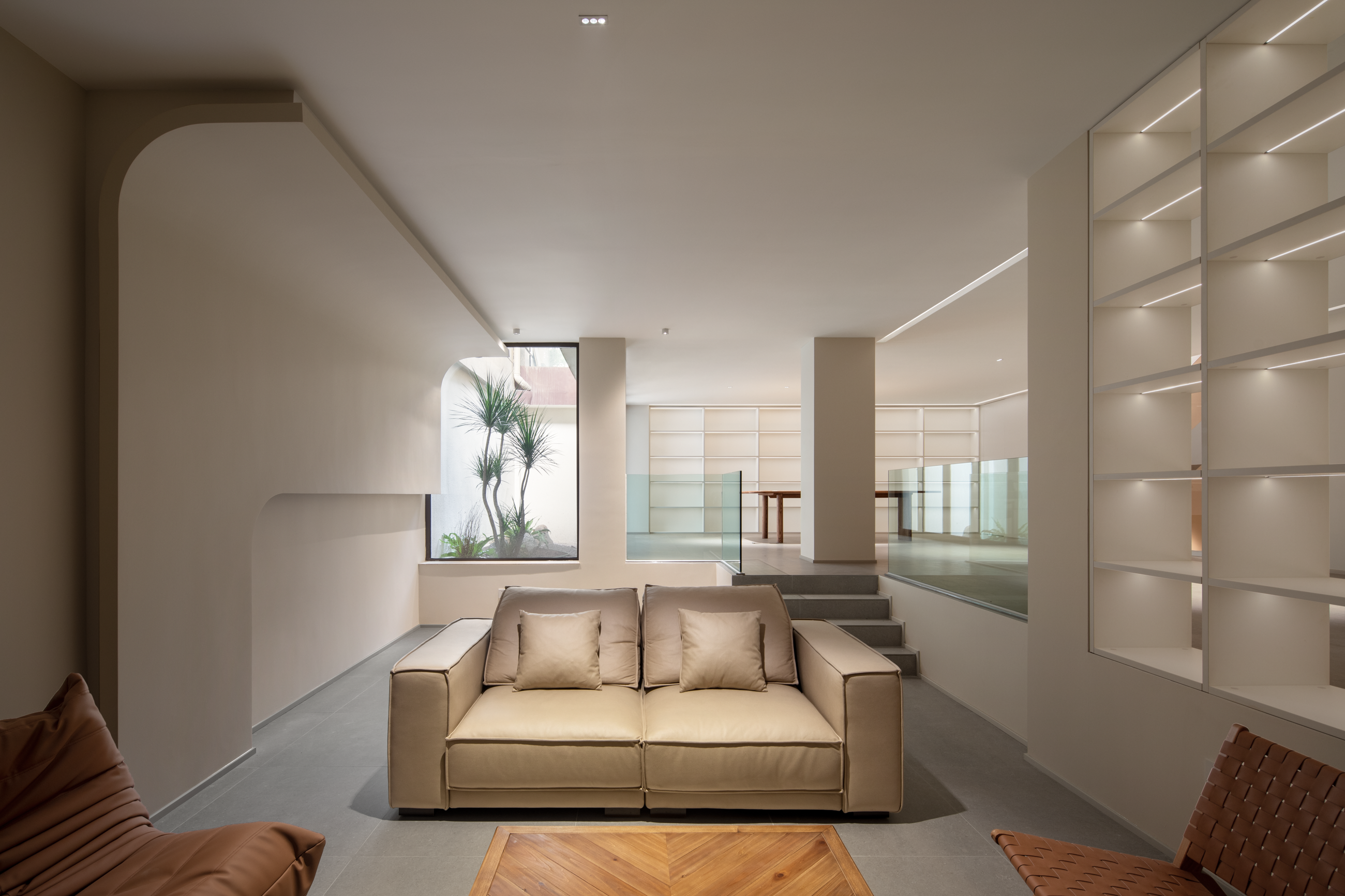 负一楼、负二楼原为一个高层高的单层空间,为赠送区域,我们通过错层的设计将其分为两层。负二楼主要以实用为主,满足洗衣、保姆居住、储物、维修、货物拆卸等功能,并兼具车库到主屋的过厅。负一楼为多功能活动区,可以看电影、健身、阅读、办公、聚会。在该层,我们设计了一个下沉观影区域,通过空间的叠错增加结构感。居住者能选择共处或独享角落,自由运用,增添生活乐趣。同时,由于原结构无任何采光、通风,我们设计了天井,打造绿植内景,引入天光,增加自然气息。