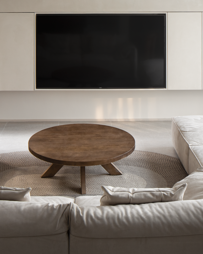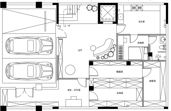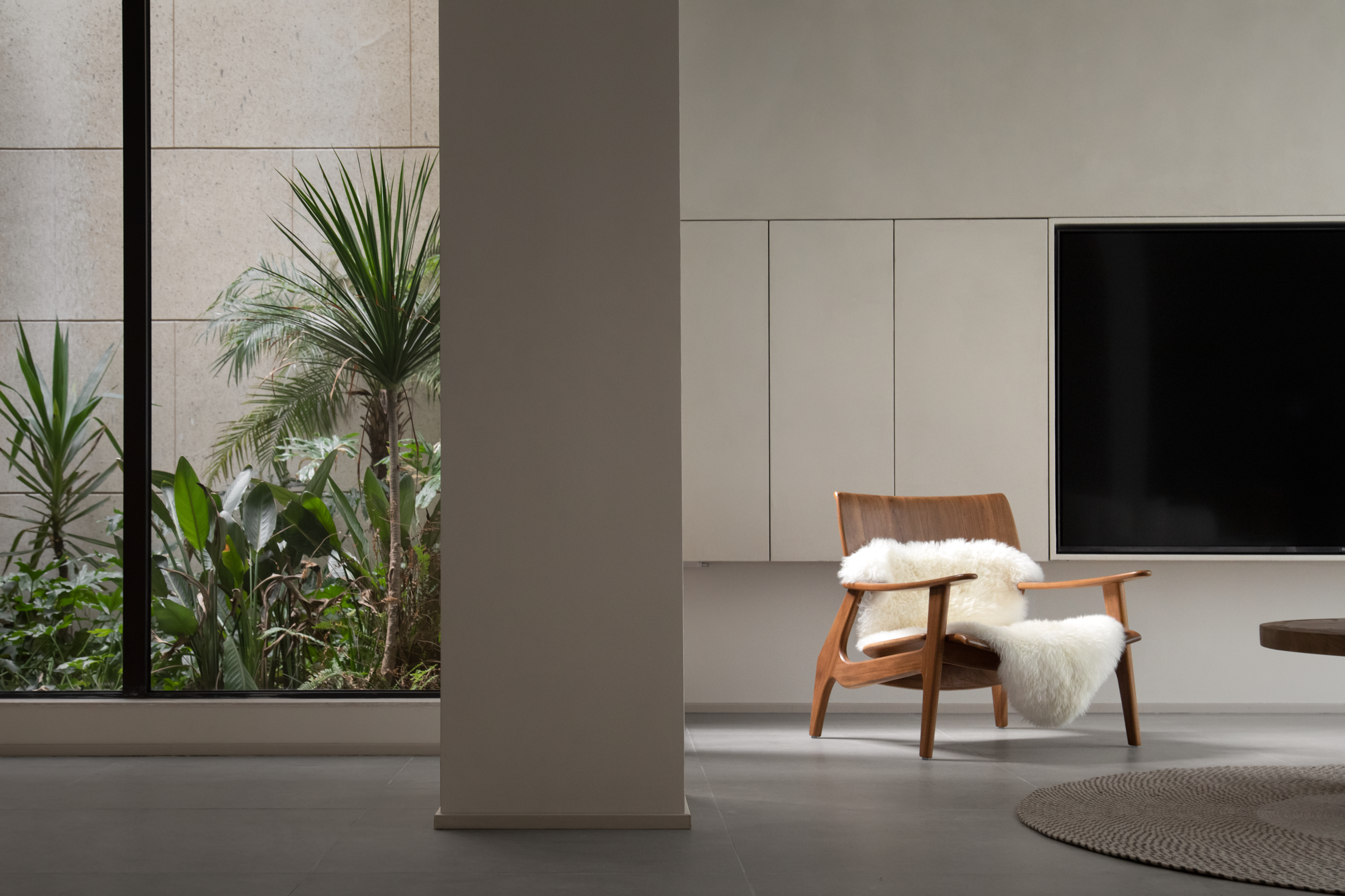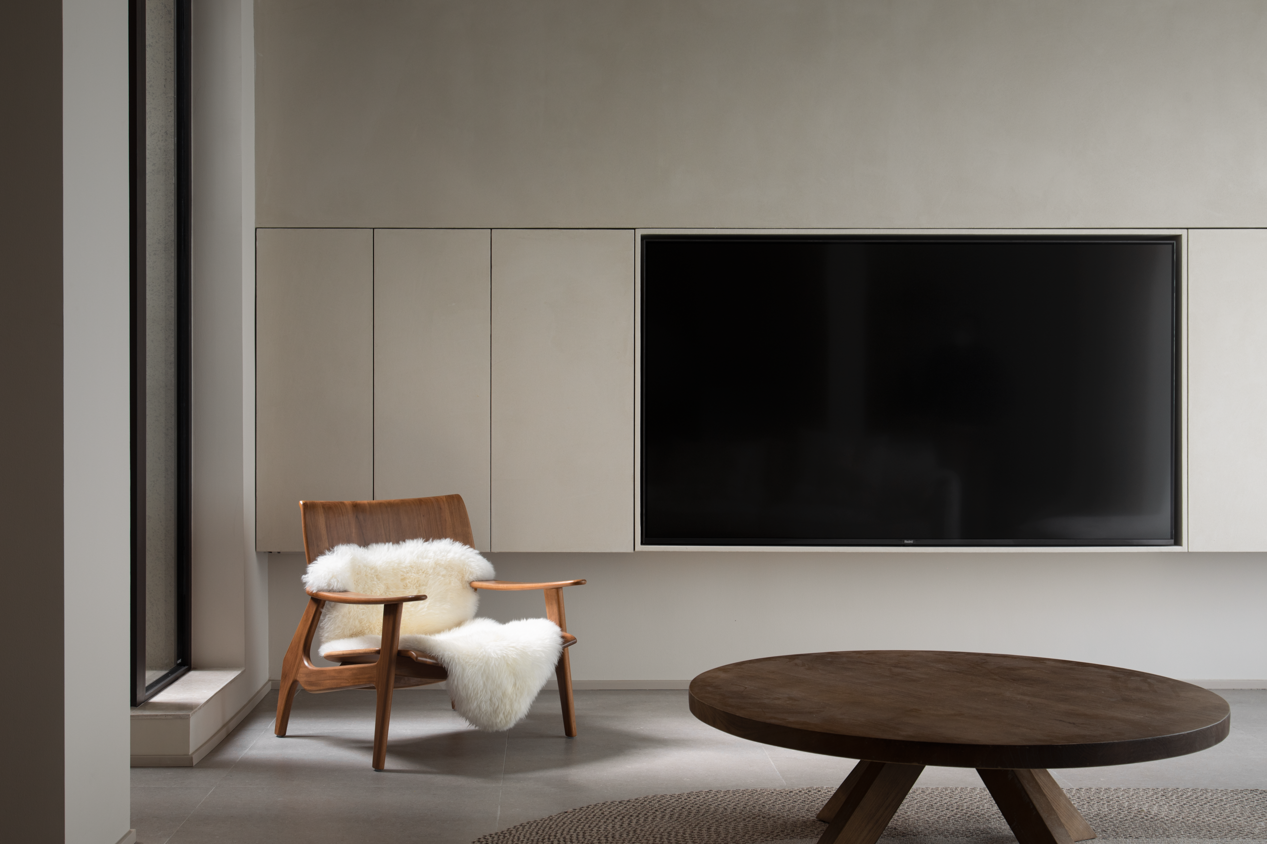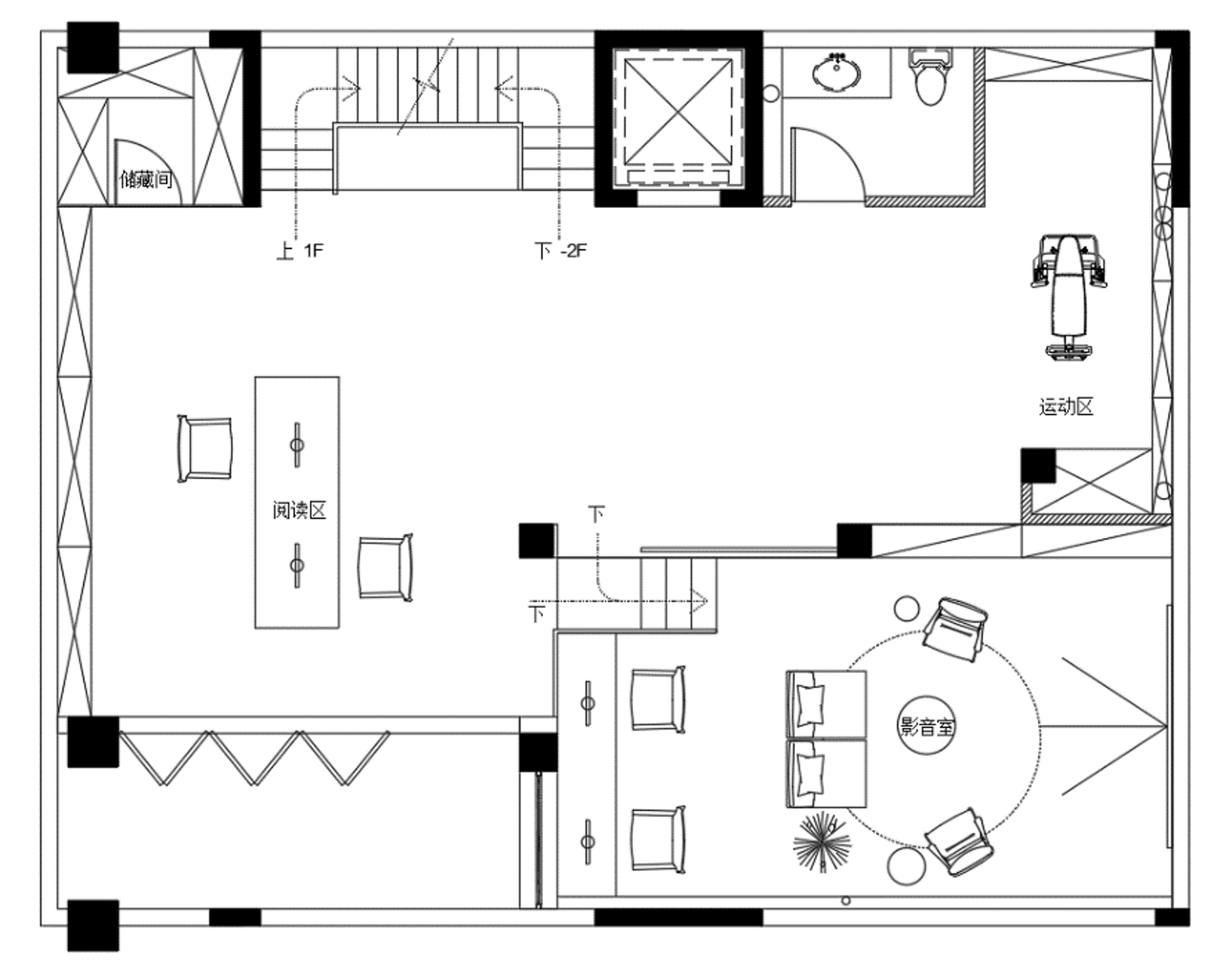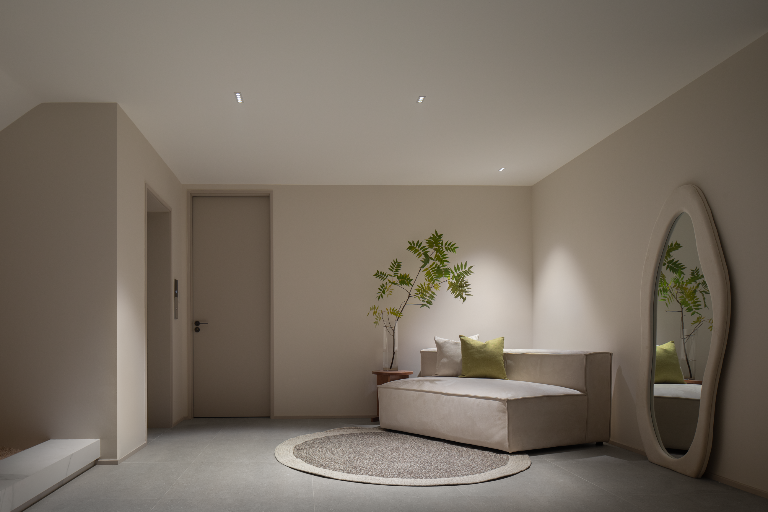 负一楼、负二楼原为一个高层高的单层空间,为赠送区域,我们通过错层的设计将其分为两层。负二楼主要以实用为主,满足洗衣、保姆居住、储物、维修、货物拆卸等功能,并兼具车库到主屋的过厅。负一楼为多功能活动区,可以看电影、健身、阅读、办公、聚会。在该层,我们设计了一个下沉观影区域,通过空间的叠错增加结构感。居住者能选择共处或独享角落,自由运用,增添生活乐趣。同时,由于原结构无任何采光、通风,我们设计了天井,打造绿植内景,引入天光,增加自然气息。