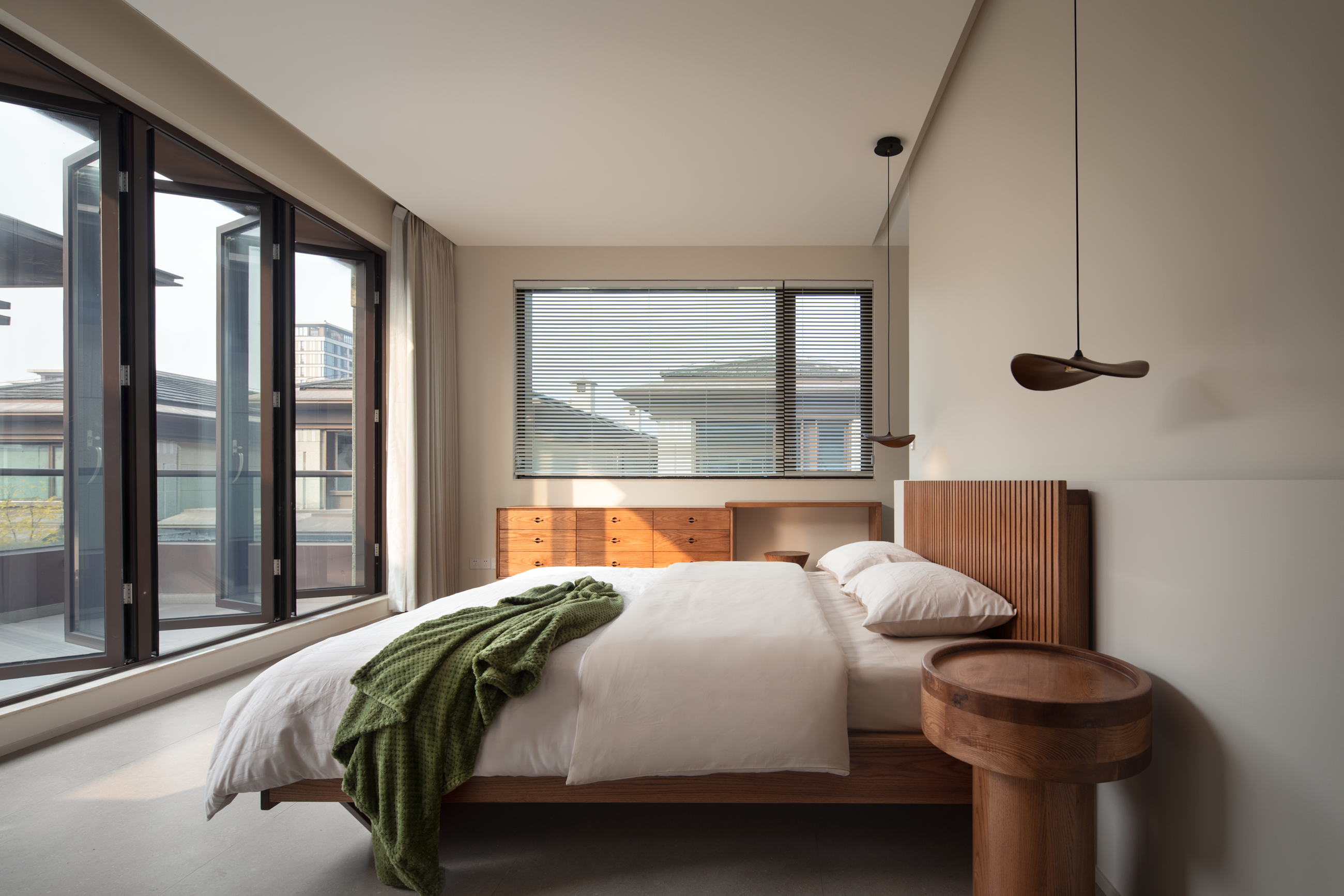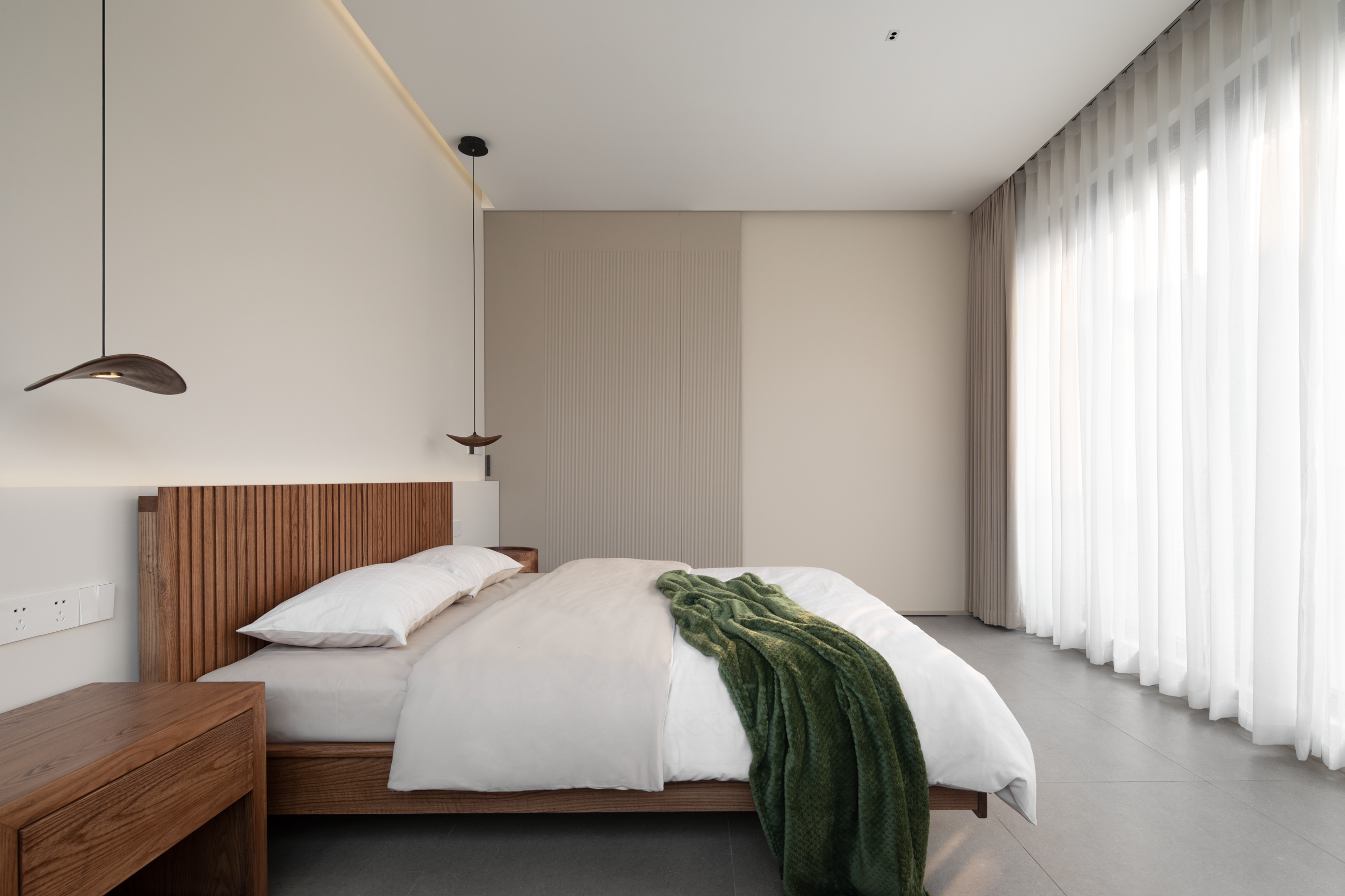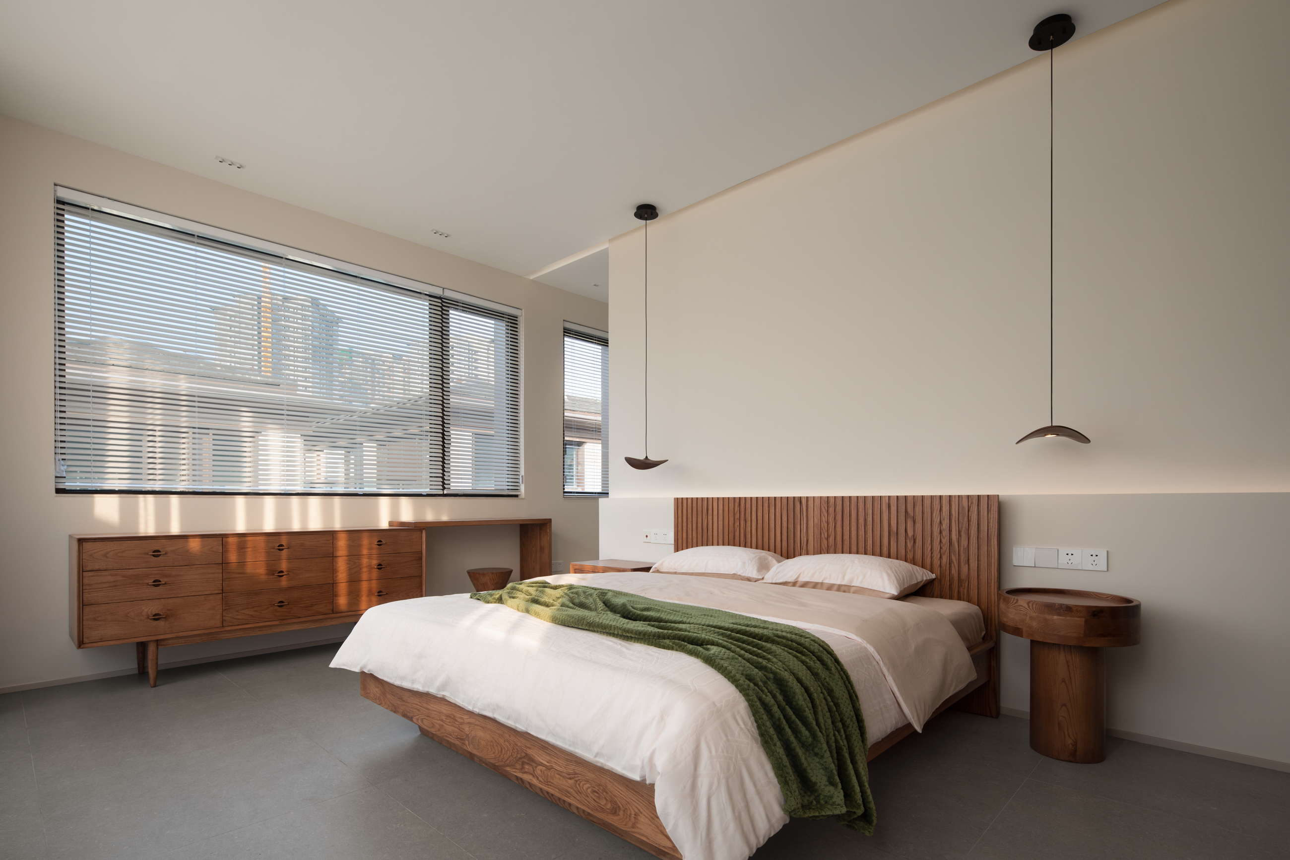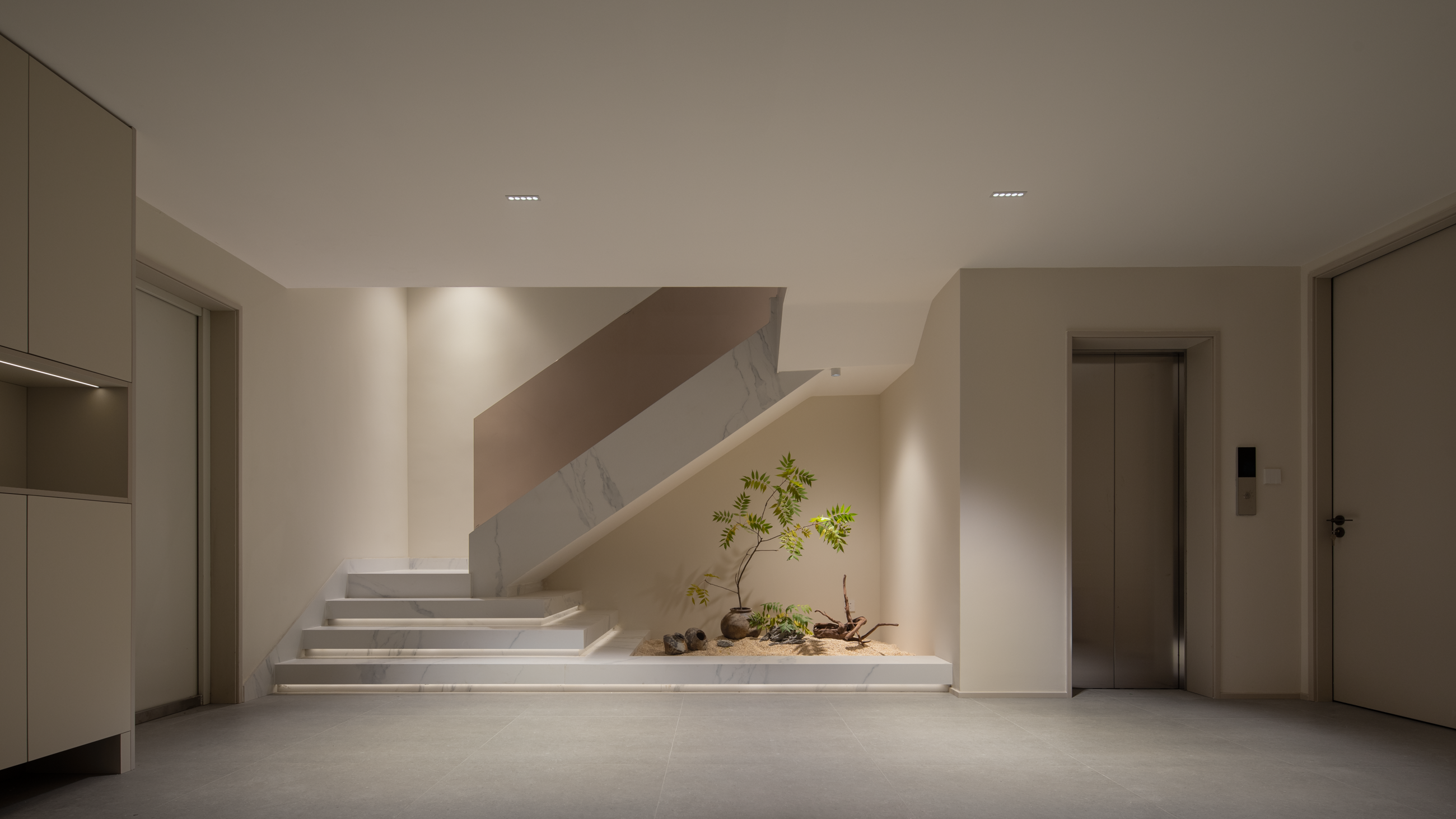 空间意境:本项目结构为合院小别墅,共五层。我们没有刻意突出别墅的奢华属性,仅利用合院花园的空间结构特征,融入自然、简约、氧气感,让每层空间均能看见自然景观。我们抹去了别墅空间的高净值人群定位标签,让空间单纯成为一对90后夫妇的舒适、自在的家。