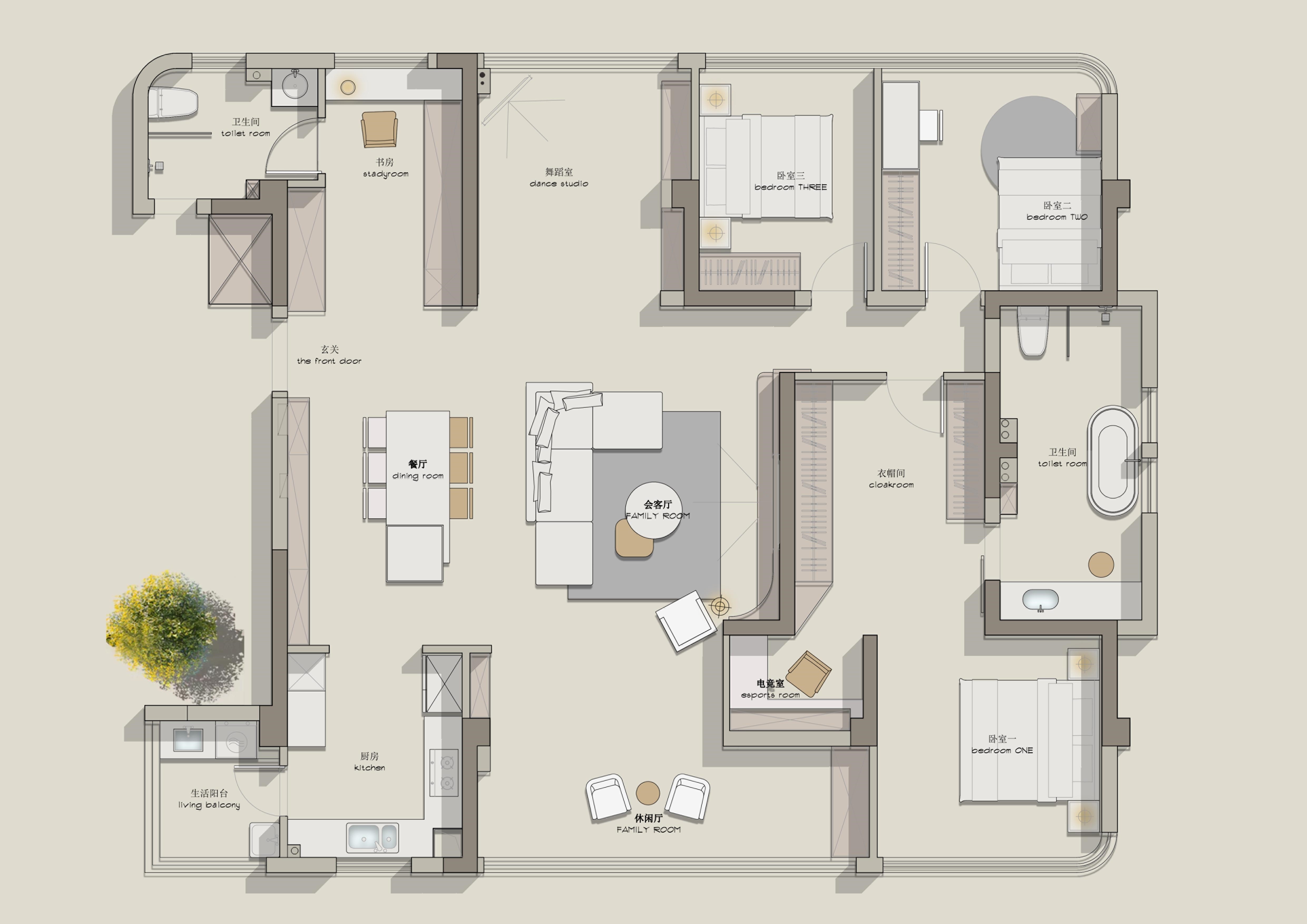 尽量扩大公区面积保证充足的采光和通风,同时满足男女主人各自兴趣和爱好。