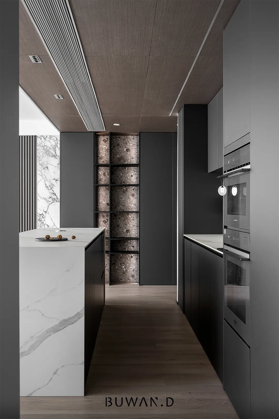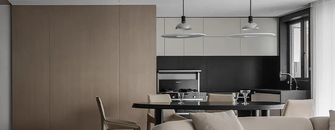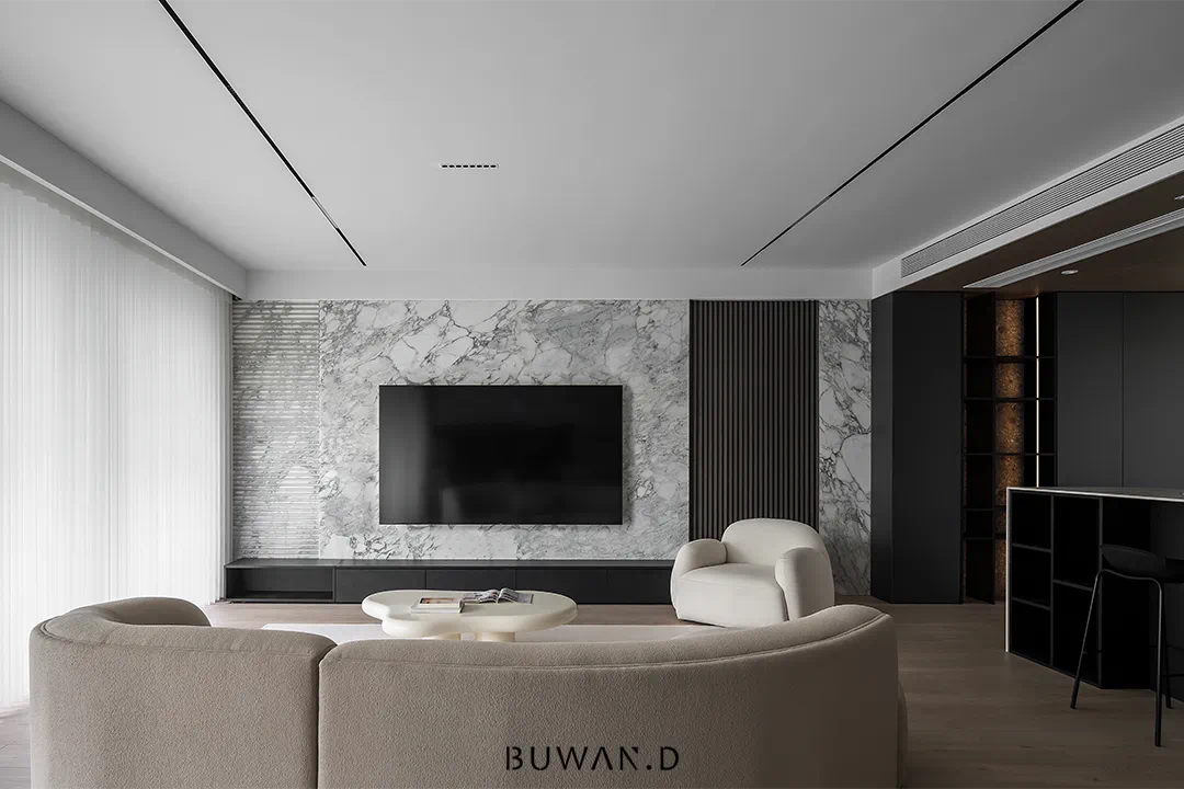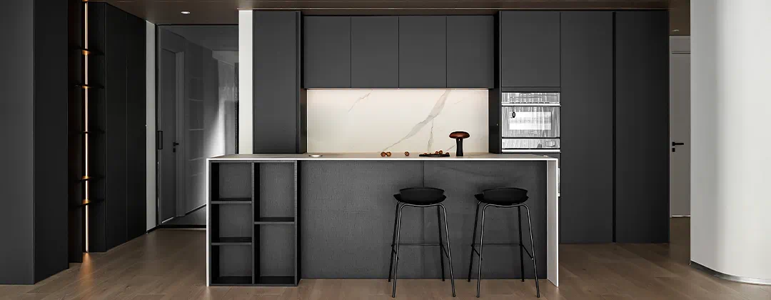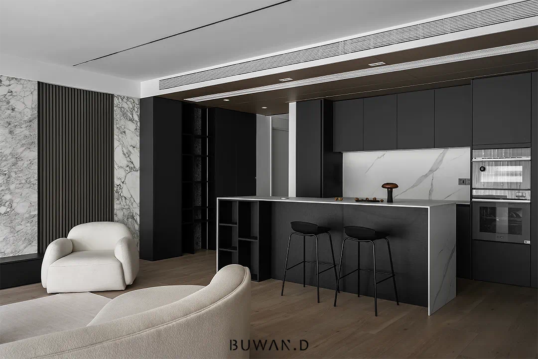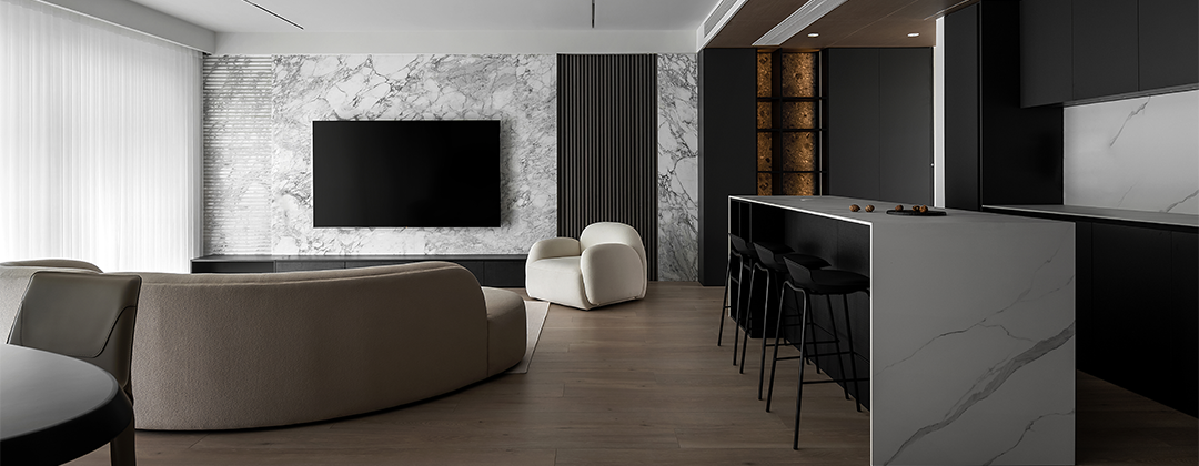 选择稳定可靠的材料,岩板、石材、木饰面。