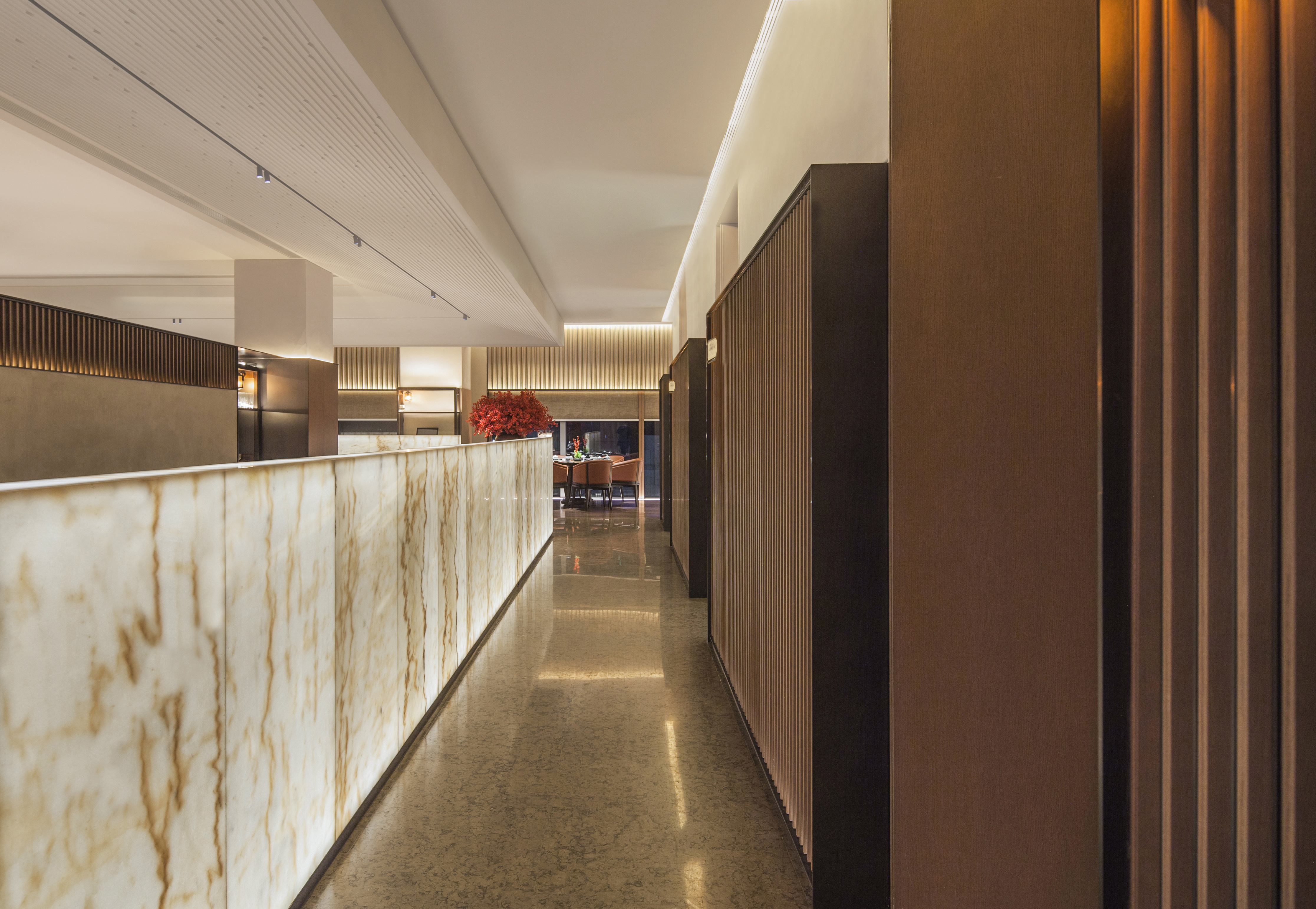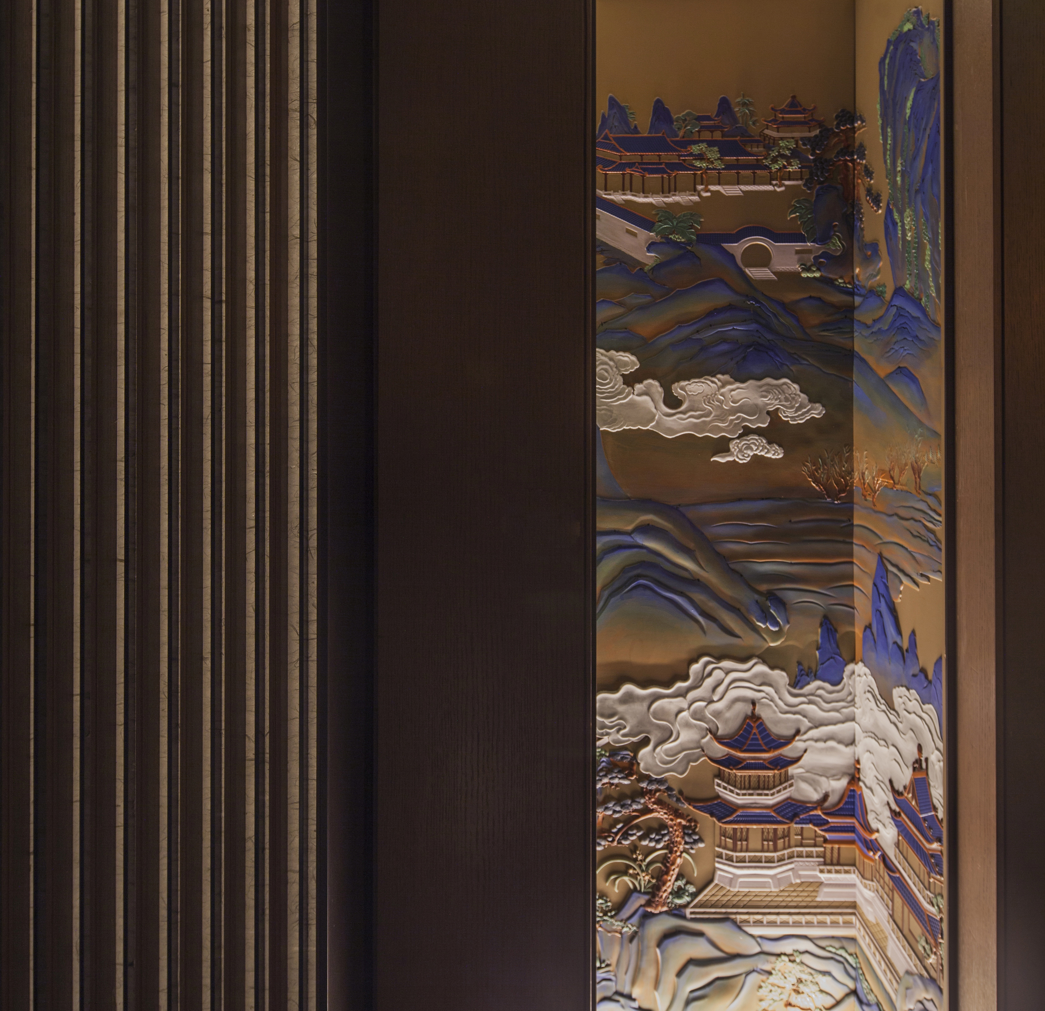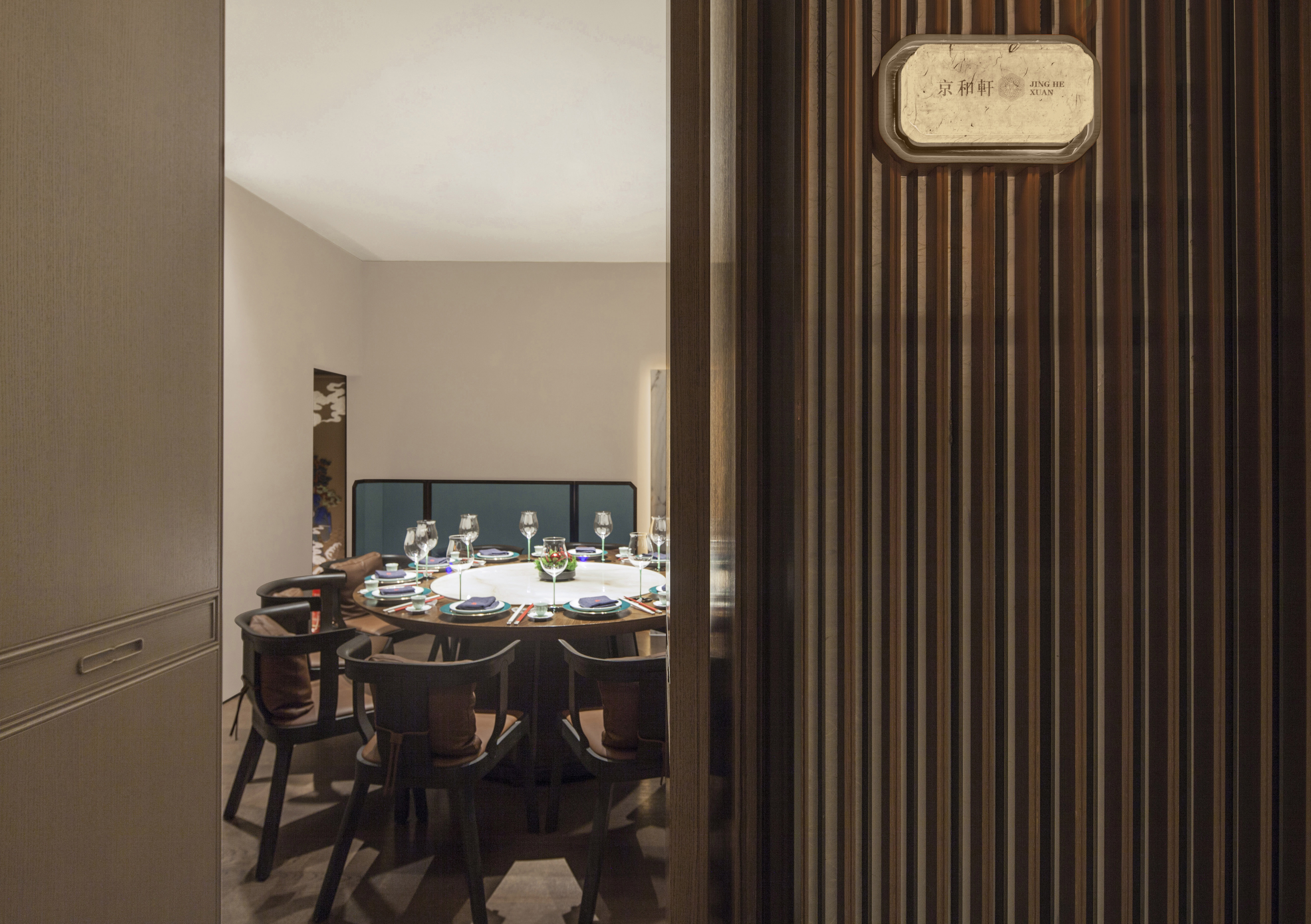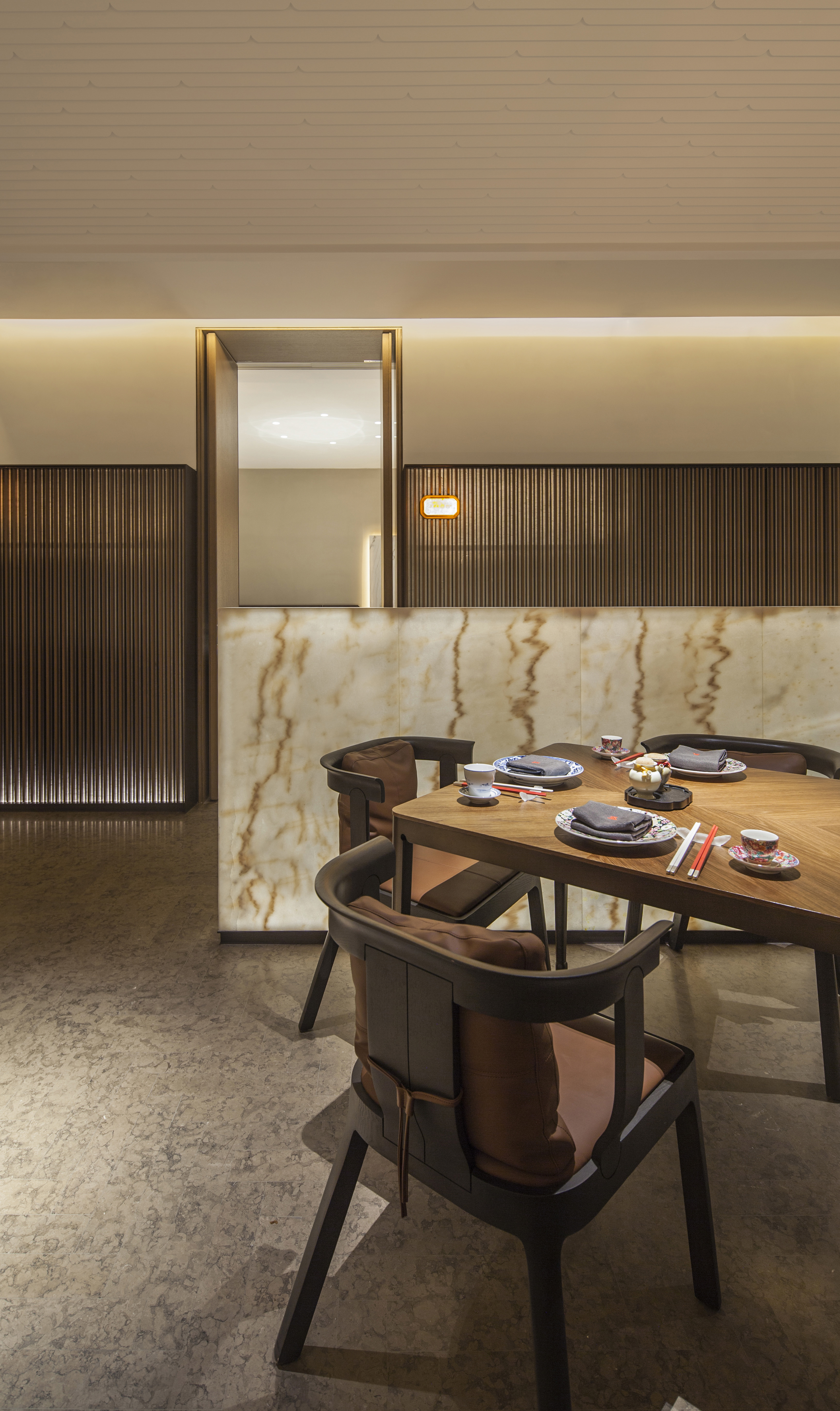 局部细节、质感、几何上呈现出简洁整体的一面,采光的木格栅在不同时间段融入不同的采光背景使其更加流光溢彩。 简洁的几何和线条的节奏将整个空间串联起来。 餐厅多个位置的民族图案通过叠加、分割在空间上产生映衬的色彩氛围。
