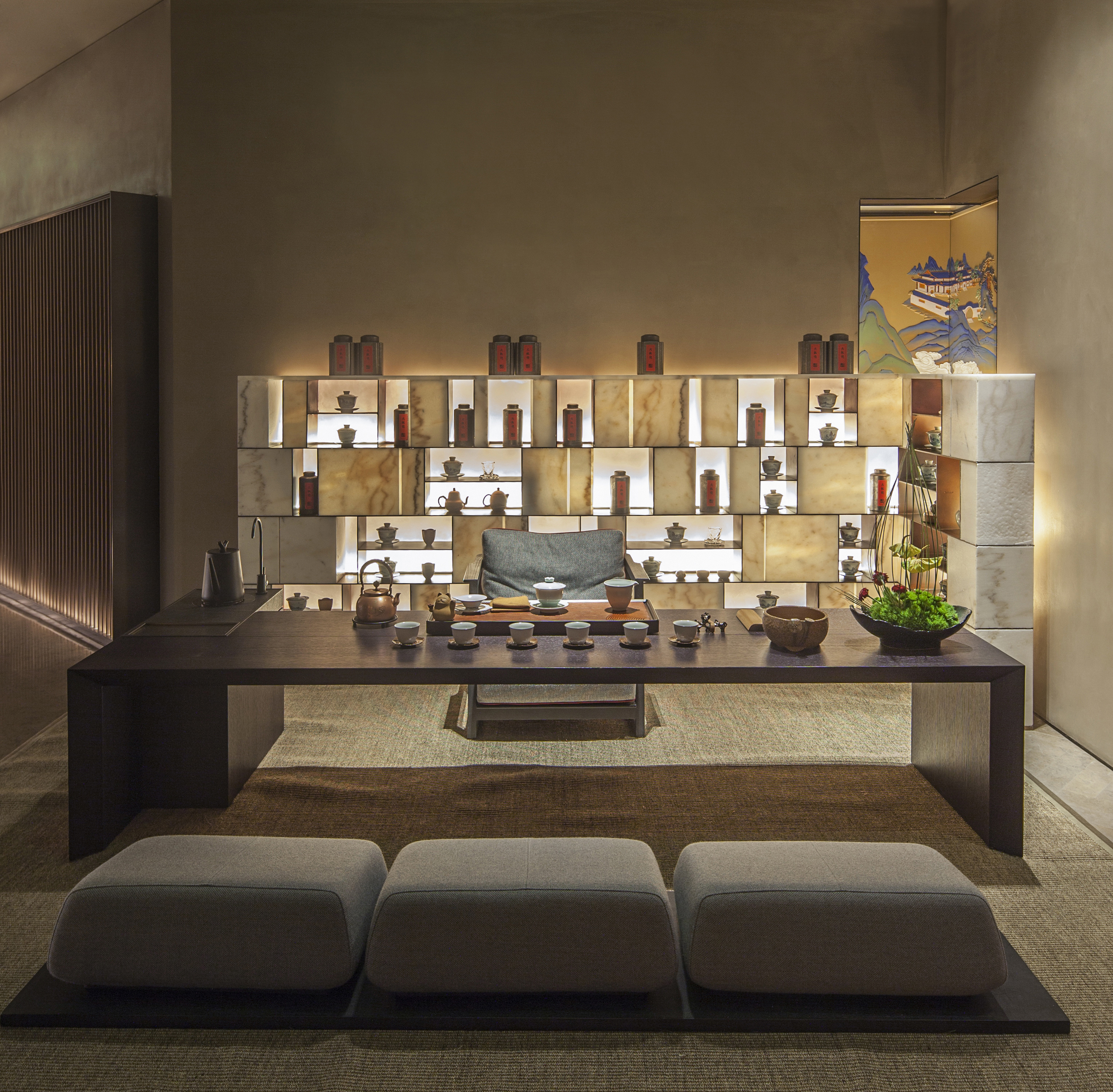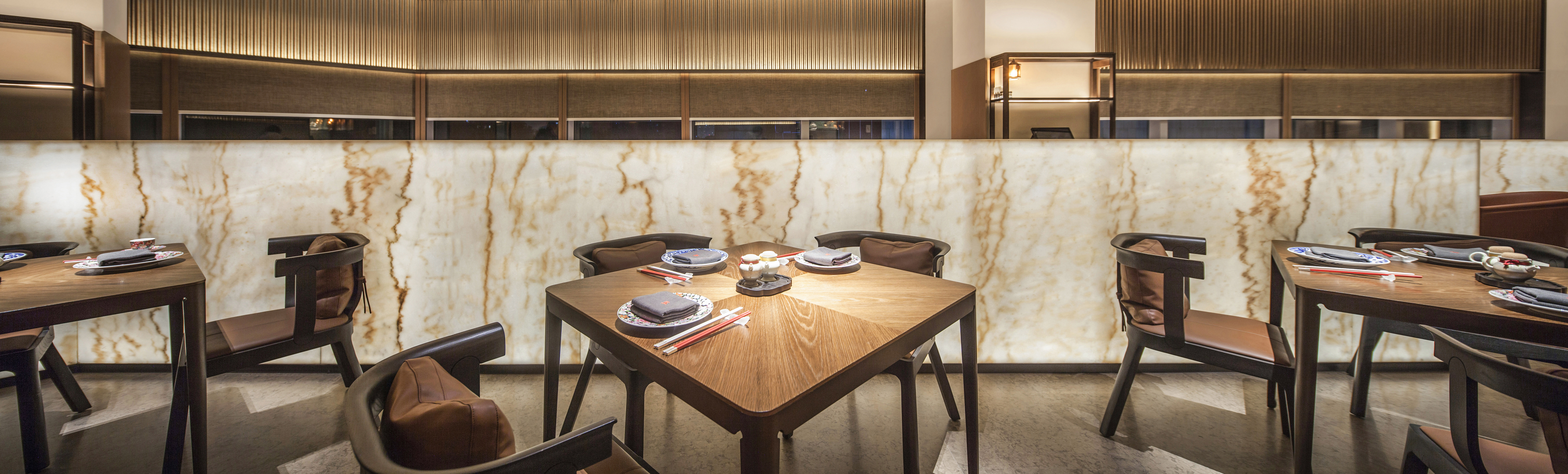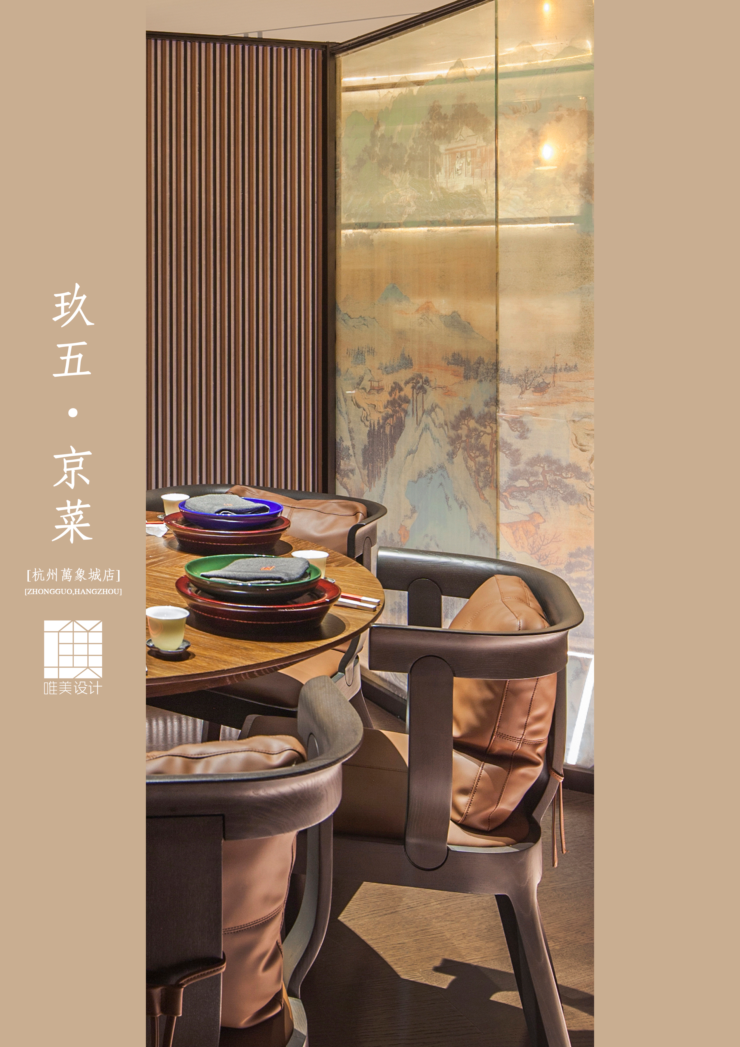 局部细节、质感、几何上呈现出简洁整体的一面,采光的木格栅在不同时间段融入不同的采光背景使其更加流光溢彩。 简洁的几何和线条的节奏将整个空间串联起来。 餐厅多个位置的民族图案通过叠加、分割在空间上产生映衬的色彩氛围。