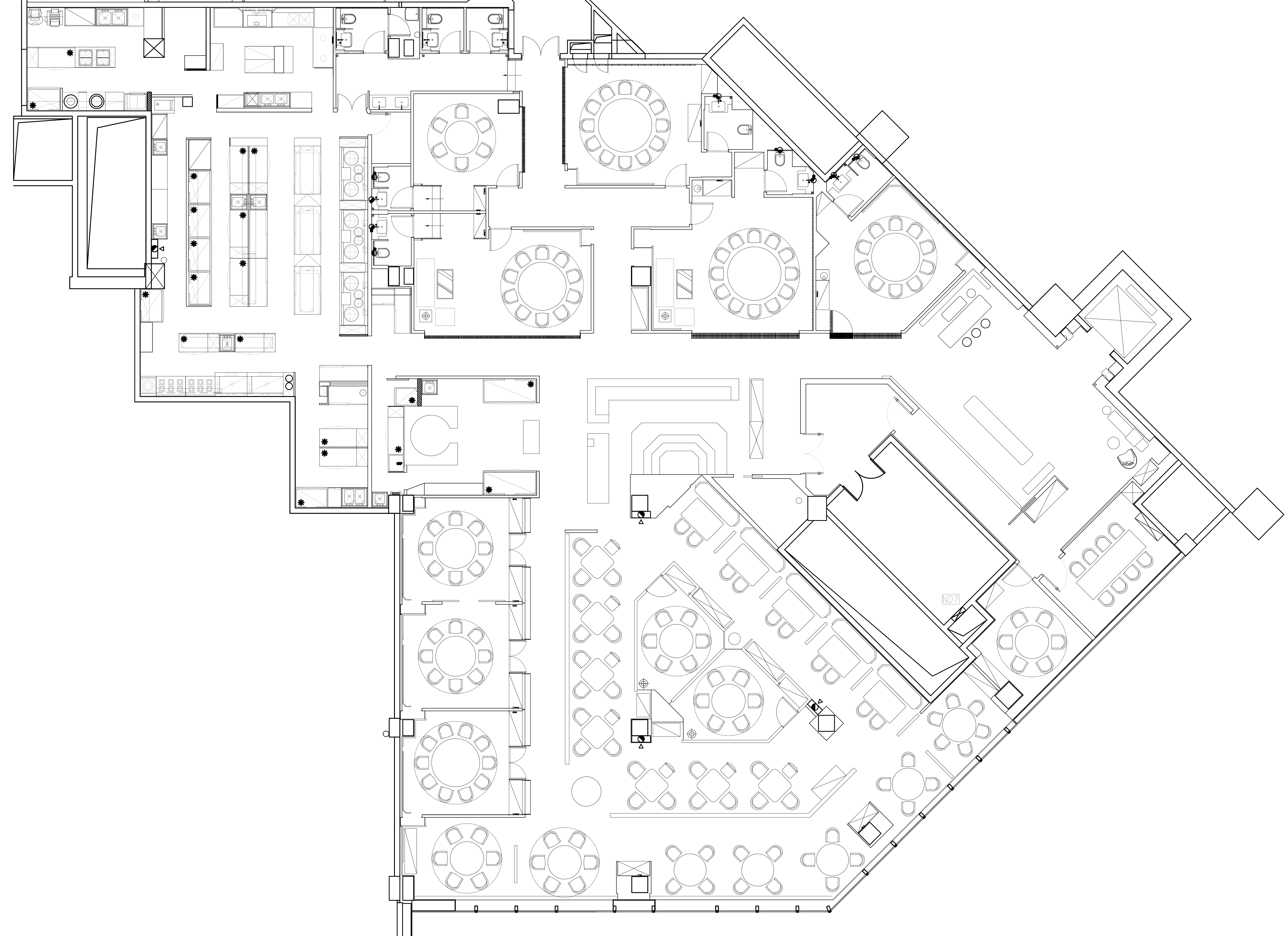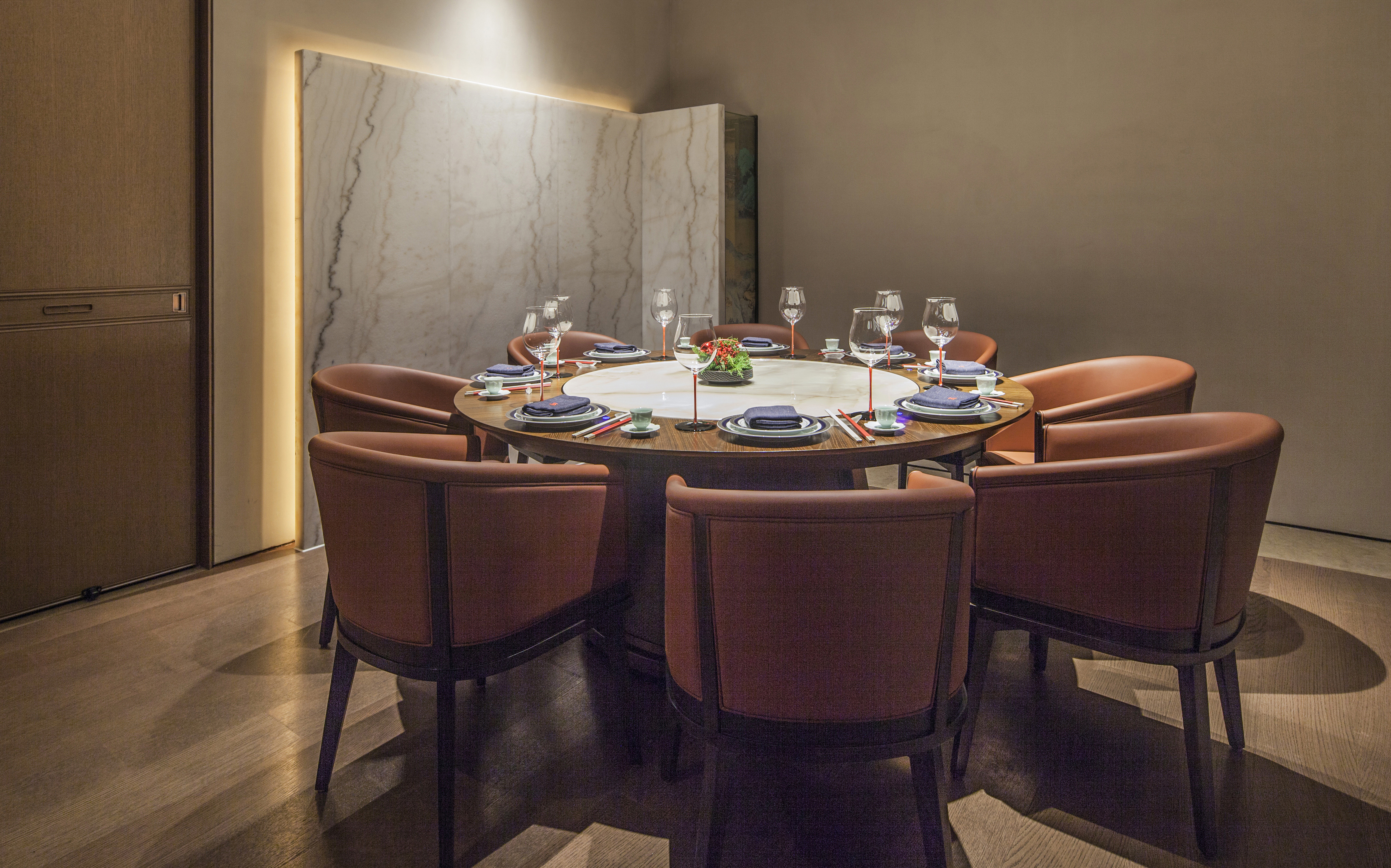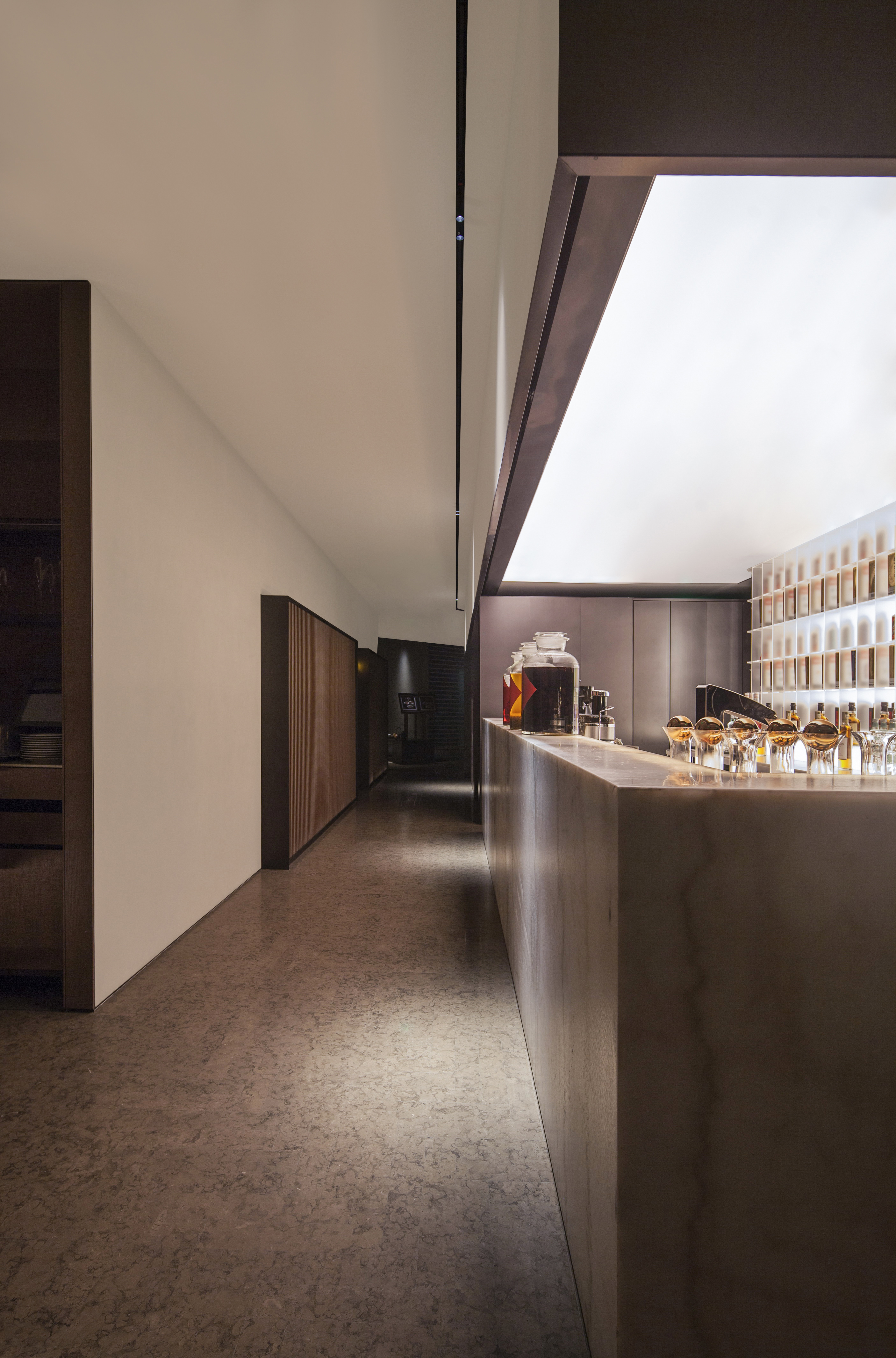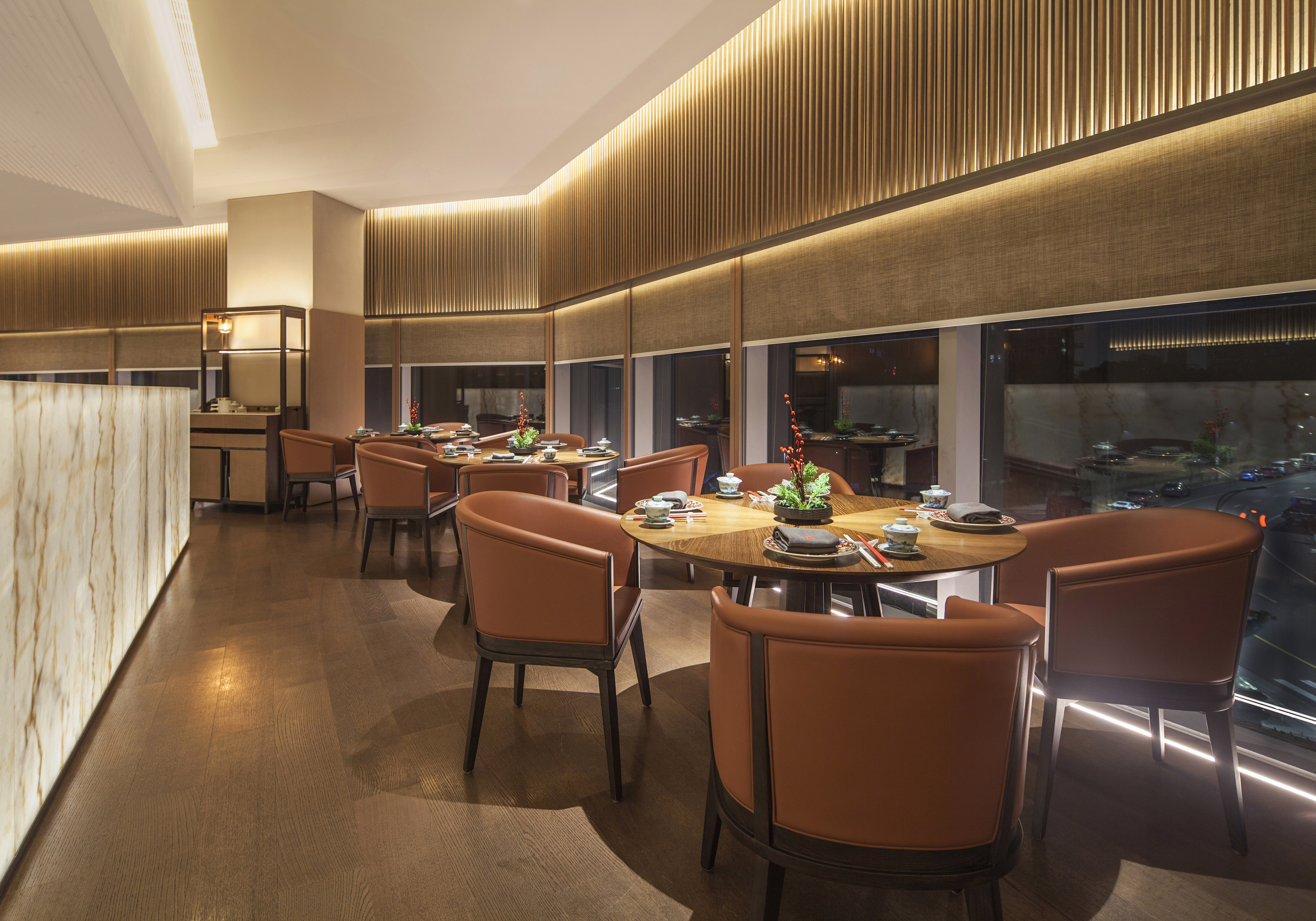 局部细节、质感、几何上呈现出简洁整体的一面,采光的木格栅在不同时间段融入不同的采光背景使其更加流光溢彩。 简洁的几何和线条的节奏将整个空间串联起来。 餐厅多个位置的民族图案通过叠加、分割在空间上产生映衬的色彩氛围。