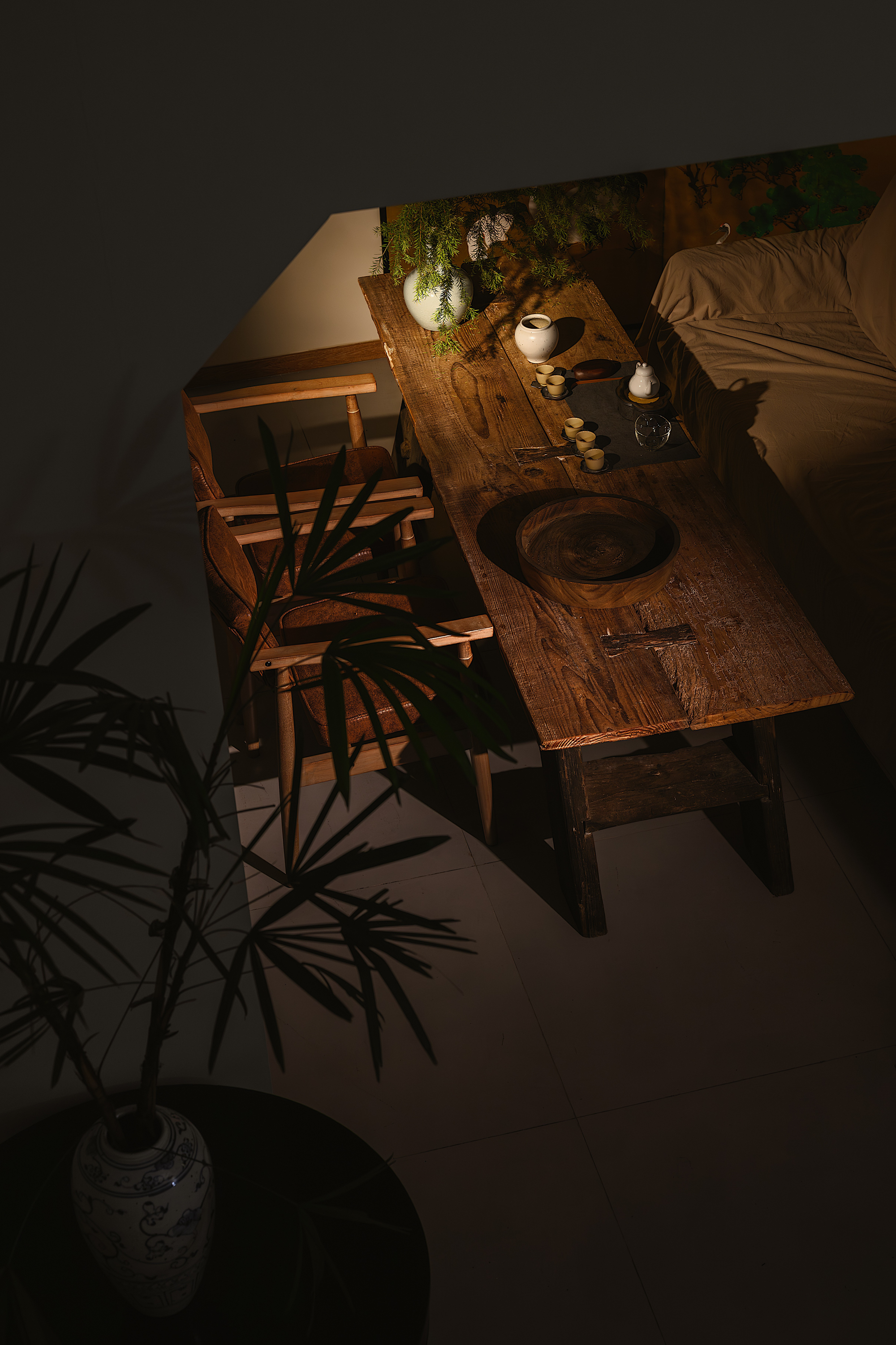 设计选材:本设计运用许多天然老木料来打造侘寂风的木质感,让老旧的材料再次有了新的面貌和使用价值。