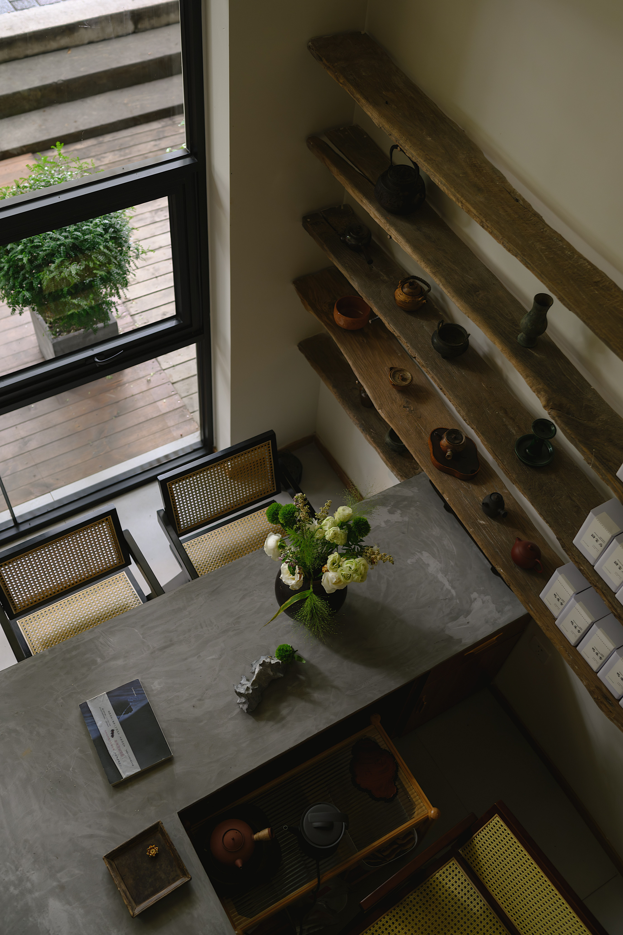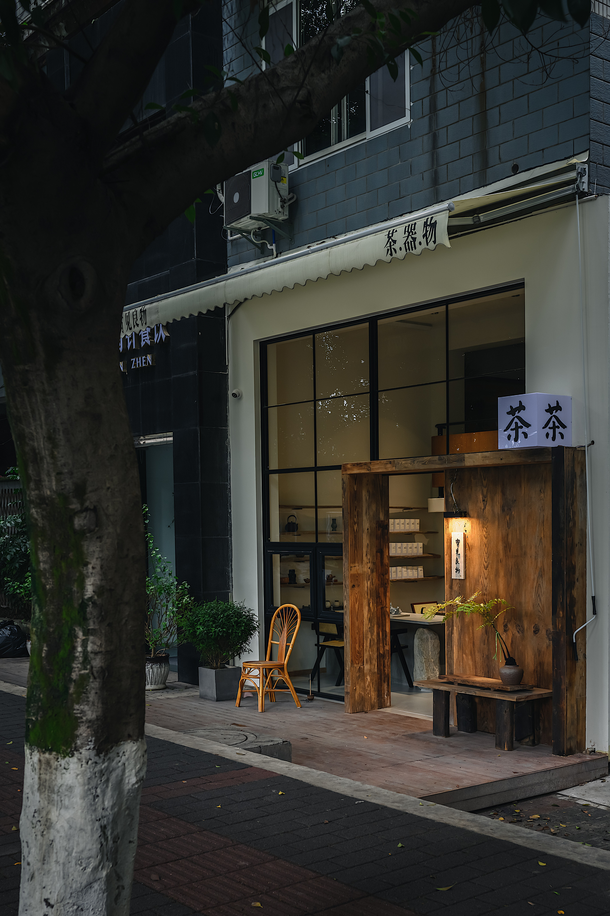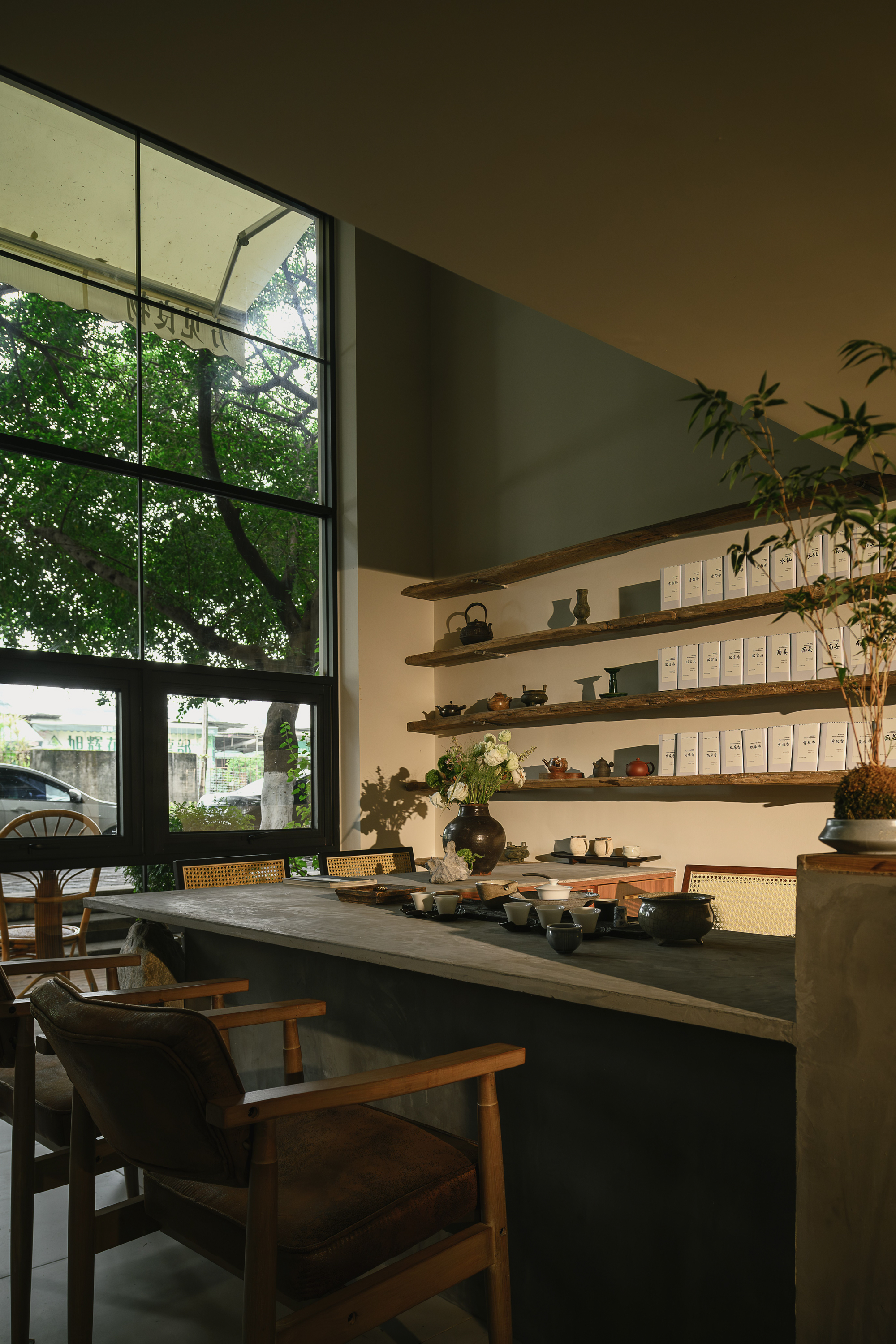 项目定位:坐落花市,小区的临街门面,这一带有茶饮茶叶的周边市场。门面有娴静淡雅的鸟语花香和静心环境氛围,利用一个不大不小的挑高老旧空间作新中式和侘寂风结合的茶室,与最近很火的小院经济和茶饮空间相结合。不仅顾客可以有交谈品茗的休闲空间,同时售卖配套茶叶/茶器与文化的传播。