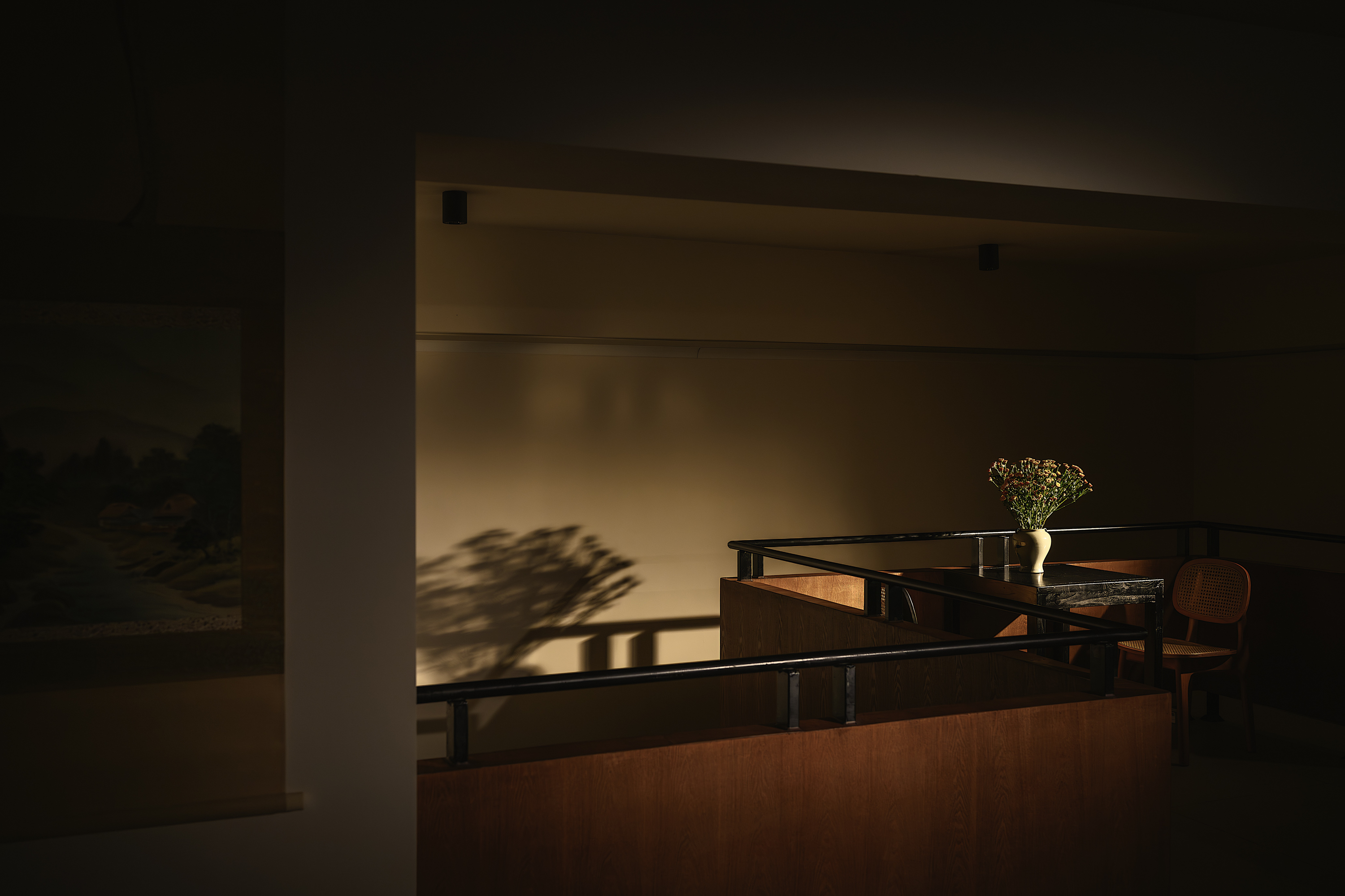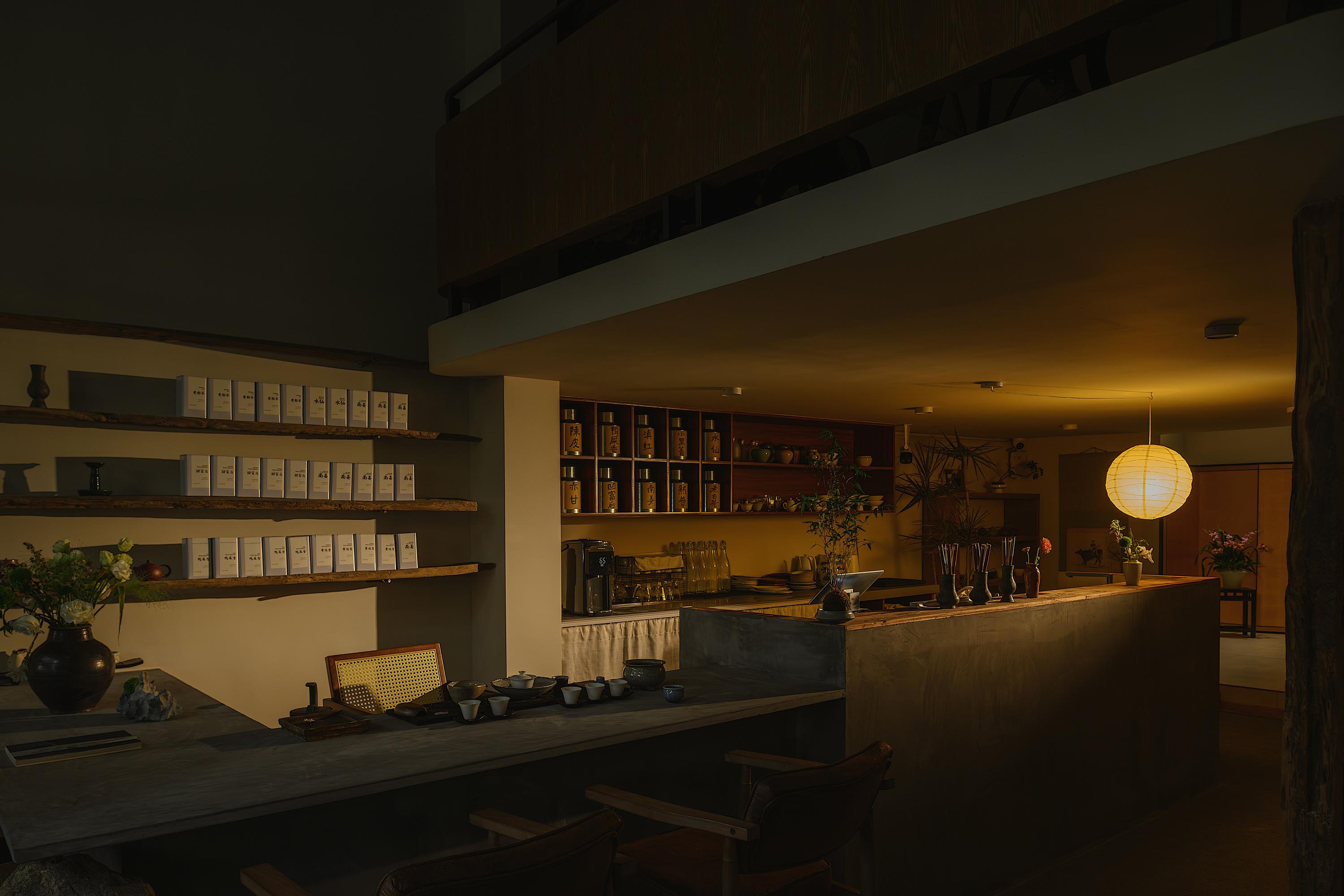 空间布局:极度困难最低点4米5左右的挑空高度作现浇两层,设计上尽可能的弱化层高劣势,利用设计和动线去避免影响茶客的空间体验感。最大空间化利用每个角落合理分配操作区,品茗区,库房和洗手间区域,同时拥有半独立式包房和大厅品茶区。