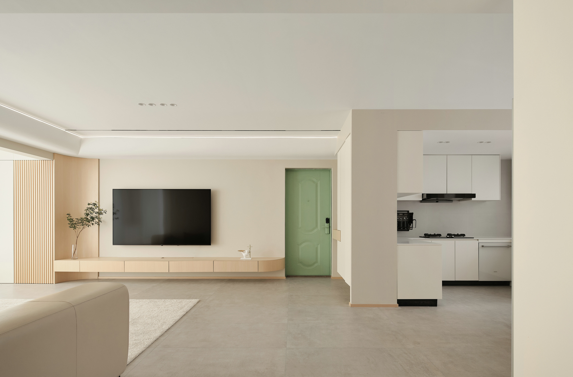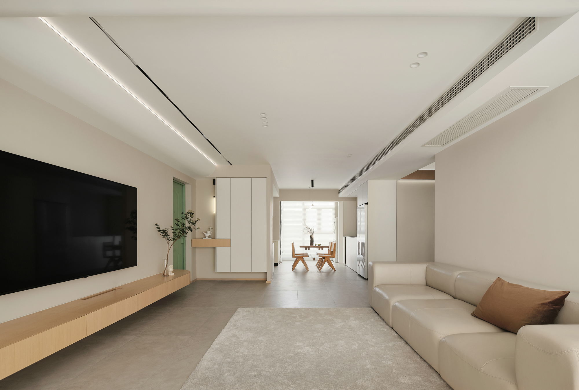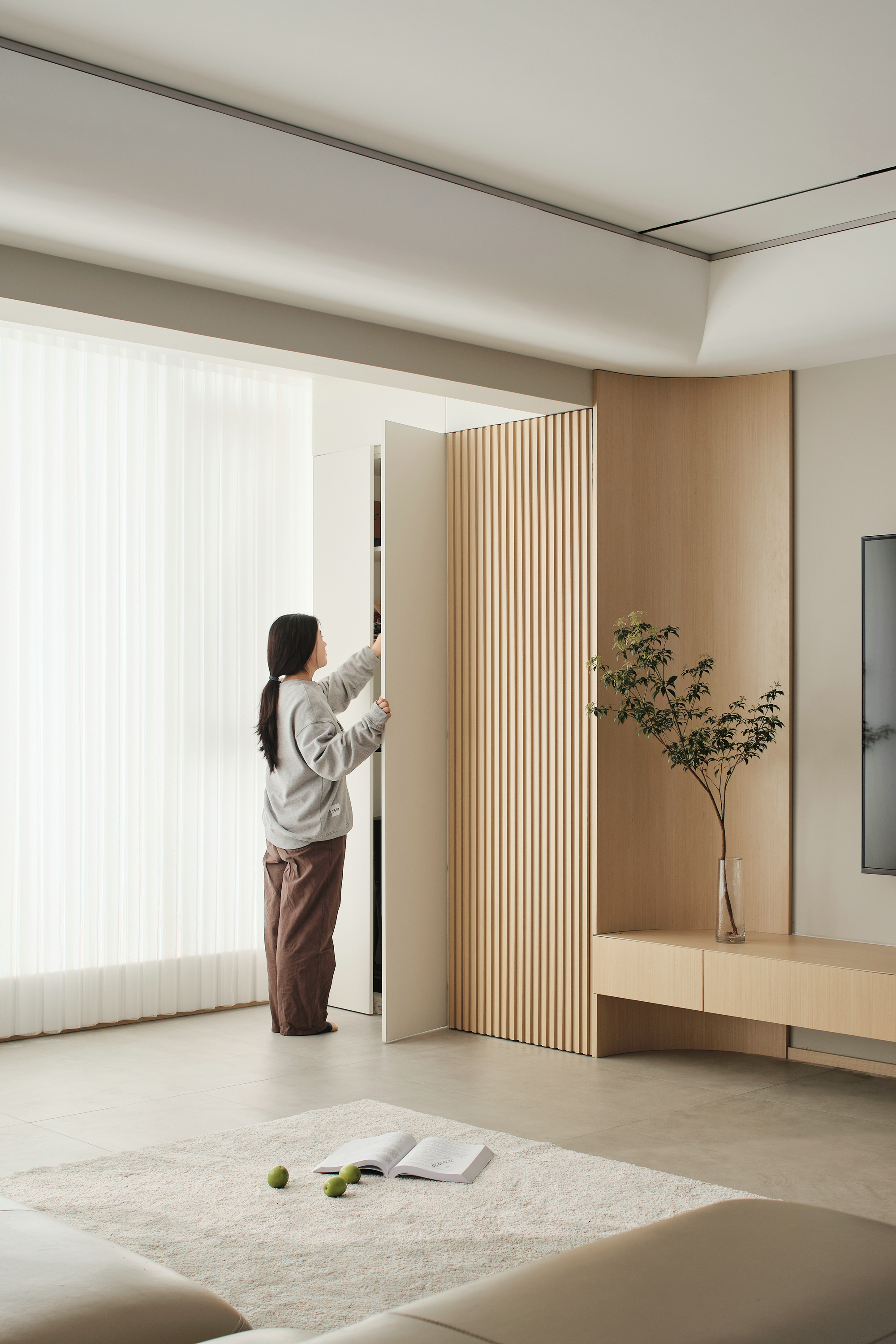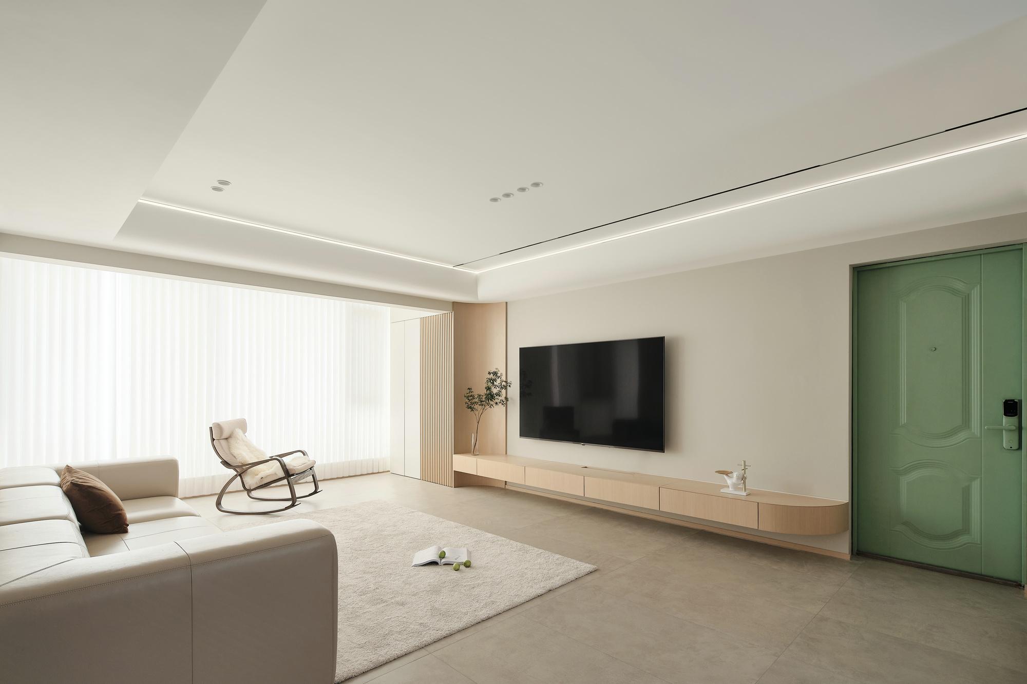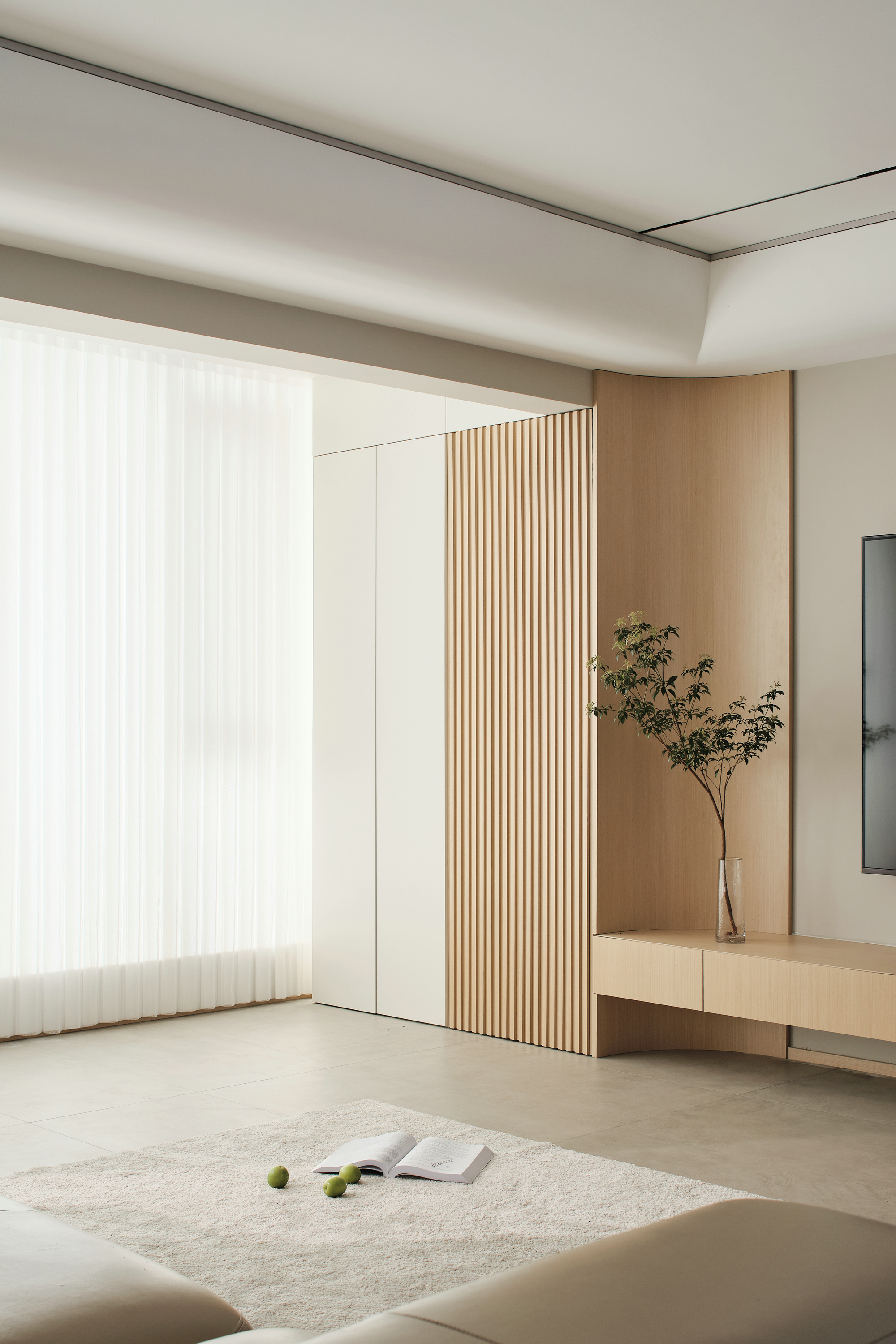 空间意境:玄关空间留白一部分,颜色上木白相间,感受到自由呼吸的敞亮和愉悦。打开空间,客厅一览无余视野开阔,置身其中的通透感让人放松宁静。光线通过梦幻帘的过滤,仿佛给空间加了一层自然滤镜,静谧温润,没有传统的茶几组合,铺上柔软的地毯,坐在这里休憩、静坐、阅读,尽情享受时光的曼妙;悬浮电视柜,一直延伸到阳台并在墙体交汇处采用圆弧收尾,呼应吊顶的造型,同时还将插座电线藏入电视柜内,最好的设计,是看不到设计。阳台纳入了客厅,让阳光离我们更近一些。客厅无主灯设计,享受空间的轻松感。嵌入式线条灯带,筒灯等光源营造出光的氛围感,根据需求自由调节明亮暗度。个性的圆弧吊顶为简约空间增添了温度,看似简约实则精致,张弛有度。设计中有情感的表达,我们想要的生活是质朴的,温暖的,宁静的,有序的。