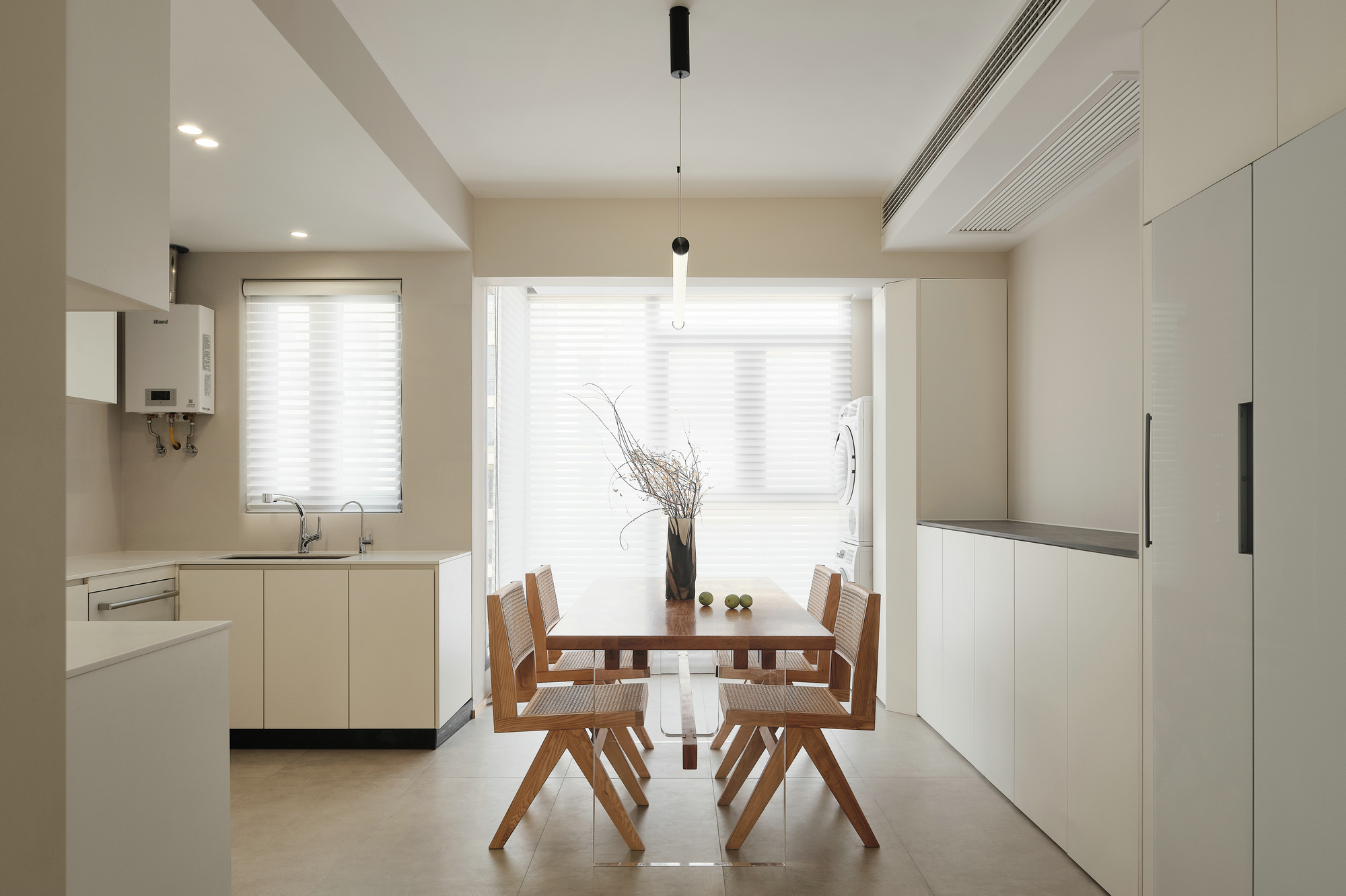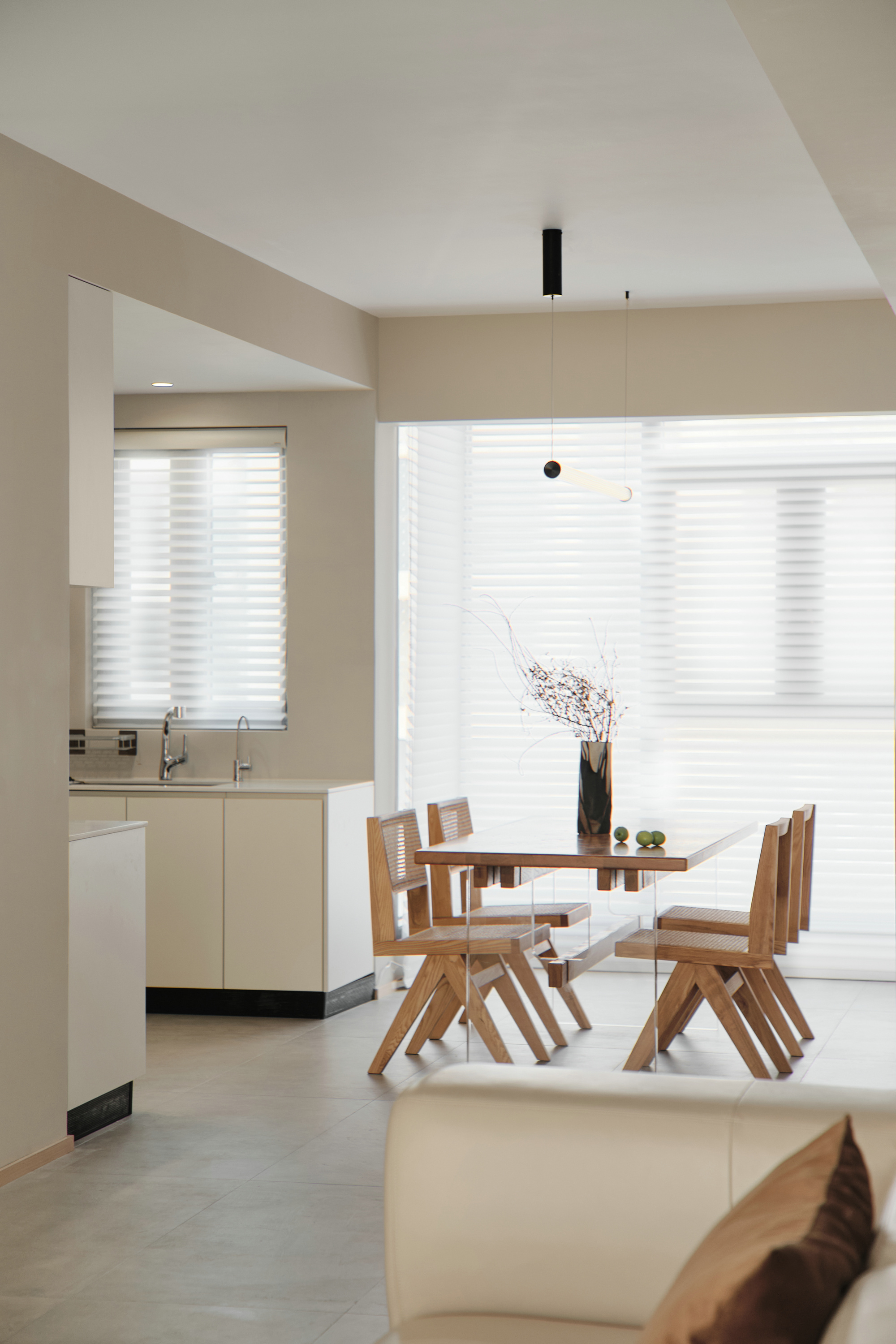 餐桌的选择也秉承简的要素,亚克力让餐桌也有悬浮感,