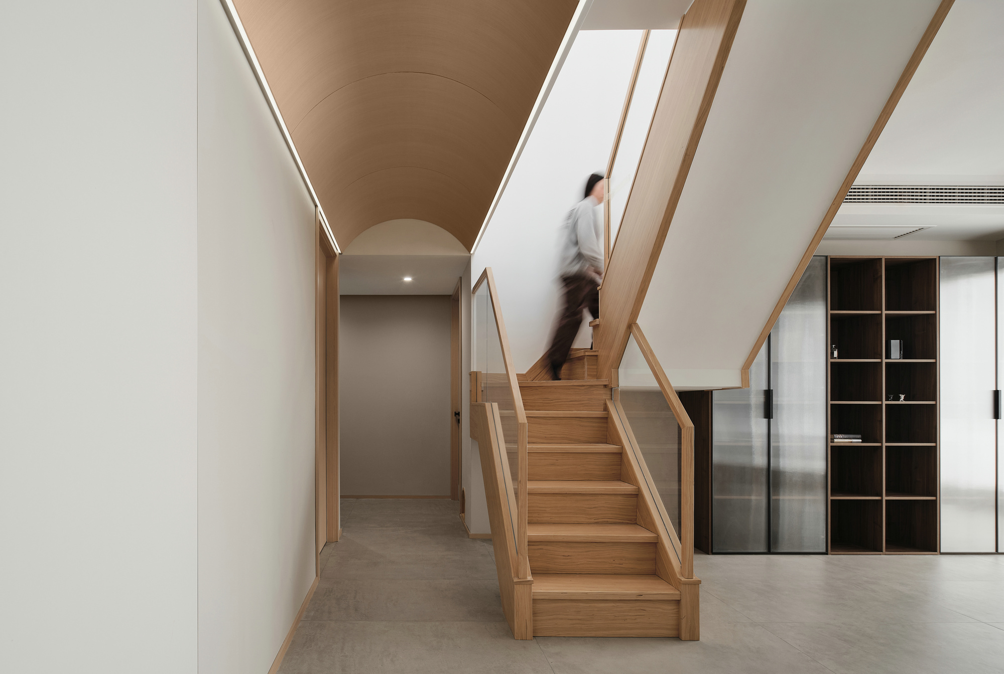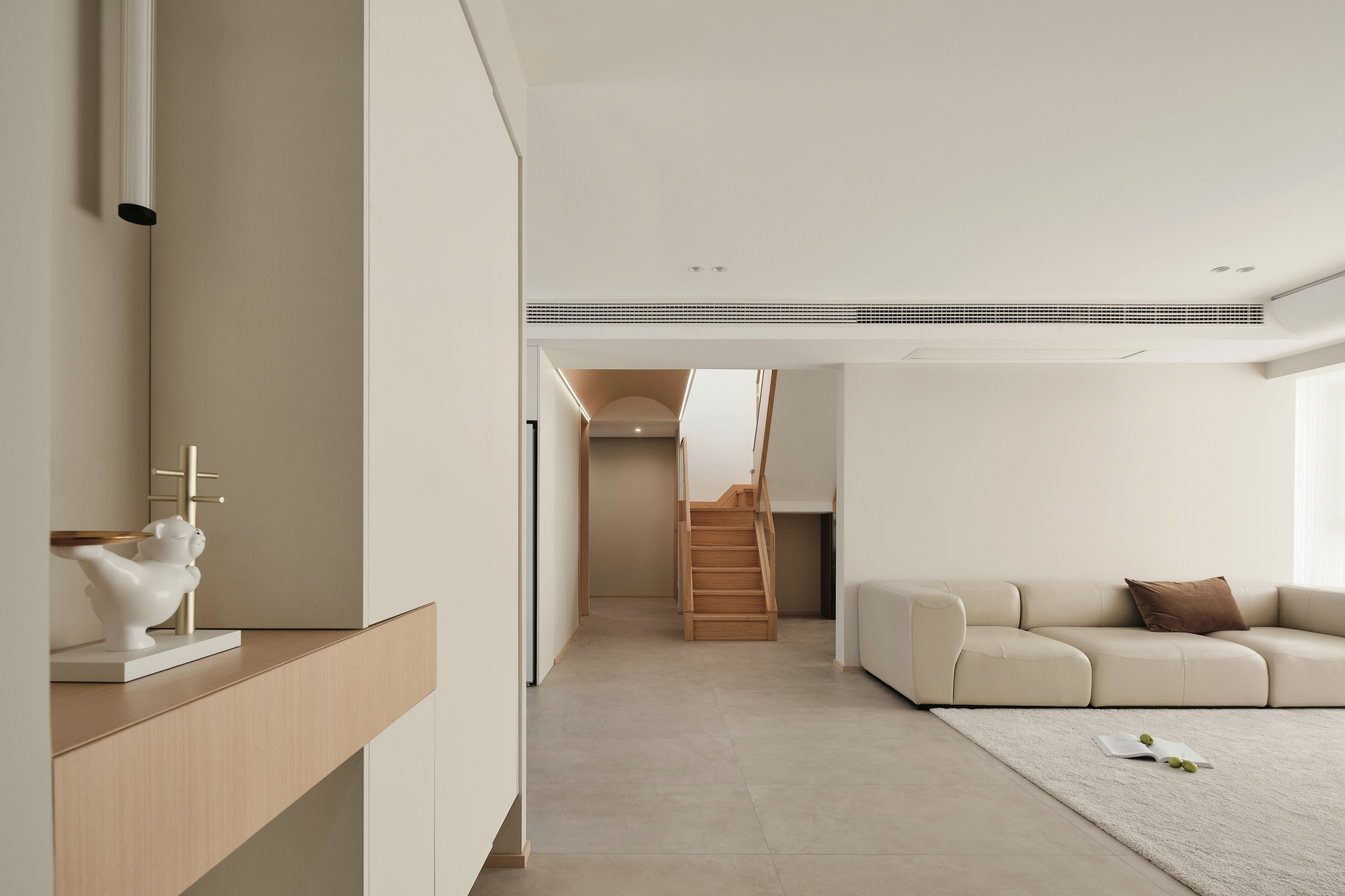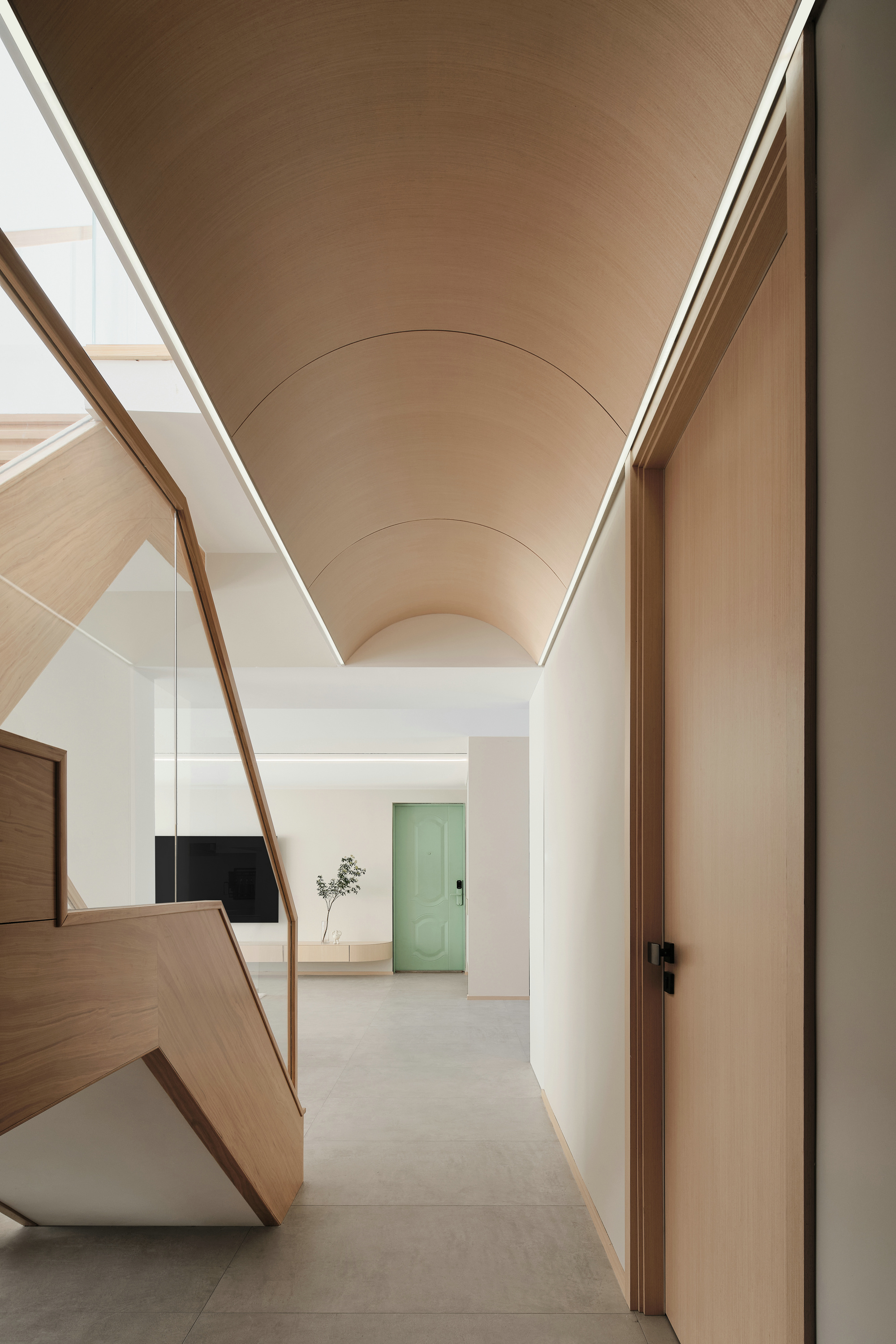 设计选材:业主喜欢现代极简的风格,家中大面积留白,原木色家具点缀阳台柜采用局部木格栅装饰,让空间更有层次且有质感。走廊顶部原木色圆拱造型,灯带镶嵌其中,将不同区域串联起来;看起来显大又整洁;