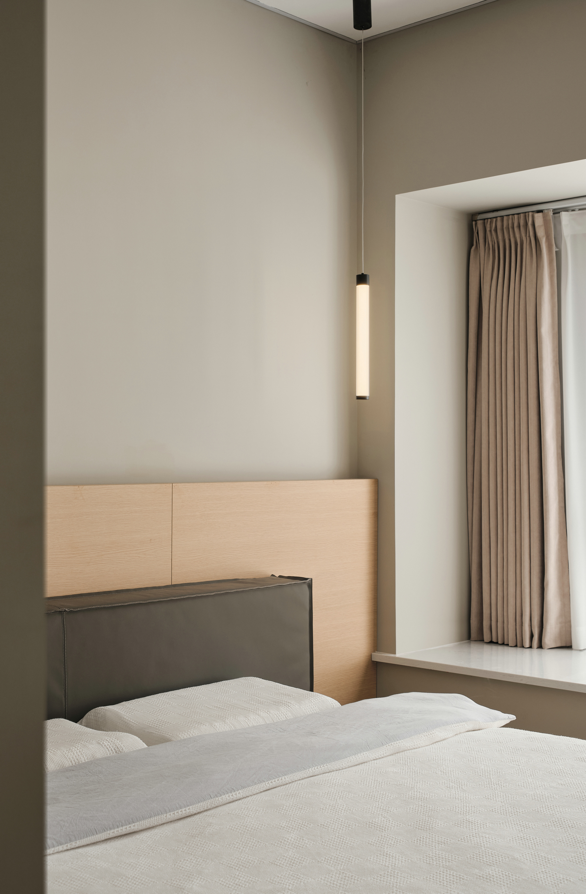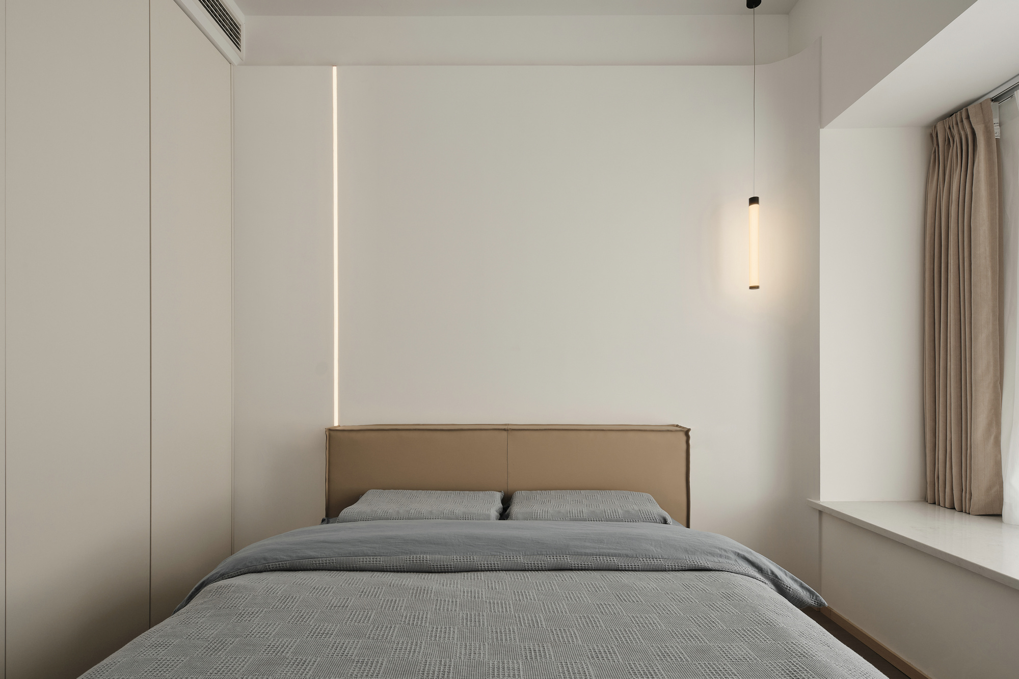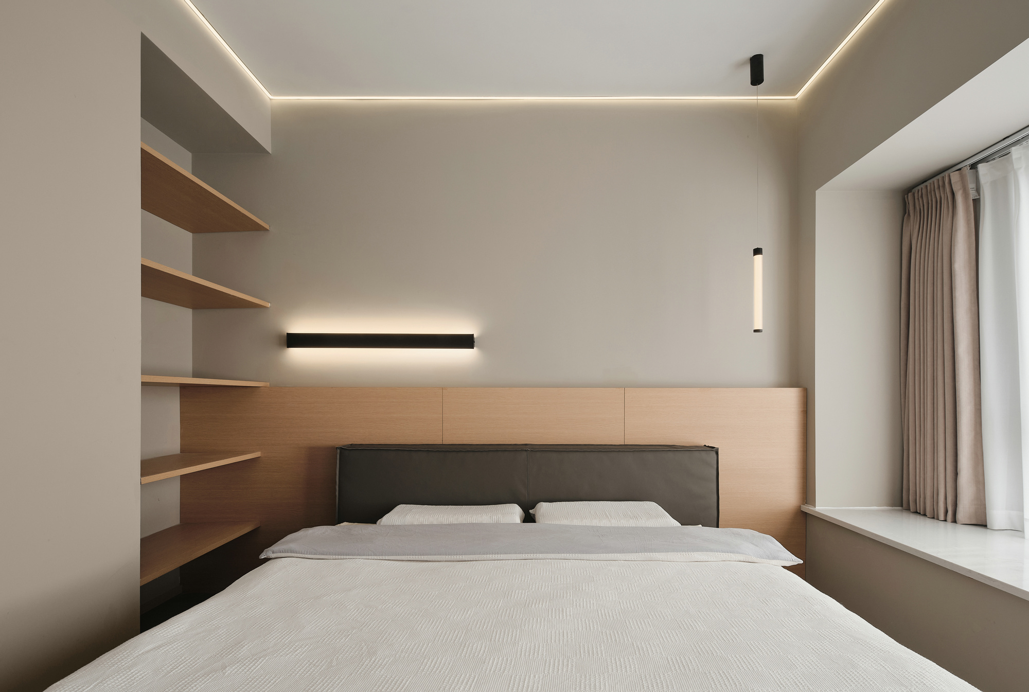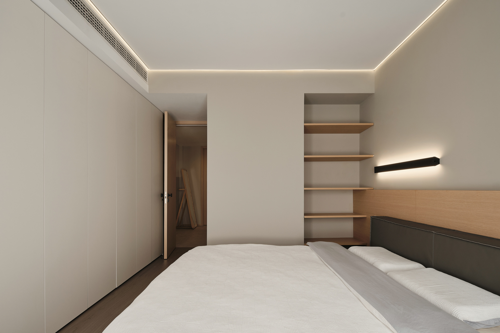 主卧延续简洁的线型灯带装饰,并纳入充足的储物空间。床尾一组封闭式衣柜,床头开放式隔板收纳,隐和显都是为了整个空间更舒适