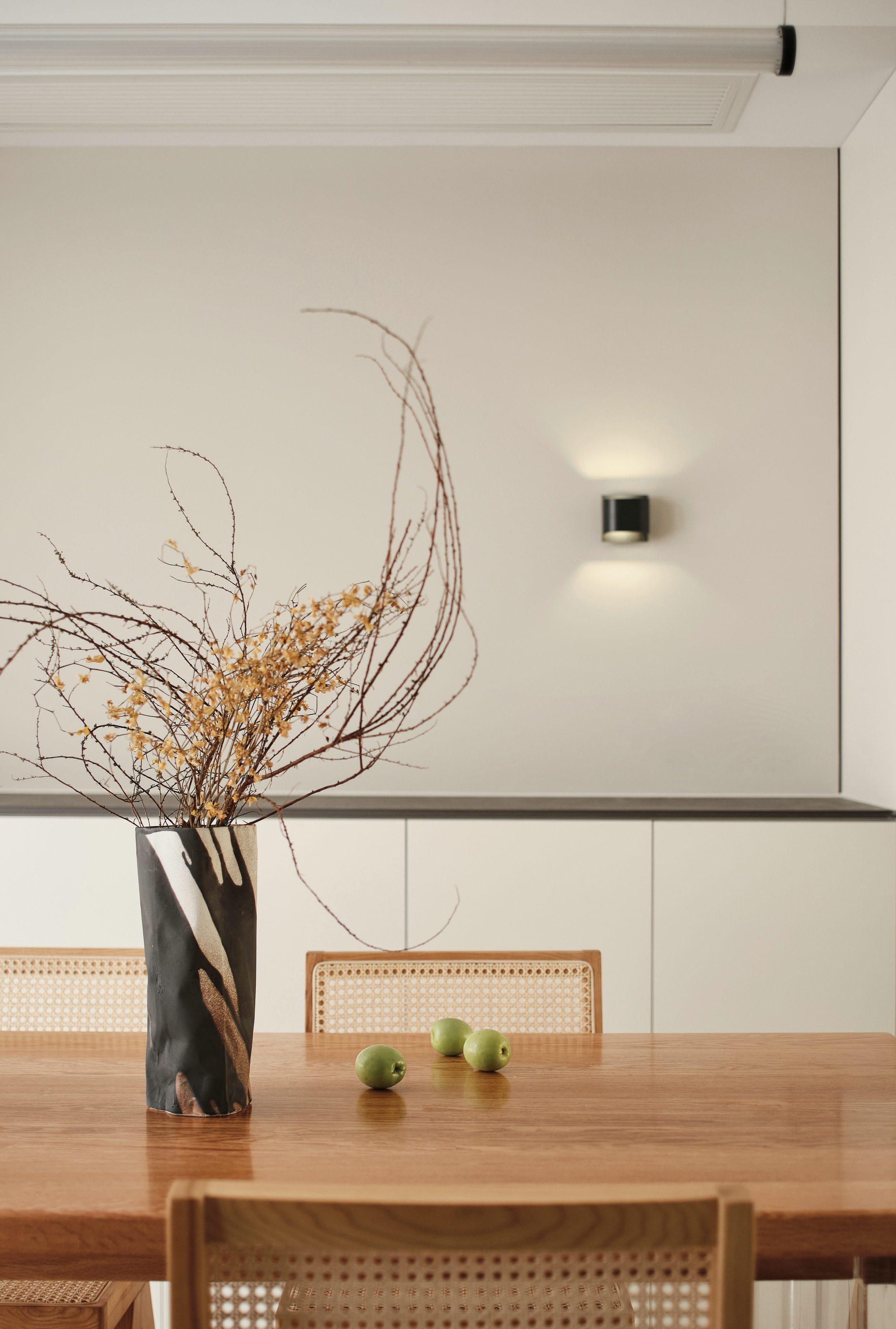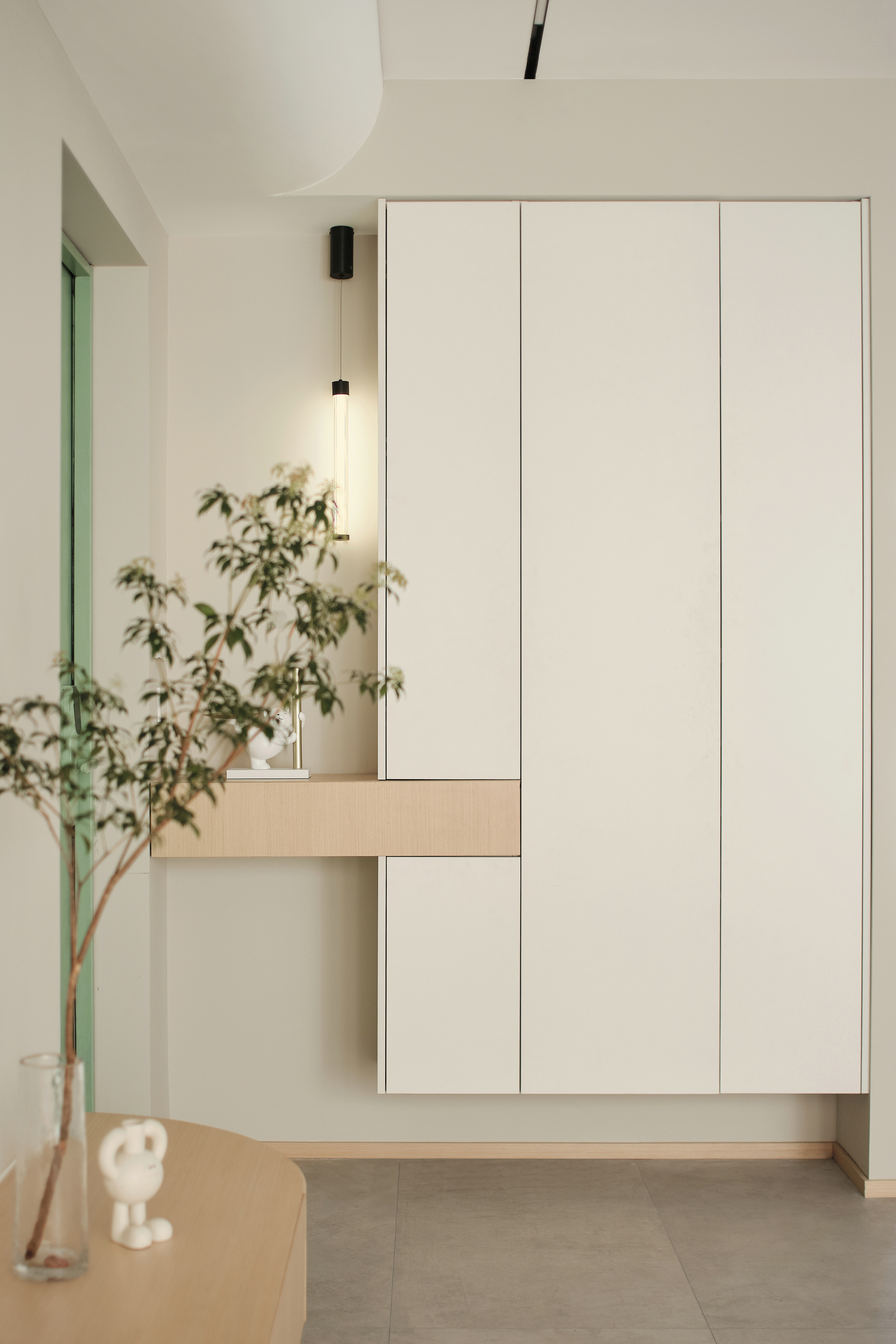个性的圆弧吊顶为简约空间增添了温度,看似简约实则精致,张弛有度。设计中有情感的表达,我们想要的生活是质朴的,温暖的,宁静的,有序的。