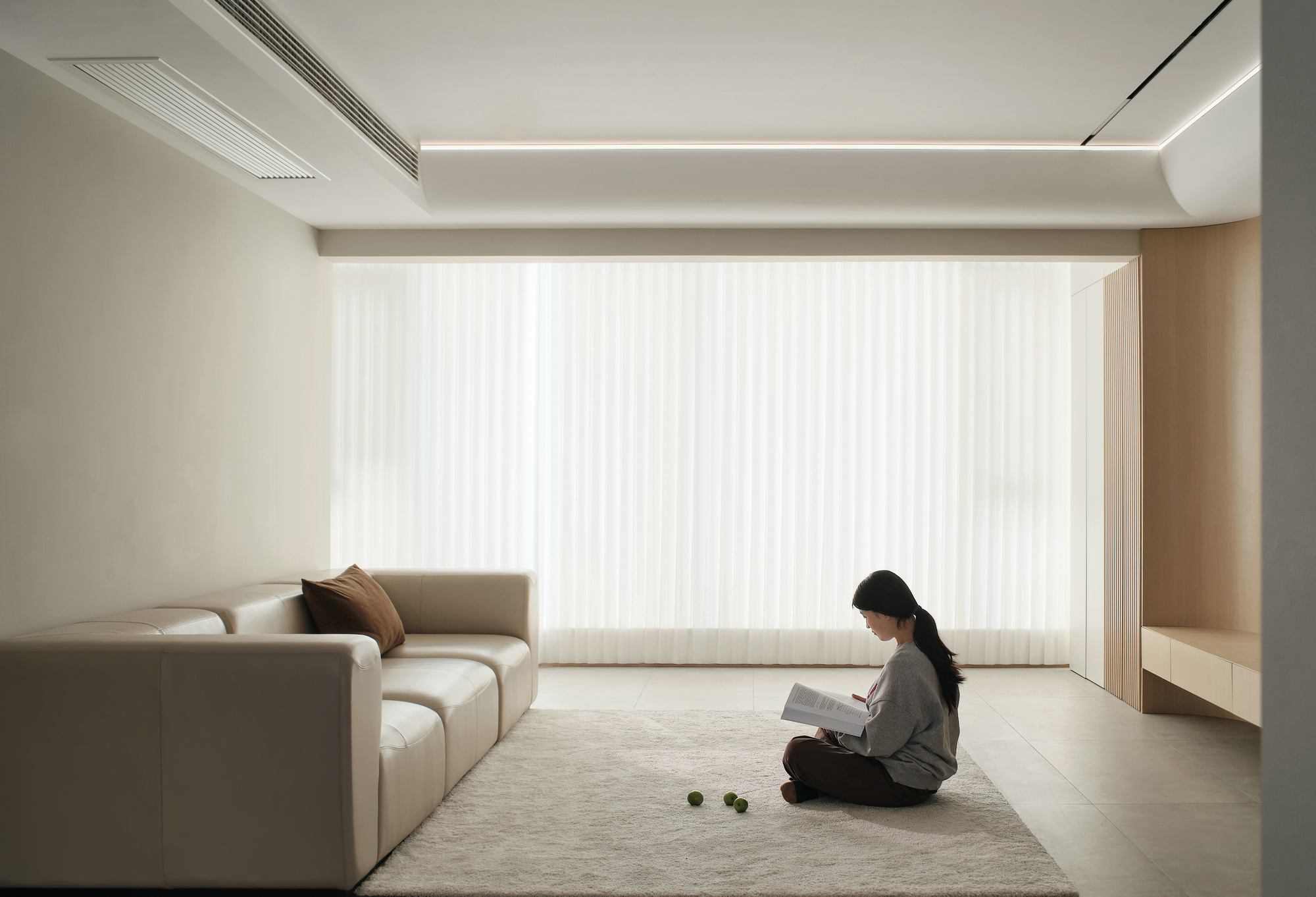 光线通过梦幻帘的过滤,仿佛给空间加了一层自然滤镜,静谧温润,没有传统的茶几组合,铺上柔软的地毯,坐在这里休憩、静坐、阅读,尽情享受时光的曼妙;