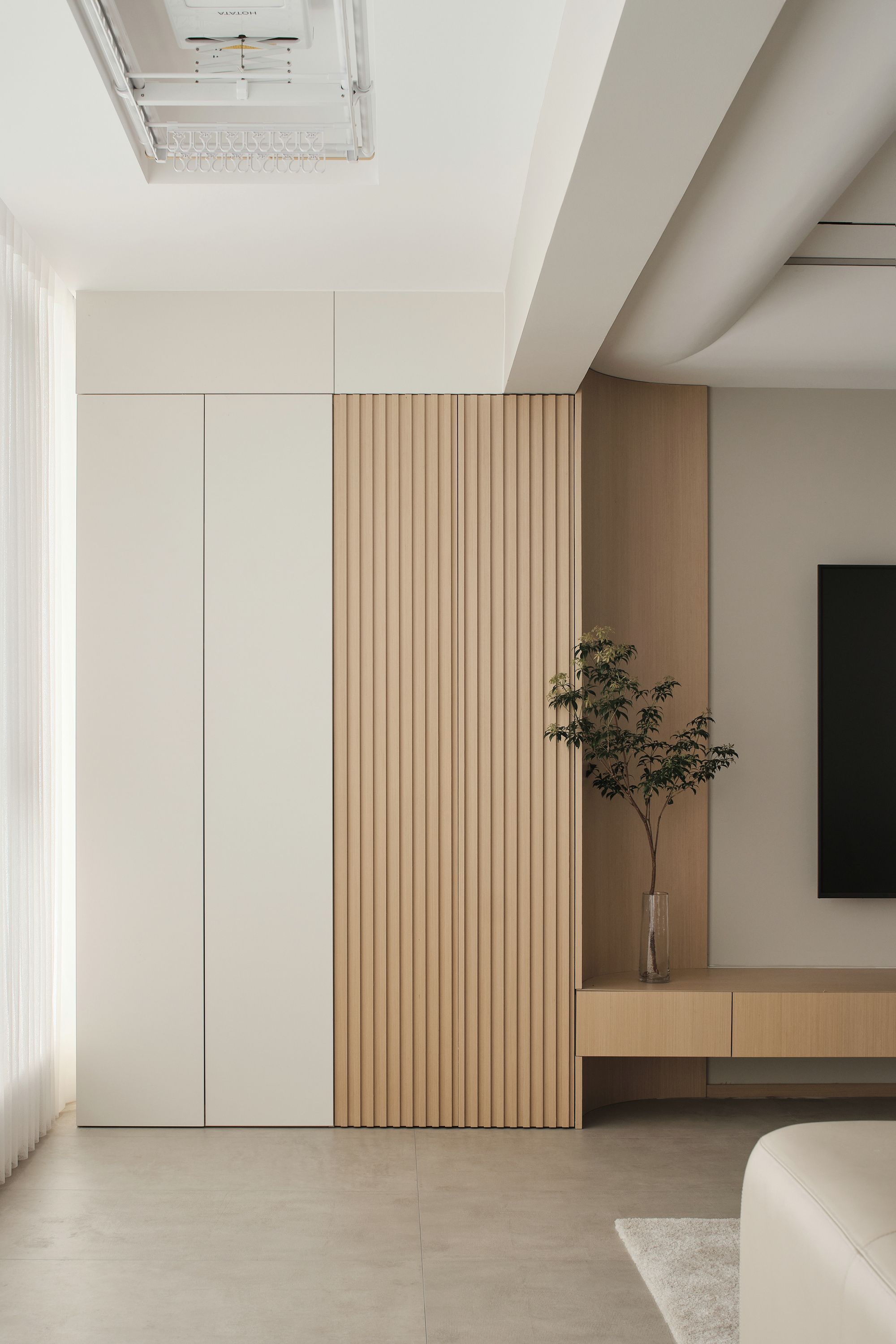 悬浮电视柜,一直延伸到阳台并在墙体交汇处采用圆弧收尾,呼应吊顶的造型,同时还将插座电线藏入电视柜内,