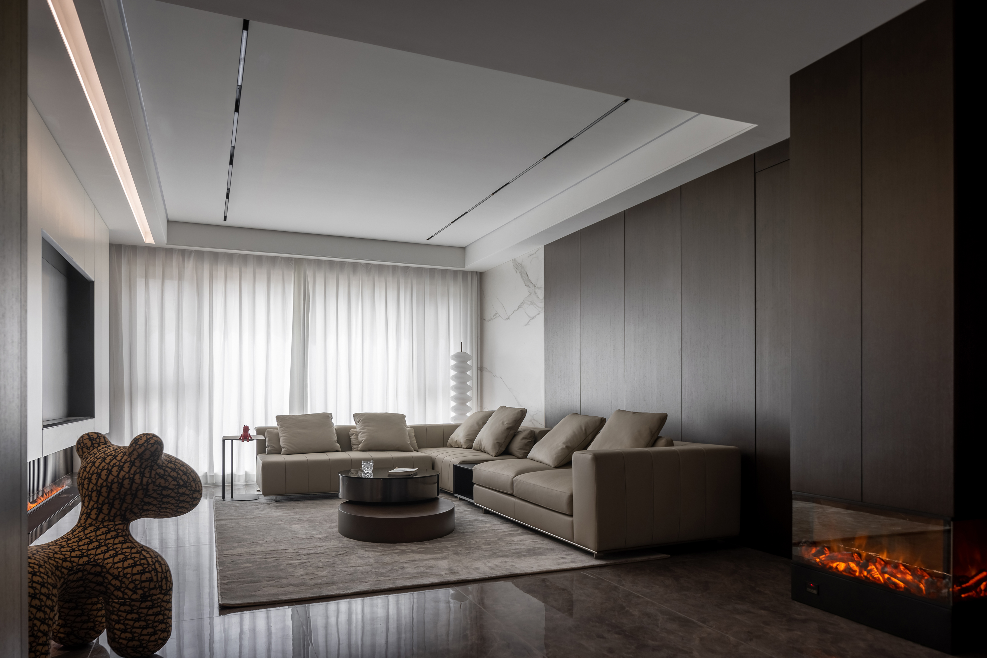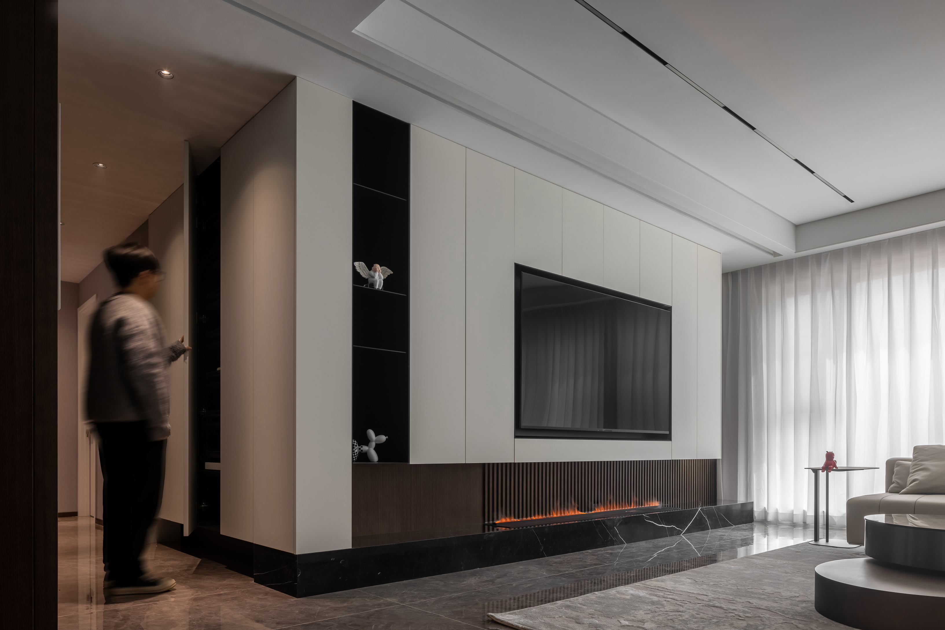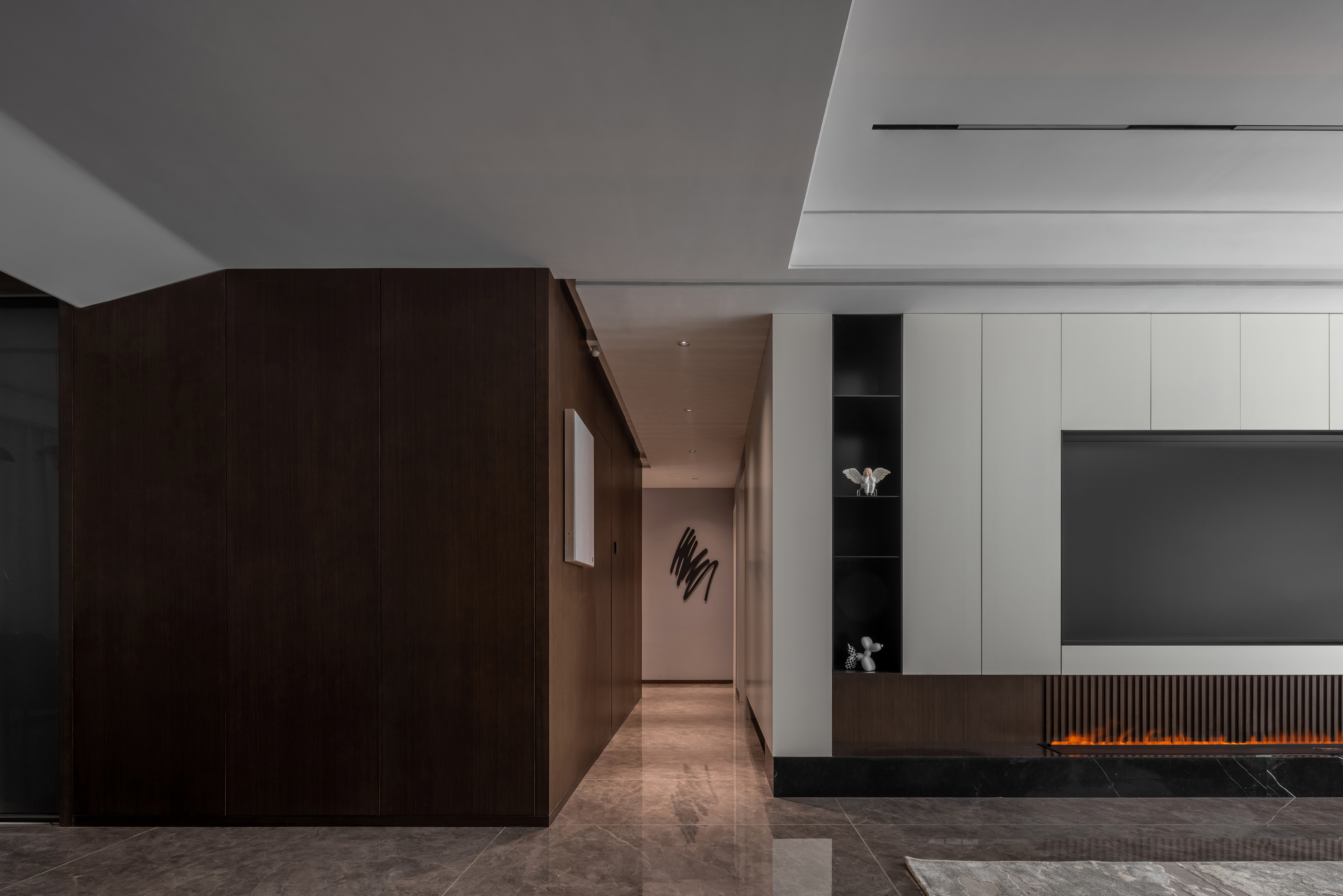 整体色调以米灰色为主,在人的主视角内以白色为主色调,而在背景色上则选择深色的木色为主,配以白色石材为点缀,你坐在沙发上时,就像在画中一样,而你的主视角有很舒服,整体会营造一种放松而又高级的空间感。进门玄关处特意设计的壁炉,在深色的衬托下,格外温馨;同时也解决了入户衣帽柜的难题!入户玄关区的折纸造型顶,很好的掩饰了主梁下仅有2.25米高的难题,又让人进门眼前一亮!客厅电视墙是利用穿插的手法将电视墙立面和走廊立面无缝衔接,又利用多材质的对比,共同打造一个丰富的视觉效果和强大的储物空间!