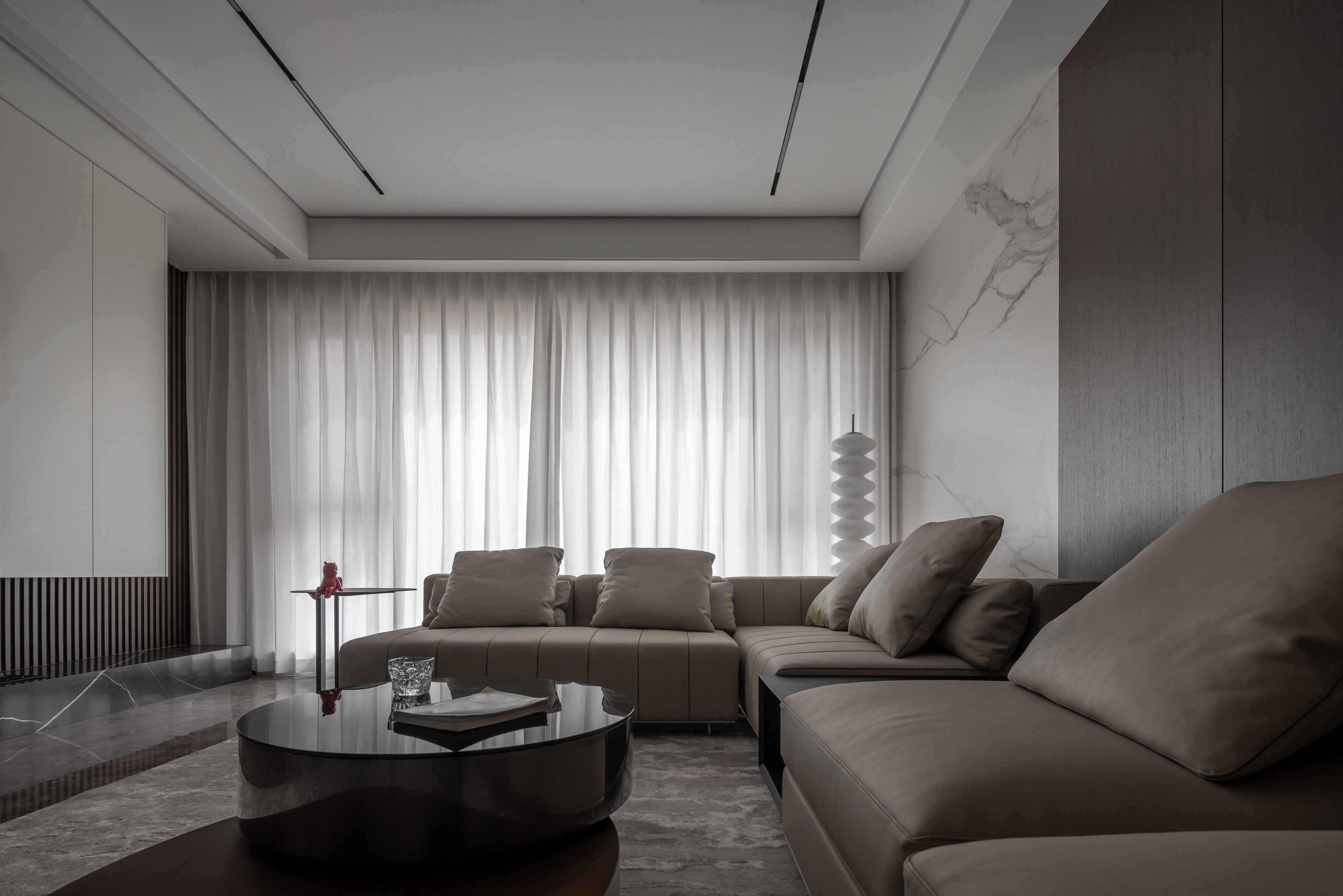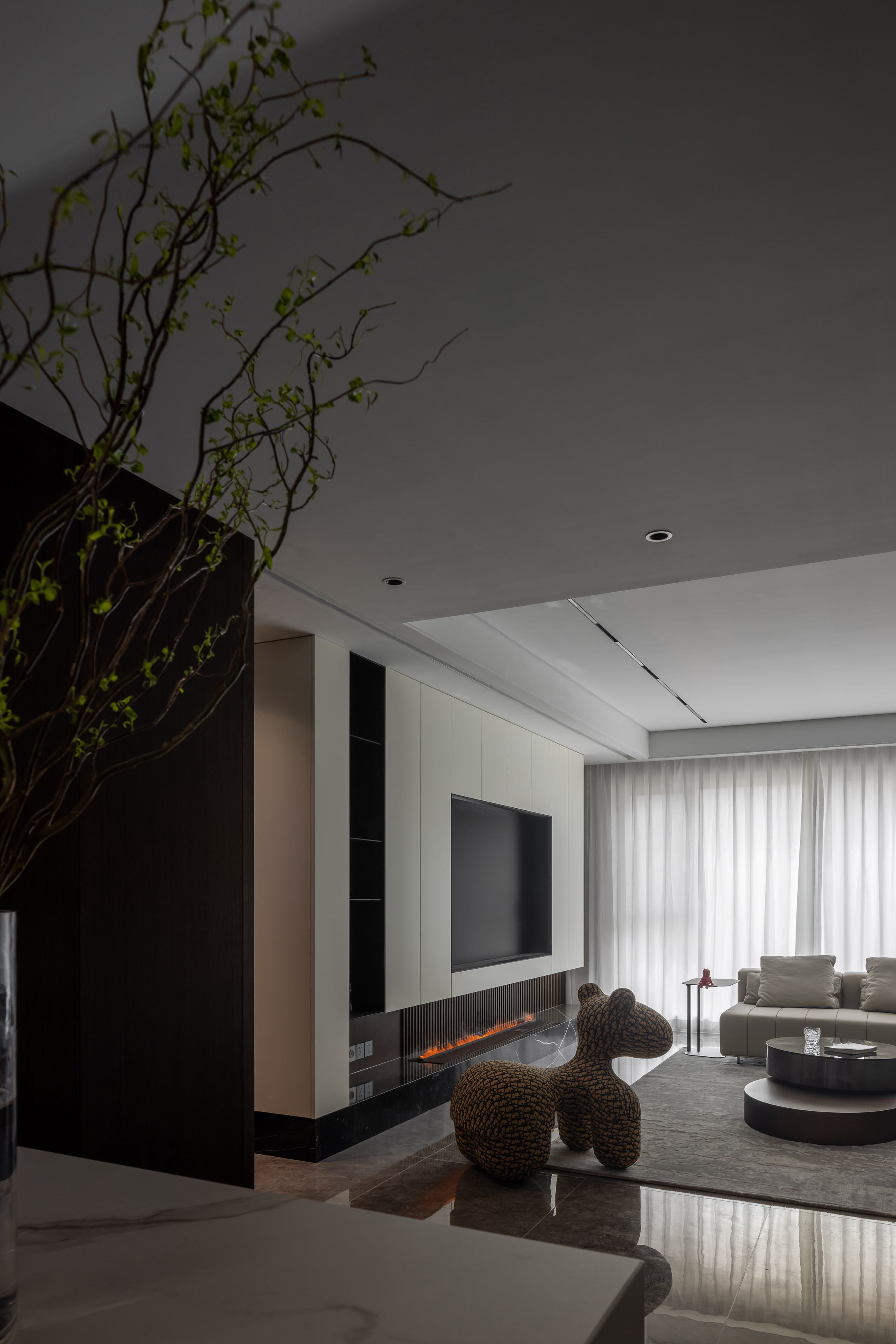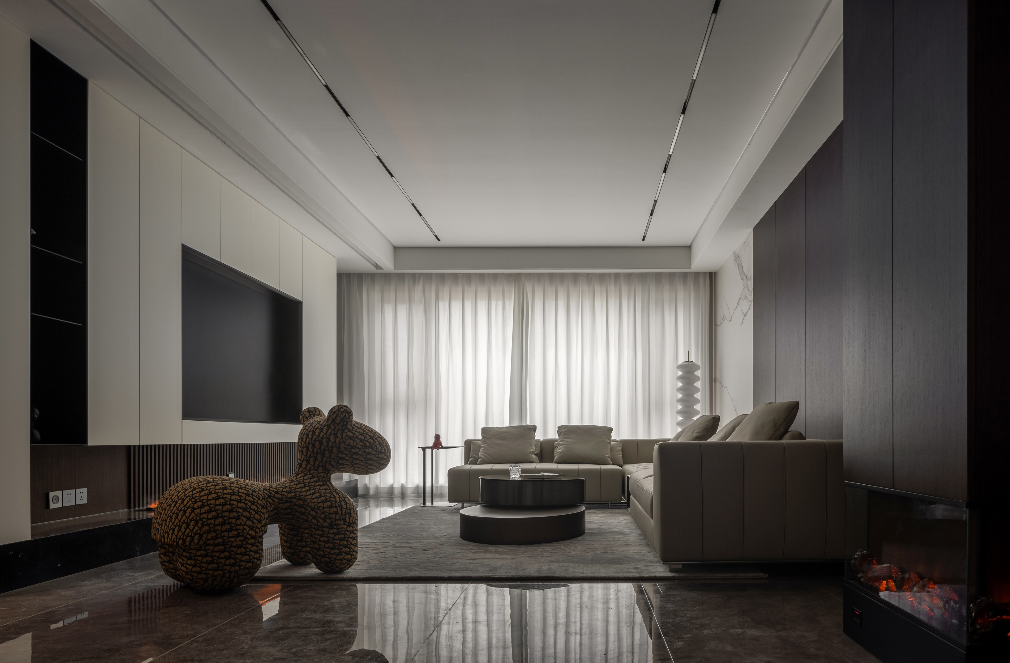 整体色调以米灰色为主,在人的主视角内以白色为主色调,而在背景色上则选择深色的木色为主,配以白色石材为点缀,你坐在沙发上时,就像在画中一样,而你的主视角有很舒服,整体会营造一种放松而又高级的空间感。进门玄关处特意设计的壁炉,在深色的衬托下,格外温馨;同时也解决了入户衣帽柜的难题!入户玄关区的折纸造型顶,很好的掩饰了主梁下仅有2.25米高的难题,又让人进门眼前一亮!客厅电视墙是利用穿插的手法将电视墙立面和走廊立面无缝衔接,又利用多材质的对比,共同打造一个丰富的视觉效果和强大的储物空间!