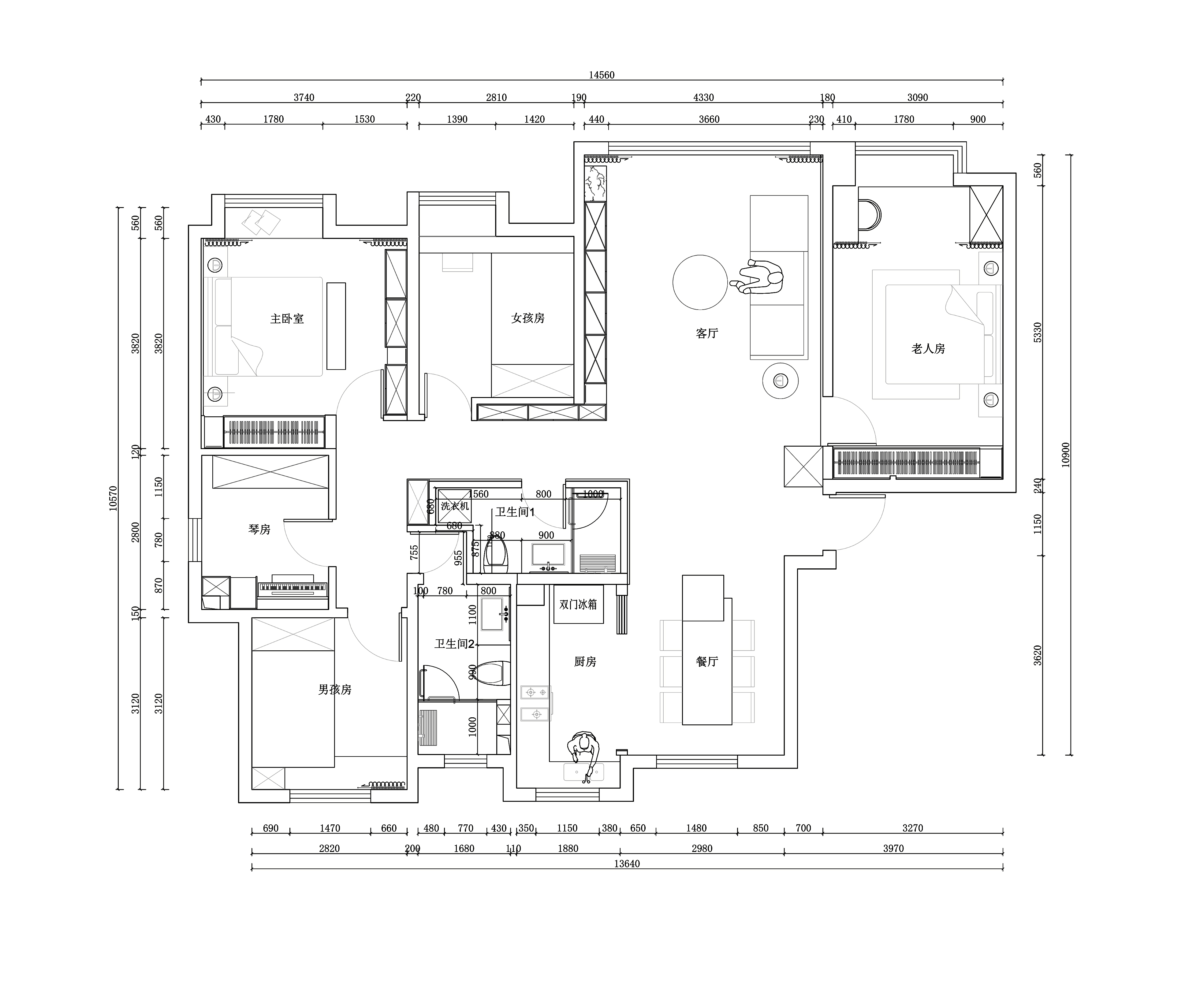 将原有走廊南移1.5米,使得餐厅长度得到放大,同时实现了入户有端景的仪式感,再把原有1.5米宽的走廊缩小至1.2米,成功得到了一个长3.3米宽1.7米的大公卫!将原主卫改造成集储物、琴房、客卧为一体的多功能房;利用西南角客卧室的超长进深,改造一个大型的生活阳台,解决晾晒问题!
