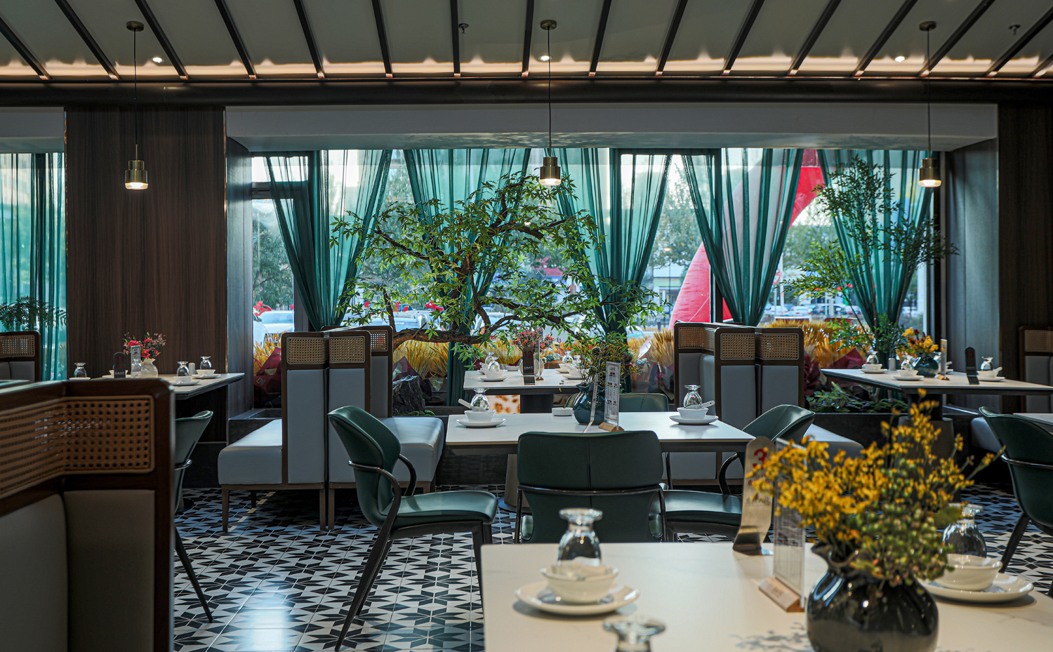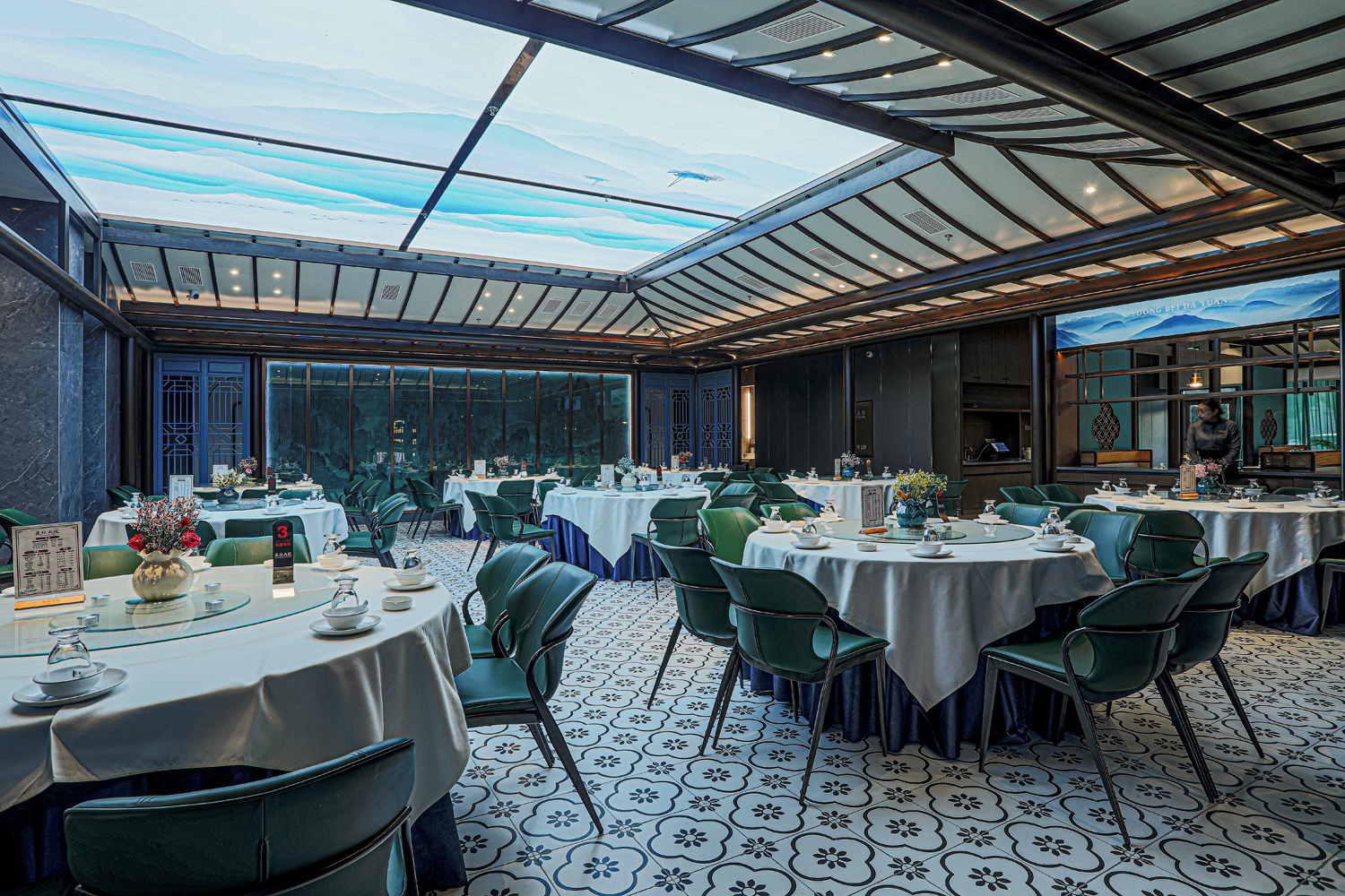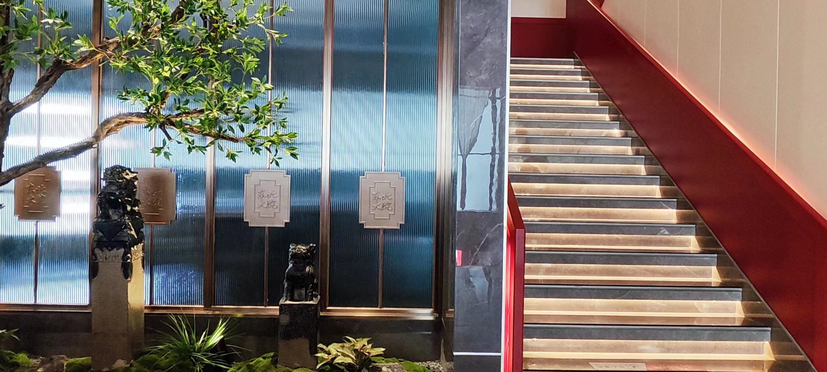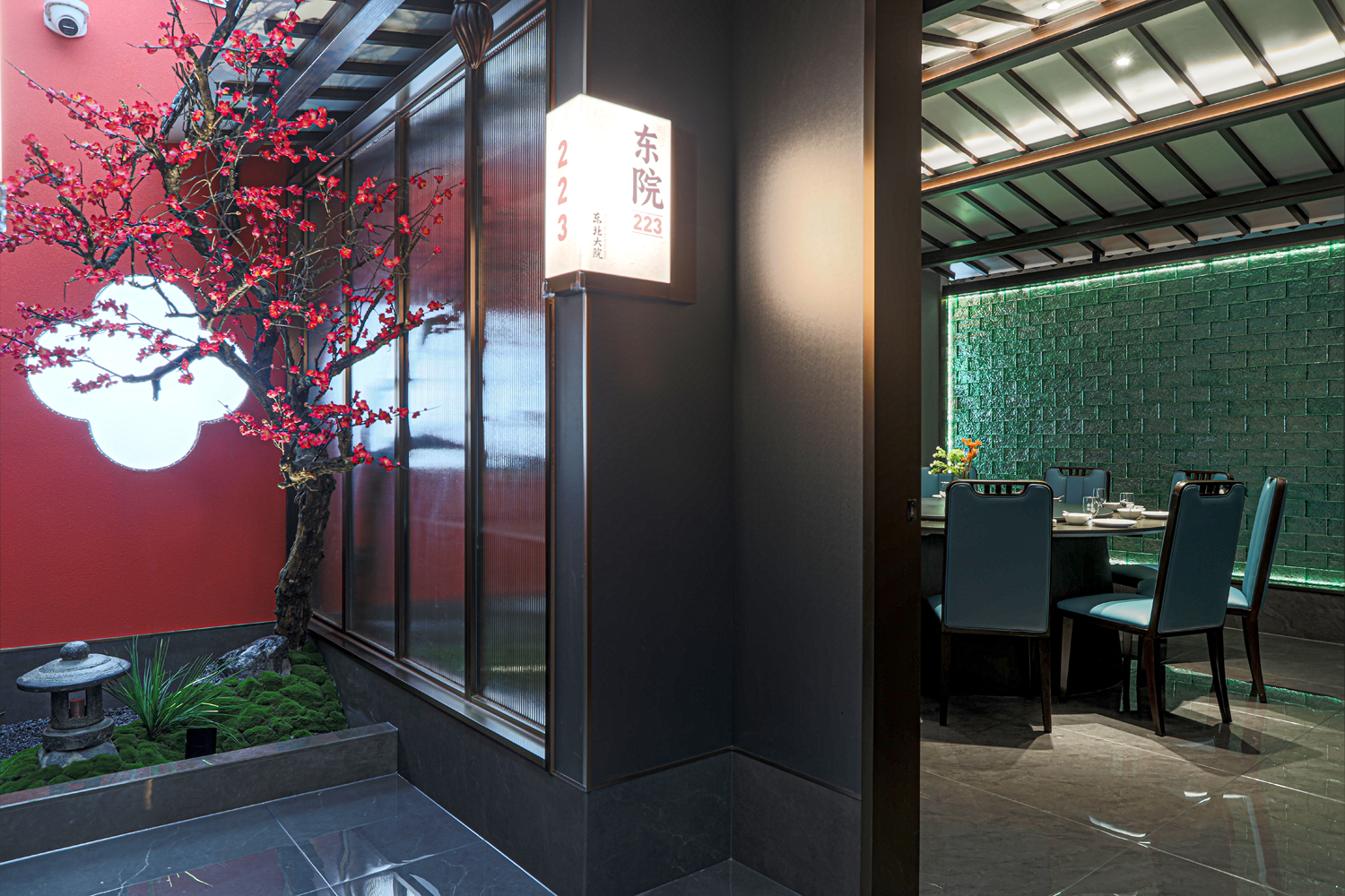 场景化空间表达中没有强烈的符号表达,而是以具有当代品质感的材料、简约的设计语言、意象化的色彩铺陈等形式来演绎具有当代“东北味”“喜庆”“欢聚一堂”的宴请调性空间。