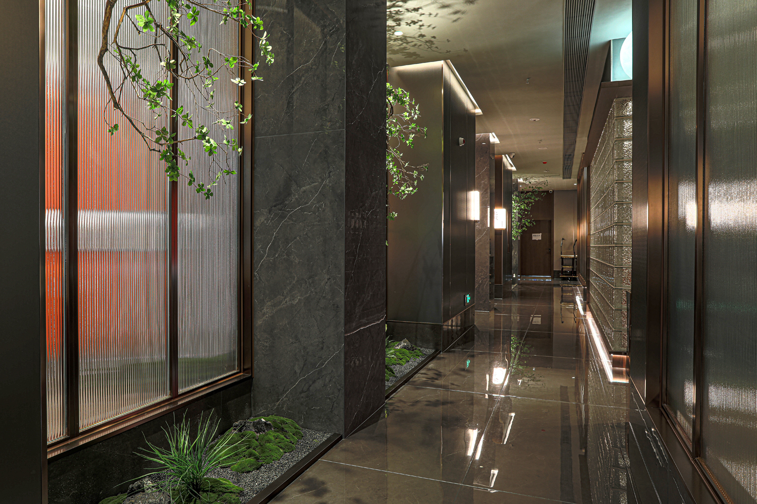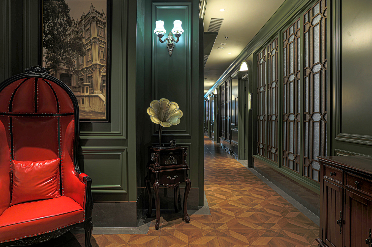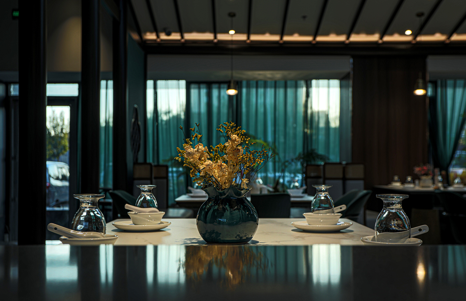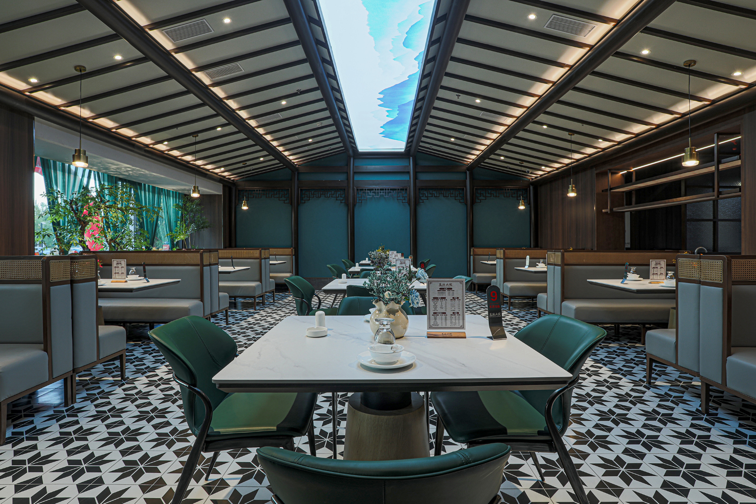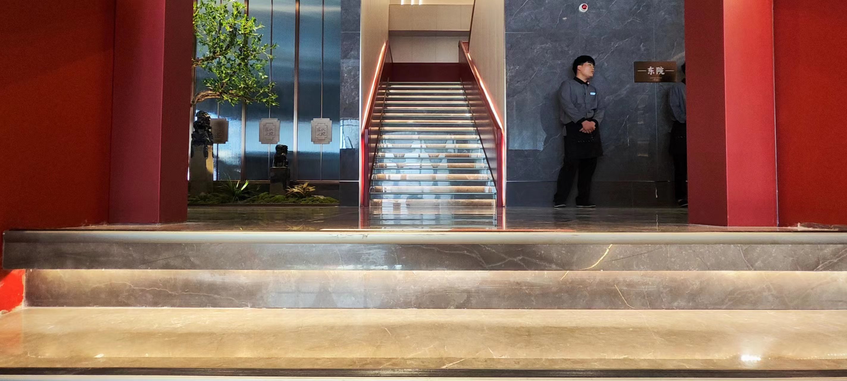 场景化空间表达中没有强烈的符号表达,而是以具有当代品质感的材料、简约的设计语言、意象化的色彩铺陈等形式来演绎具有当代“东北味”“喜庆”“欢聚一堂”的宴请调性空间。