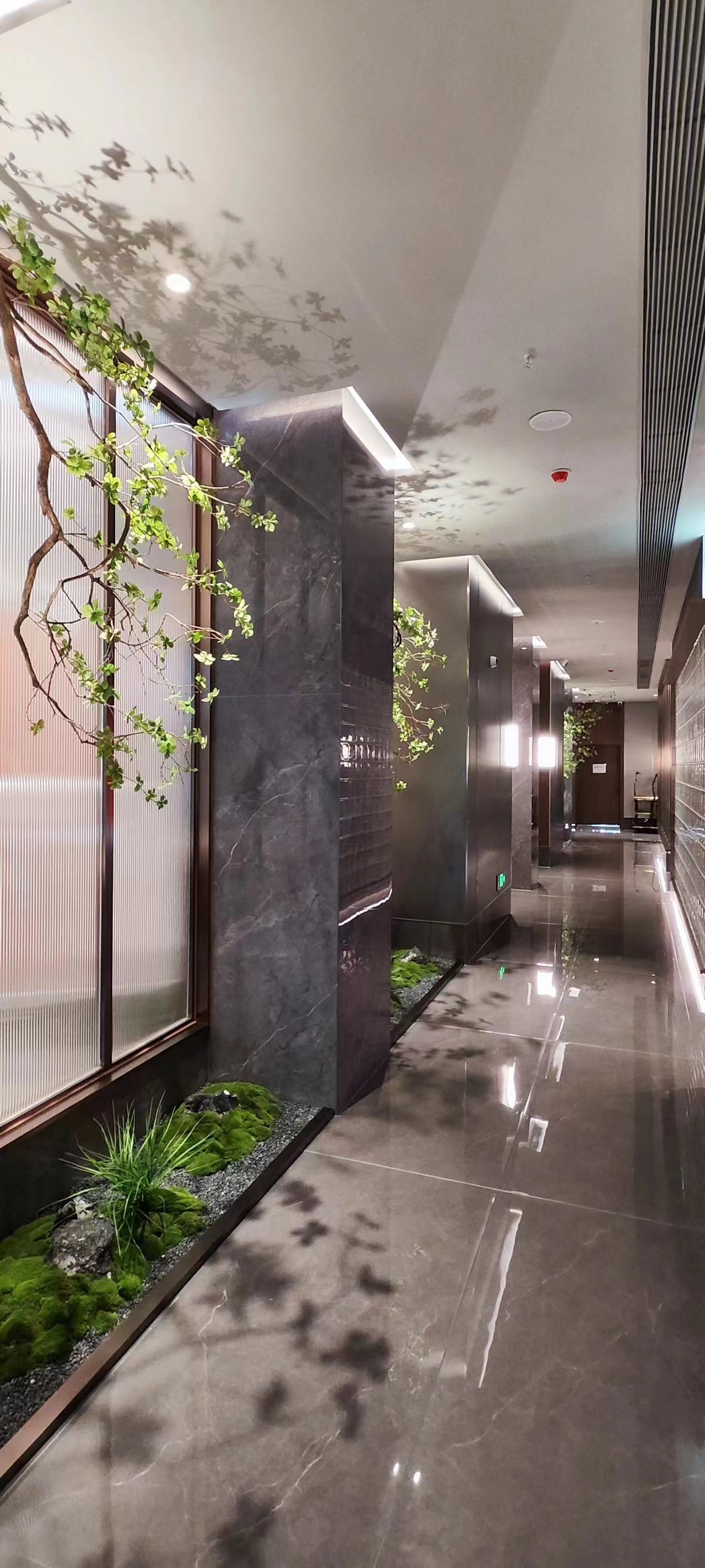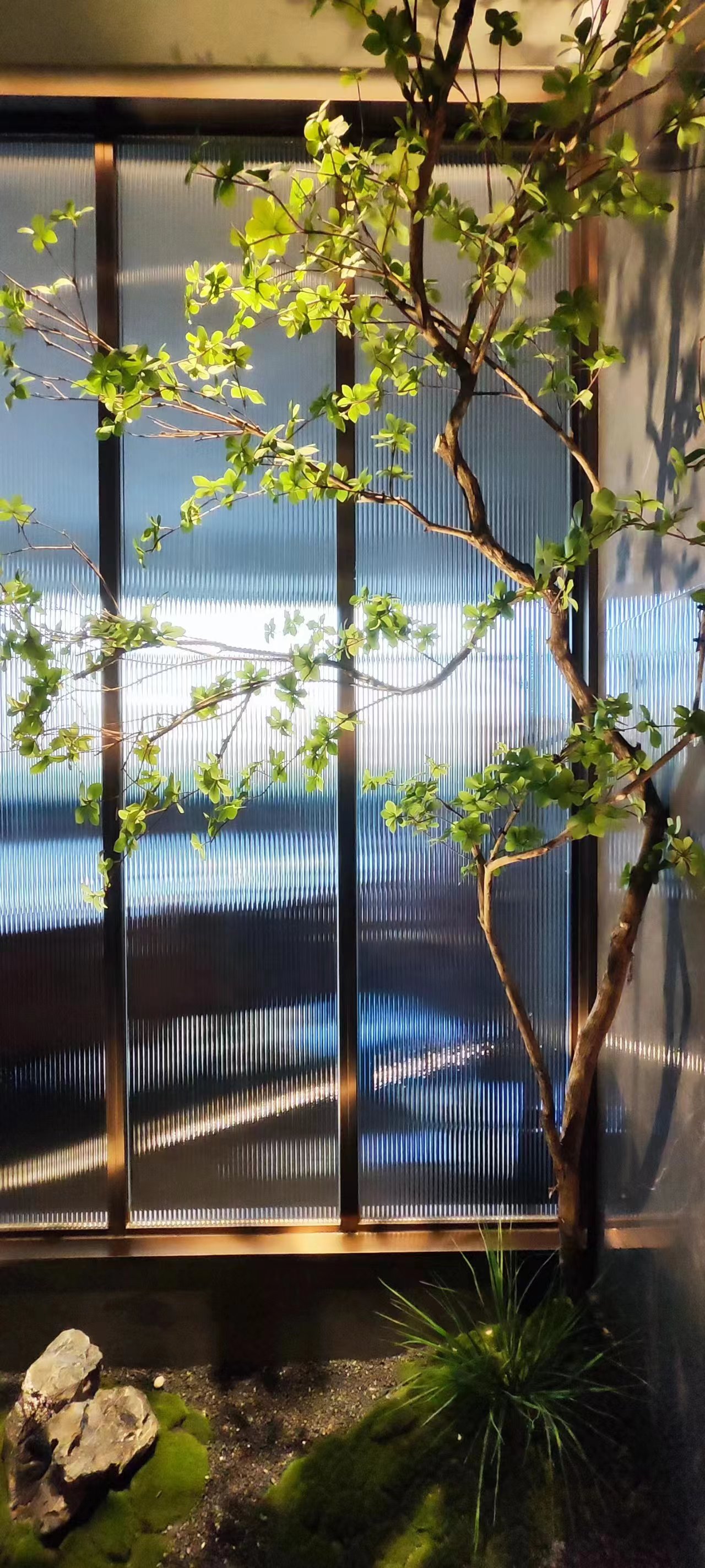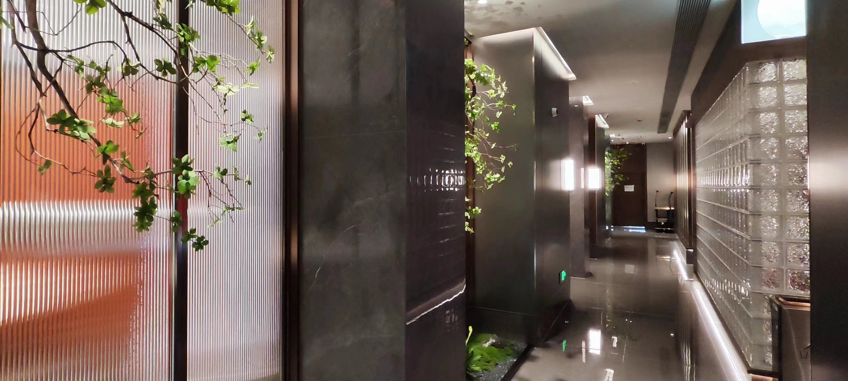 灰色岩板石材、不锈钢、竹木纤维板材、亚克力、长虹玻璃等