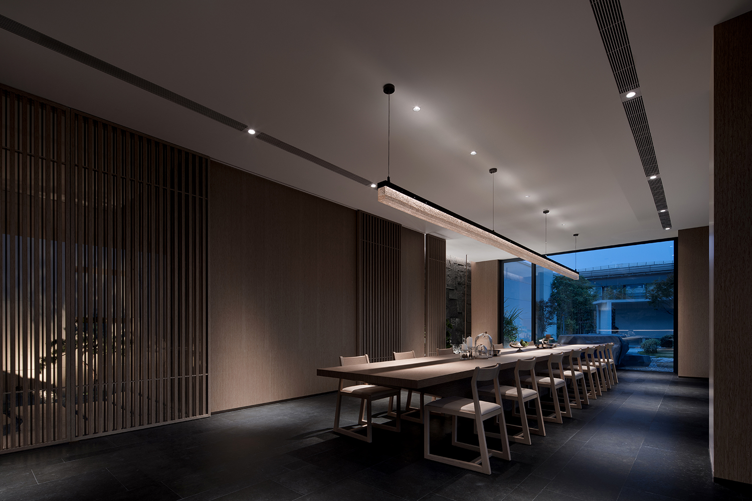 二十多米长的超级会客厅被设计成阶梯下沉的结构,配合同样尺度的全景玻璃幕墙窗,以俯瞰的姿态观山阅澜,我想在阅尽人生之后还能回归本心是一种境界。空间设计上的巧妙之处在于会客厅虽然有极具气度的长向尺度,但宽度因巨柱的位置限制而显得拘促。走廊的抬高以及通往会客厅的台阶,消解了柱子在空间中的存在,并且阶梯上嵌入的沙发扩大了会客厅的进深,同时营造了俯瞰的感受。
